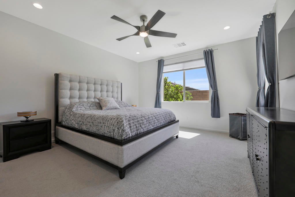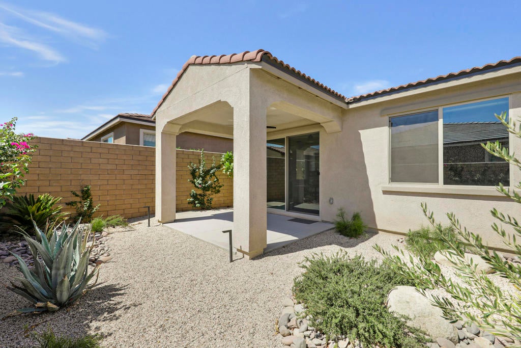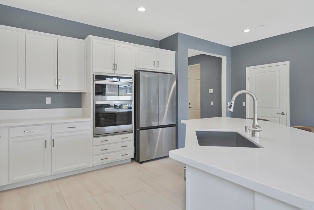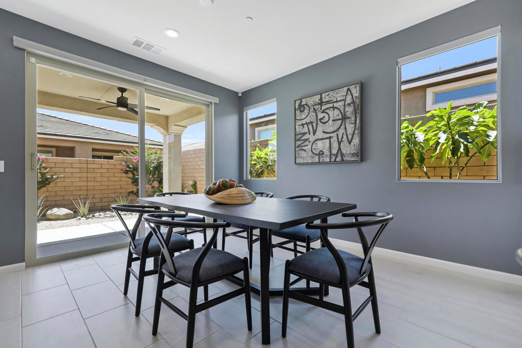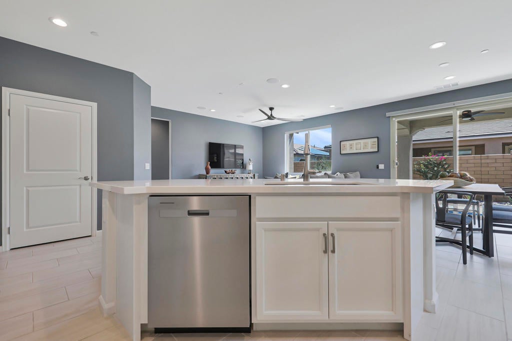 Innovative and Contemporary, this Comfortable Modern Design Features High Ceilings, Open Floor Plan, Light Porcelain Tile Floors, and Immaculate White Cabinetry and Countertops throughout. Gourmet Kitchen with Spacious Countertops, Upgraded Whirlpool Stainless Appliances, Island with Bar Seating and Pantry. Primary Bedroom with En-Suite Bath and Luxurious Oversized Walk-In Closet. Secondary Guest Room Privately Located away from Primary. This Popular Silver Creek Plan also features a Generous Sized Office which could easily be made into a Third Bedroom. Surround Sound and Motorized Shades in Great Room. Glass Sliders Open Great Room/Dining/Kitchen to Covered Patio--Perfect for Indoor Outdoor Entertaining with Family and Friends. Professionally Designed Backyard Landscape with Lighting and Irrigation. Owned Solar Panels. So many upgrades and Move-in Ready! Seize the Day and get into the Fun that this Community has to offer! Community Club House, Pool, Spa, Fitness, Pickle Ball and Bocce Court! Furnishings Negotiable outside of Escrow.
