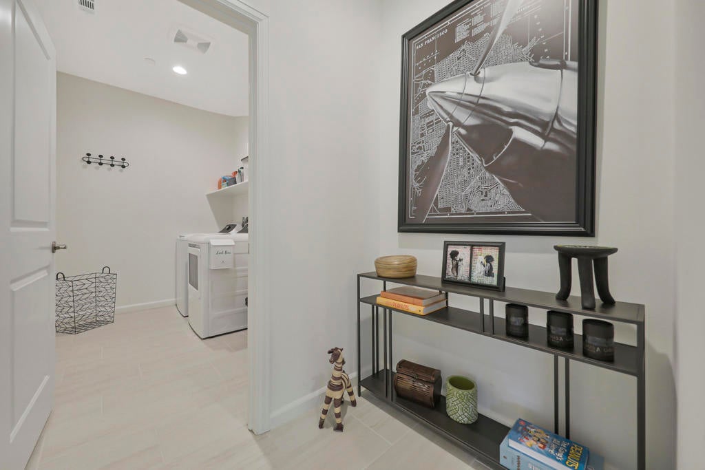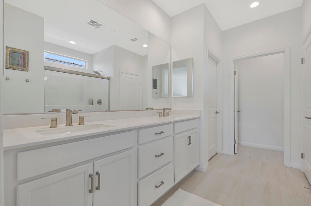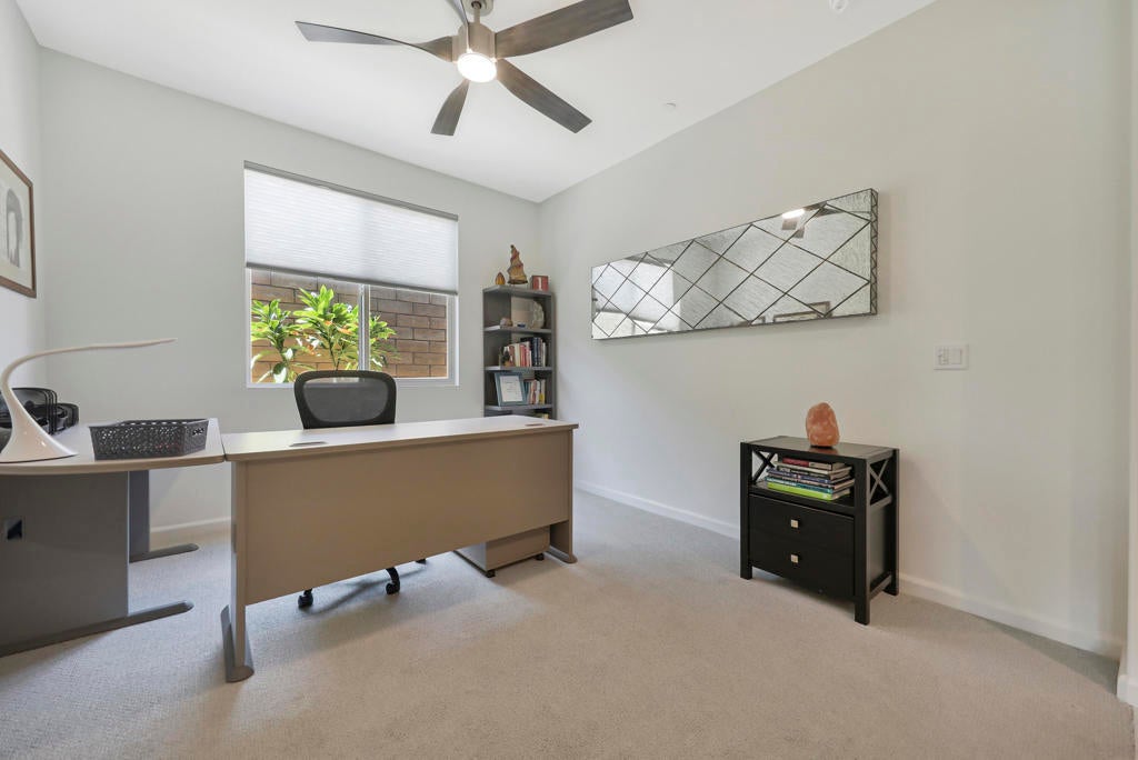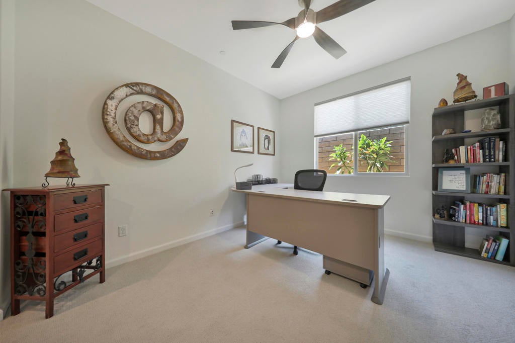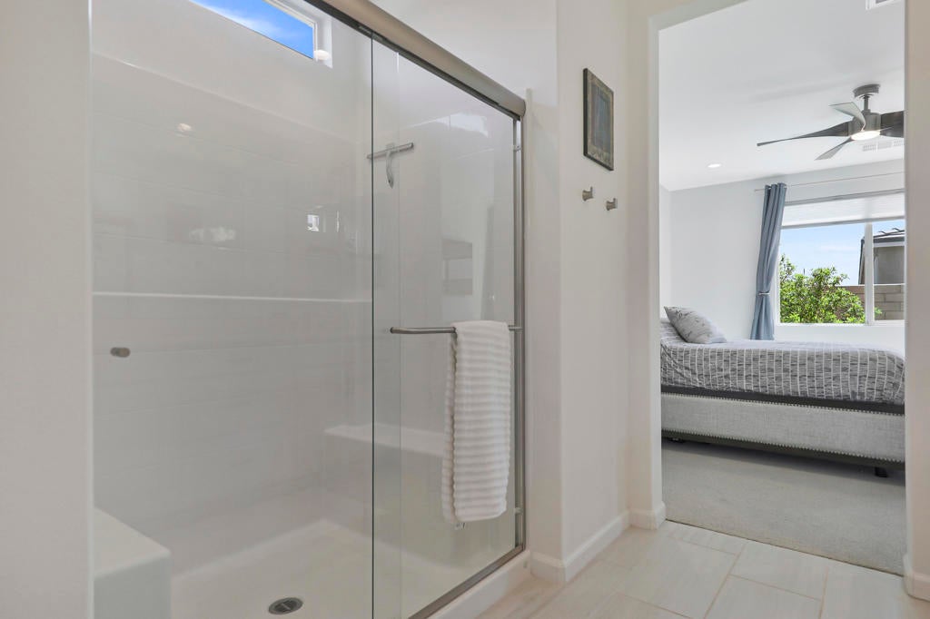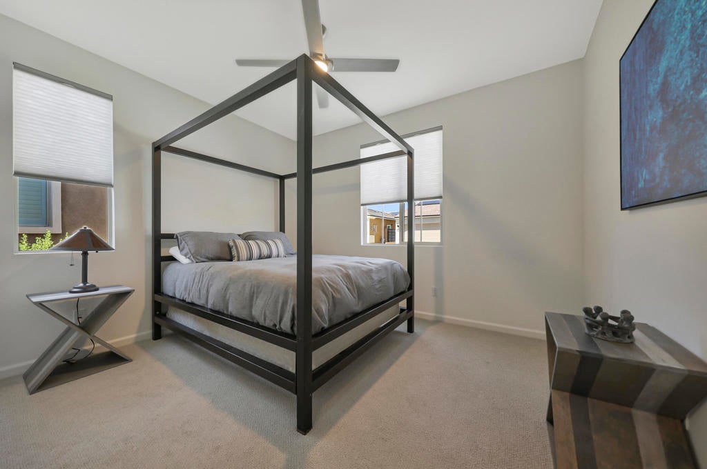 Innovative and Contemporary, this Comfortable Modern Design Features High Ceilings, Open Floor Plan, Light Porcelain Tile Floors, and Immaculate White Cabinetry and Countertops throughout. Gourmet Kitchen with Spacious Countertops, Upgraded Whirlpool Stainless Appliances, Island with Bar Seating and Pantry. Primary Bedroom with En-Suite Bath and Luxurious Oversized Walk-In Closet. Secondary Guest Room Privately Located away from Primary. This Popular Silver Creek Plan also features a Generous Sized Office which could easily be made into a Third Bedroom. Surround Sound and Motorized Shades in Great Room. Glass Sliders Open Great Room/Dining/Kitchen to Covered Patio--Perfect for Indoor Outdoor Entertaining with Family and Friends. Professionally Designed Backyard Landscape with Lighting and Irrigation. Owned Solar Panels. So many upgrades and Move-in Ready! Seize the Day and get into the Fun that this Community has to offer! Community Club House, Pool, Spa, Fitness, Pickle Ball and Bocce Court! Furnishings Negotiable outside of Escrow.