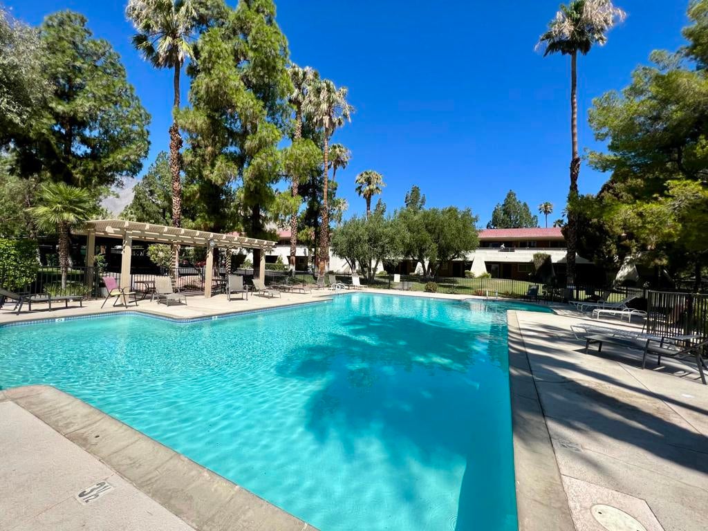 Experience the best view in Palm Springs Villas from this charming 1-bedroom, 1-bathroom condominium. Perfectly positioned, this home offers an unobstructed and truly breathtaking vista of the sparkling pool framed by majestic mountain backdrops--widely admired as one of the most beautiful outlooks in the community. Step inside to discover a thoughtfully updated retreat featuring plastered ceilings, fresh paint, and modern touches throughout. Stay comfortable year-round with a new AC Nest system and enjoy peace of mind with a built-in ADT security system. The upgraded bathroom adds convenience and style, while the dining area is elevated by a chic mirrored wall that reflects natural light. The cozy living room flows seamlessly to a covered balcony, where you can relax and soak in those stunning mountain and pool views--just a quick step down offers immediate pool access for ultimate ease. From its prime second-floor location, this unit captures a-perspective that feels both private and inspiring. Practical perks include covered parking and access to resort-style amenities such as swimming pools, spas, and tennis courts. Ideally situated near the Palm Springs Visitors Center, Aerial Tramway, Marilyn Monroe statue, and Palm Springs Art Museum, this is the perfect combination of comfort, style, and location. Don't miss the opportunity to make this spectacular view condo your own oasis in Palm Springs!