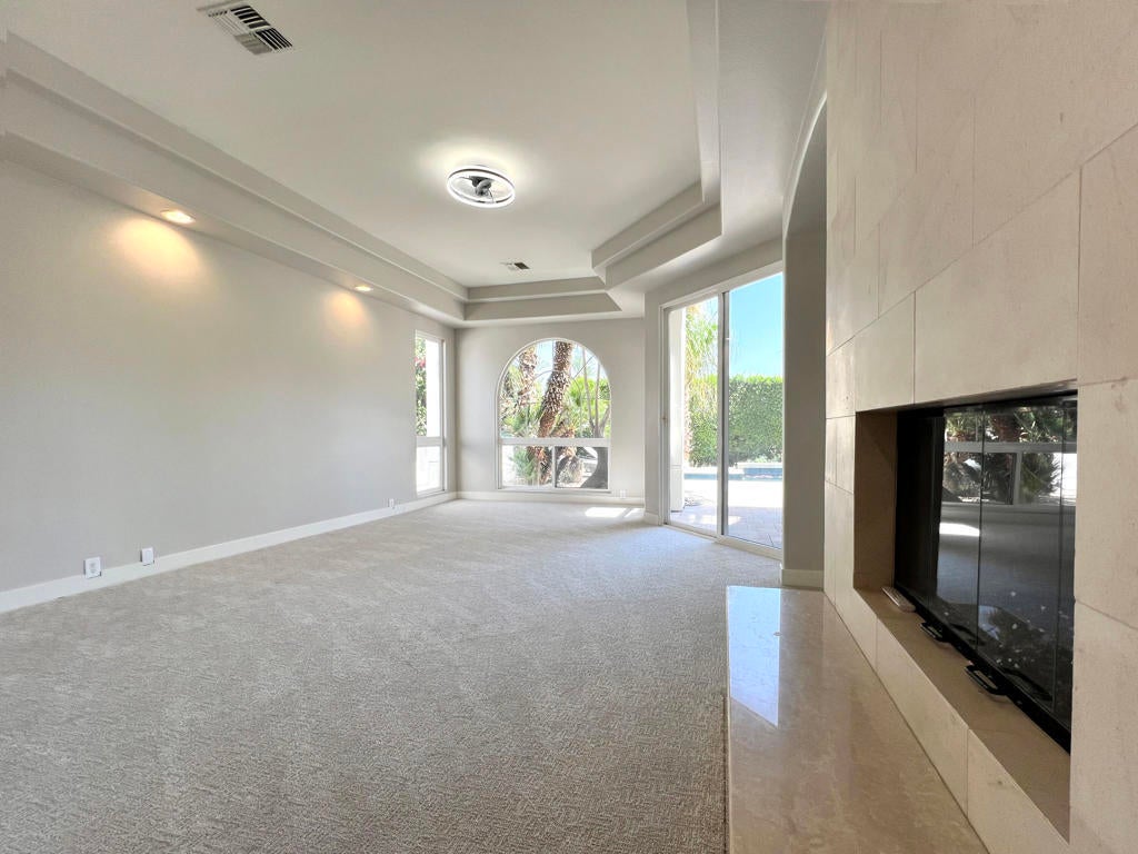 Nestled within prestigious Rancho La Quinta Country Club. Gorgeous modern renovated home with stunning views of the colorful hues of the panoramic Chocolate Mountains & the 9th. fairway of the Robert Trent Jones Jr. Championship Golf Course. Ideally situated on a private cul-de-sac & close to the Club House & all of the amenities. The large backyard entertainer's covered patio features quality stone pavers, custom pool with elevated spa, waterfall & a large built-in BBQ cooking station. This high end PALACIO II mini-estate consists of 4 bedroom, 4.5 baths. A deluxe detached guest house with a romantic fireplace & kitchenette offers guests privacy & comfort. Upon entering the charming courtyard you will be greeted by hand-laid paving stones. Enter the beautiful custom wood glass dual doors and you will be impressed with the craftsmanship & attention to detail. This home has been almost completely retrofitted from top to bottom & has been re-envisioned & modified by removing the wall that separates the kitchen, family room-living room resulting in an amazing open floor plan concept that creates spaciousness with multiple entertainment venues. Features boast updated limestone flooring & plush upgraded carpeting in bedrooms-all bedrooms are ensuite. Modern interior paint colors & modern ceiling fans enhance the ambiance, LED lighting throughout. The newly updated gourmet kitchen is a culinary delight with custom finished cabinetry, Quartz surfaces & beautifully designed contemporary backsplash & top of the line stainless steel appliances. Entertain in style from the step-down wet bar complete with the same luxurious features of the kitchen.The elegant formal dining room with its newly installed modern electric fireplace provides a warm & cozy atmosphere for entertaining. The primary bathroom suite offers Quartz counter tops. a redesigned soaking tub & updated walk-in shower with frameless shower doors. The lavish primary suite with a romantic fireplace opens directly to the pool & spa & offers stunning views of the golf course. HOA dues of $1,198 per month include social membership, use of club house, two other dining facilities, 8 pickleball courts, 9 tennis courts, bocce ball, fitness center, 24 hr. roving security, direct TV, internet, front landscaping & trash. Note: some images have been virtually staged to better showcase the true potential of rooms & spaces. This is resort living at its finest in prestigious Rancho La Quinta Country Club.
