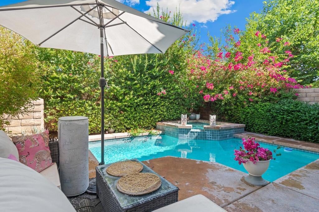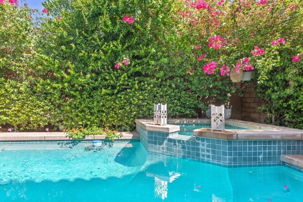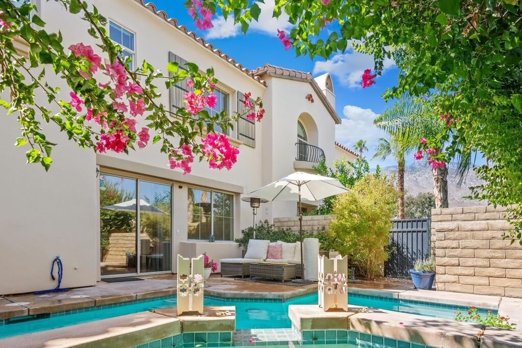 Truly stunning 3 bed, 3 bath condo with private in-ground pool and spa! This home features soaring ceilings, hard wood and tile floors, recessed lights, and gorgeous mountain views. Enter into the great room where the living room, dining area, and kitchen come together, perfect for hosting with a slider to the backyard retreat and open concept floor plan - great for indoor/outdoor entertaining! The kitchen offers granite counters, wood cabinetry and stainless steel appliances including the refrigerator, gas range, microwave, and dishwasher. A bedroom, a bathroom with walk-in shower, and a large laundry room with included washer and dryer complete the main floor. This delightful home features 2 primary suites, both on the 2nd floor. The larger primary suite has a walk-in closet and the ensuite features dual sinks and a walk-in shower. The 2nd primary also has a private bathroom with tub/shower combo. Enjoy the gorgeous backyard with lush landscaping framing the in-ground private pool and spa and space for your own loungers or patio set! This home also has an attached 2-car garage with direct access to the home, and an additional guest space. Residents also get to enjoy a greenbelt area, 2 community pools and spas, as well as lots of privacy with gated access! Conveniently located just a minute from Downtown Palm Springs and the Spa and Casino, as well as shopping, dining, golf courses, and more!
