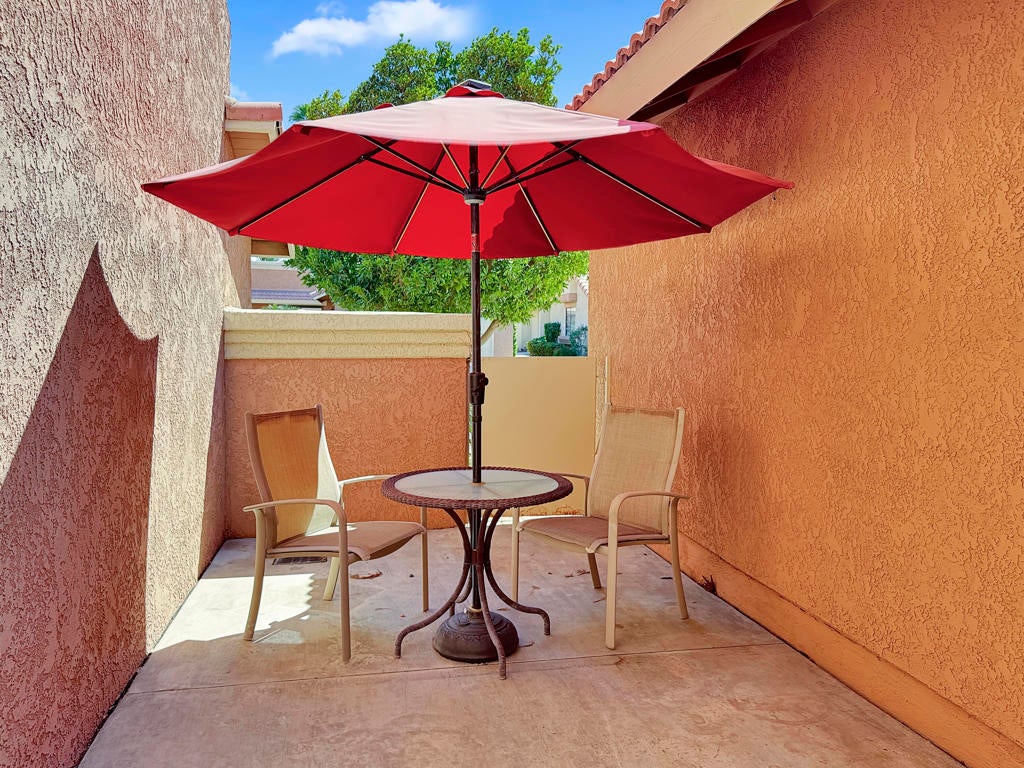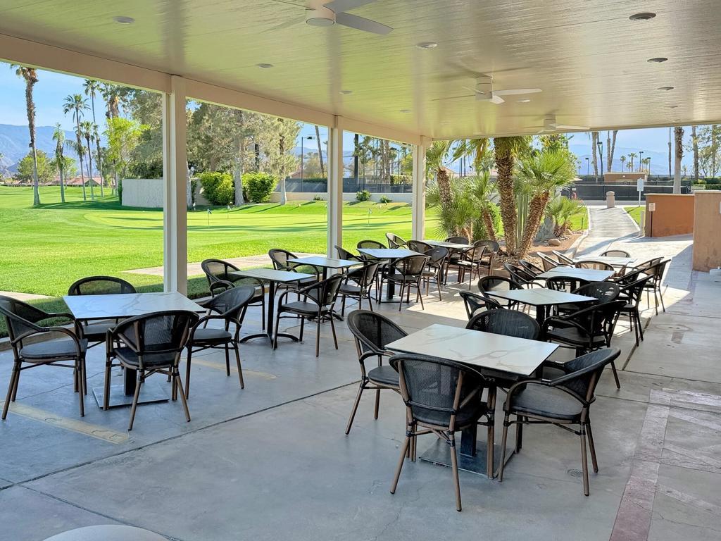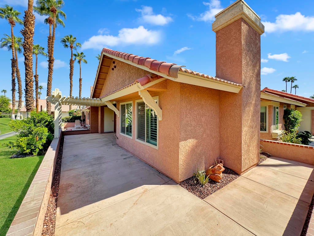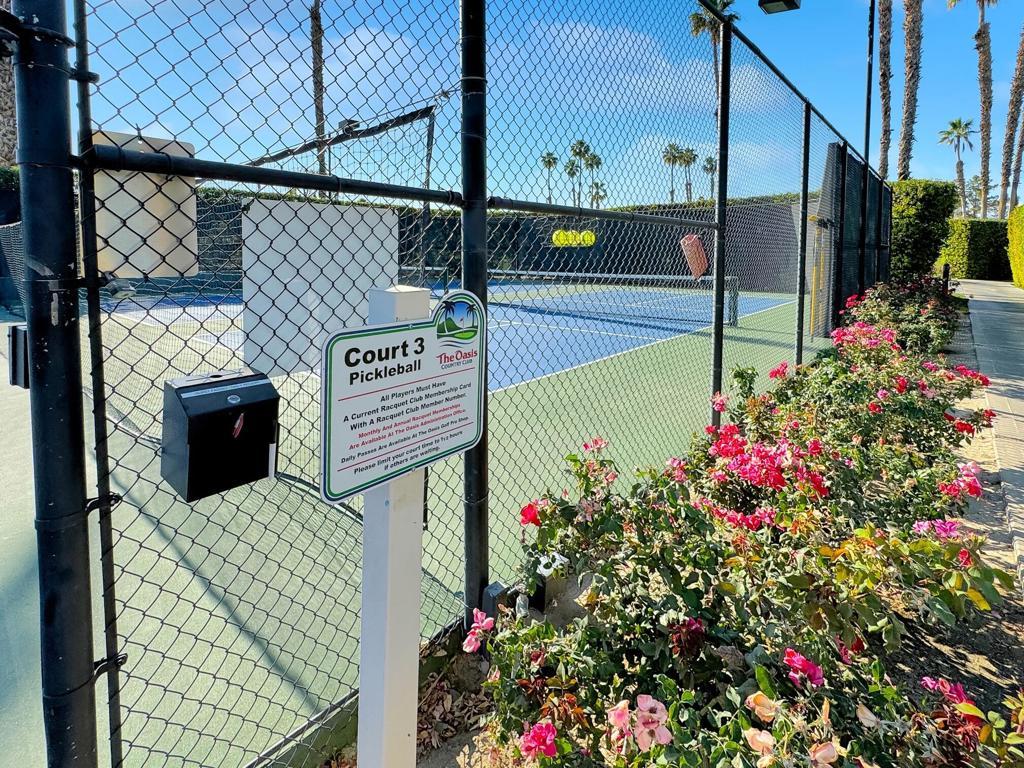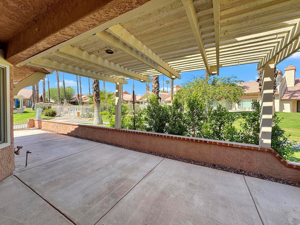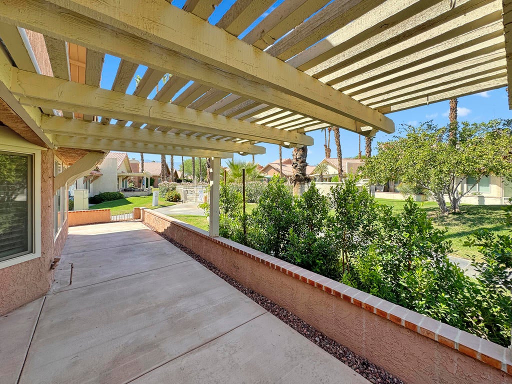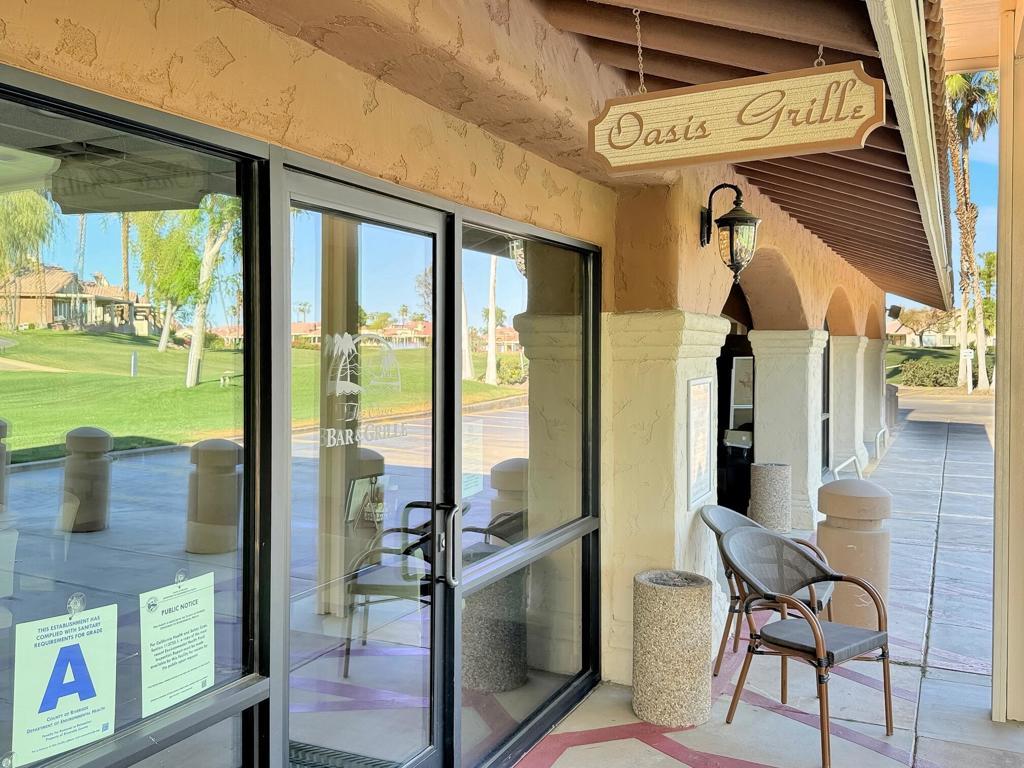 Spacious Oasis Country Club Home with wrap-around patio. Welcome to this light-filled single-level home in the sought-after Oasis Country Club! This rare property is attached on only one side, giving it a true sense of privacy. The massive living room is the heart of the home, featuring vaulted ceilings, a cozy fireplace, and an open-concept layout that seamlessly connects the dining area, breakfast bar, and kitchen. The kitchen is bright and airy with abundant counter space and cabinetry, perfect for cooking and entertaining. Offering three bedrooms (or two bedrooms plus a den/office), the flexible floor plan works for many lifestyles. The primary suite includes a private patio, en-suite bathroom, and generous closet space. The secondary bedroom boasts vaulted ceilings and direct access to the hall bath, while the third room is ideal as a guest space, office, or hobby room.Enjoy desert living at its finest on the expansive wrap-around covered patio, perfect for year-round outdoor dining, BBQs, and gatherings. A greenbelt and mature lemon tree sit just beyond your patio, providing a peaceful view. Additional highlights include newer dual-pane windows, a recently upgraded air conditioning system, and a newer hot water heater. Ceramic tile flooring runs through most of the home, creating a clean, low-maintenance look.Just steps from your door, you'll find one of the community's sparkling pools and spas. The Oasis Country Club offers a private 18-hole golf course, multiple pools and spas, tennis and pickleball courts, and even a putting course - all within a gated, beautifully landscaped community. Come see why so many love calling Oasis Country Club home!