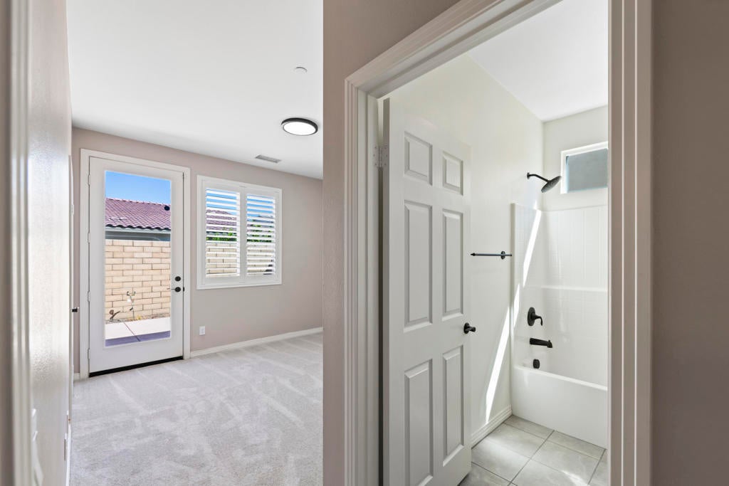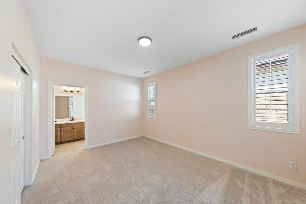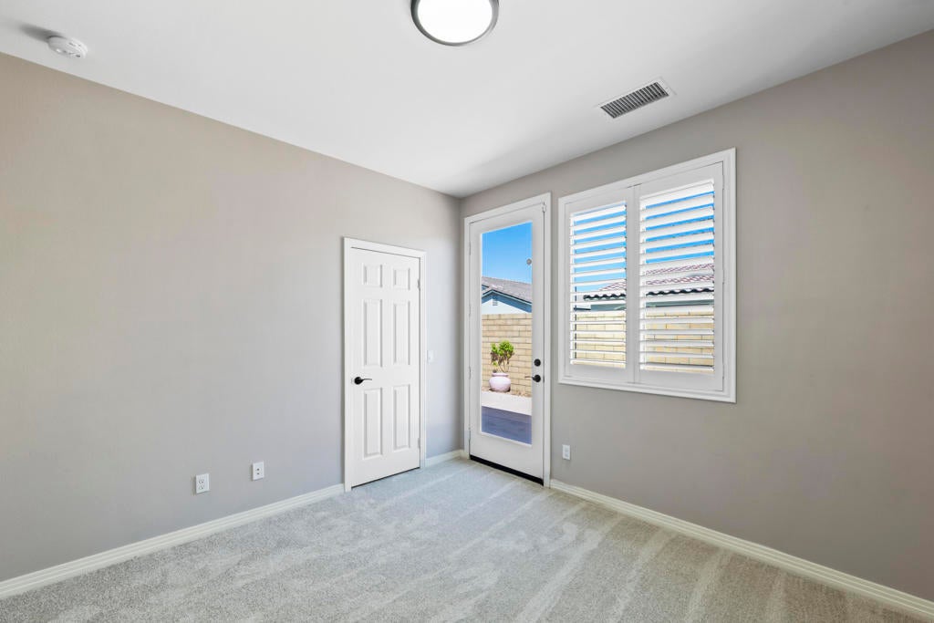 Welcome home to this beautiful residence in Domani, a well-maintained 55+ community with low HOA dues. The open-concept layout features a spacious kitchen with a central island that seamlessly connects to the main living area--perfect for family gatherings and entertaining. This home offers three generously sized bedrooms, each with sliding glass doors/door that open to two spacious patios, ideal for enjoying your morning coffee. Other highlights include 3.5 luxurious bathrooms, custom shutters throughout, brand-new carpet, tinted all-glass sliding doors, a separate laundry room, and a private courtyard patio equipped with electric awnings for year-round comfort. Home is ready for occupancy. Enjoy a desert resort lifestyle with the community pool, spa, and bocce ball court located steps away.