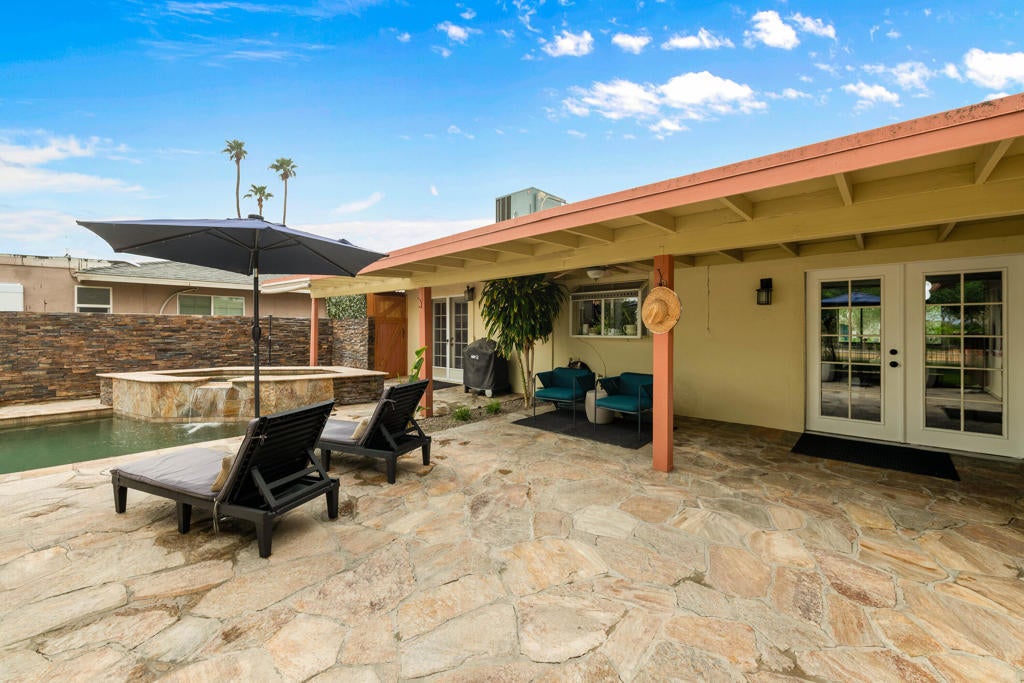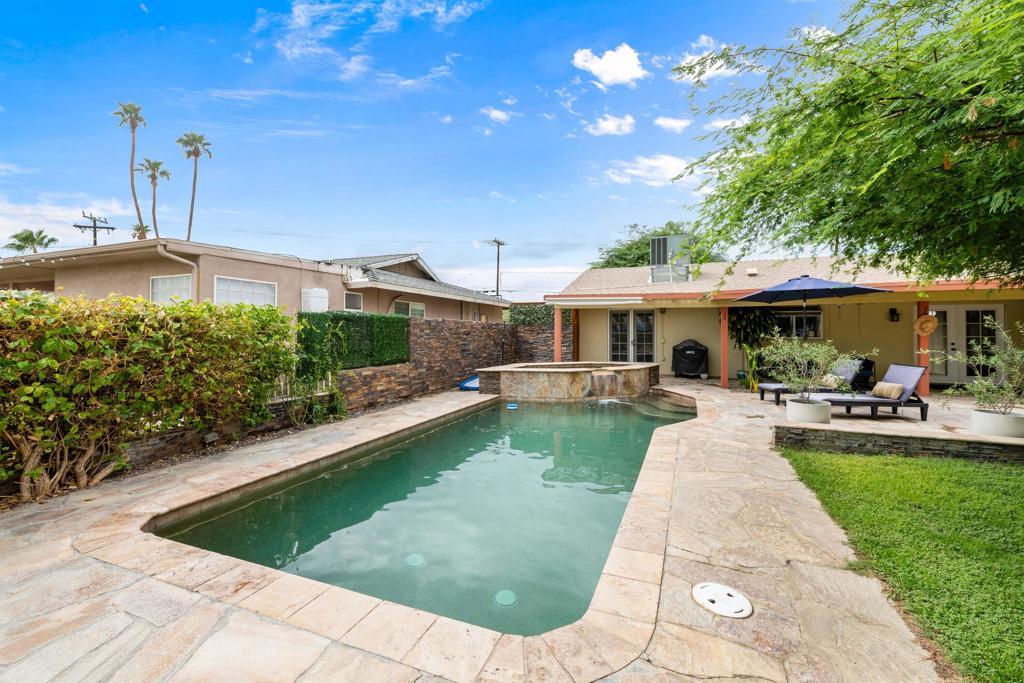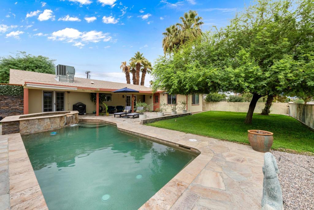 Great price on this gorgeous newly renovated golf course view pool home with Casita in Palm Desert Country Club! Beautiful Pebbletec Pool with a raised Waterfall Spa! Large backyard with view of Fairway #1! The permitted Detached Casita is the third bedroom and bath (248 sq. ft.). The main house is 2+2 and has a newly remodeled kitchen with new countertops, backsplash, white cabinets, and stainless-steel appliances! New flooring with baseboards throughout! Bathrooms are upgraded. Smooth ceilings and newer HVAC duct work. Covered stone patio. Jetted spa tub in one bath. Newer dual pane windows in primary and living room. There is a separate laundry/hobby room with lots of storage adjacent to the garage - with extra storage space. Newer composition roof and professional landscaping. PDCC provides lots of activities for only $33/mo. This is a must see, must have home!