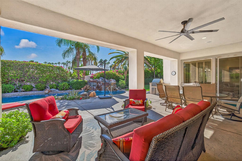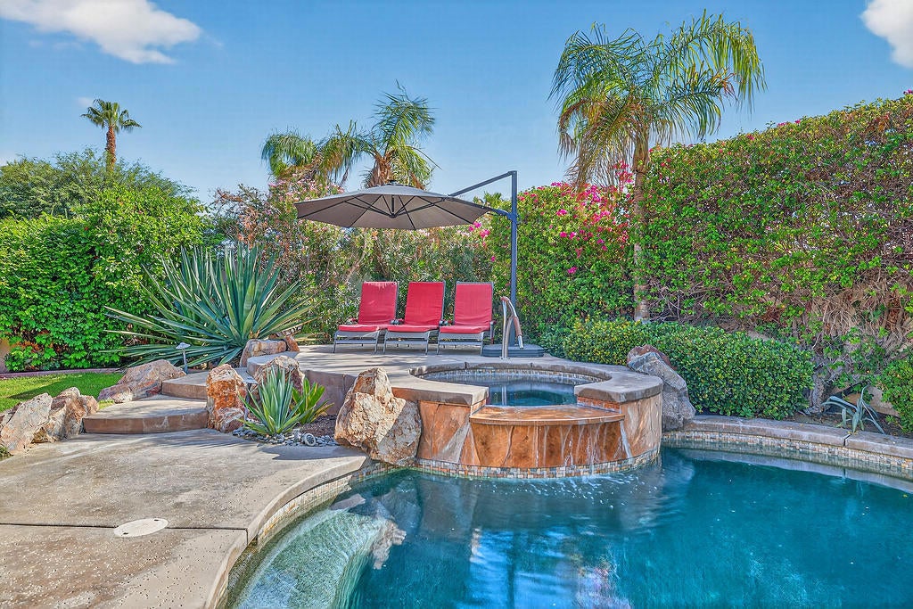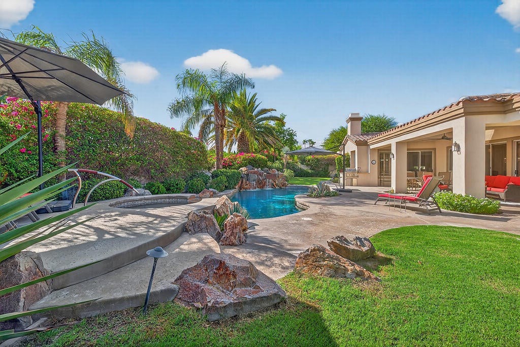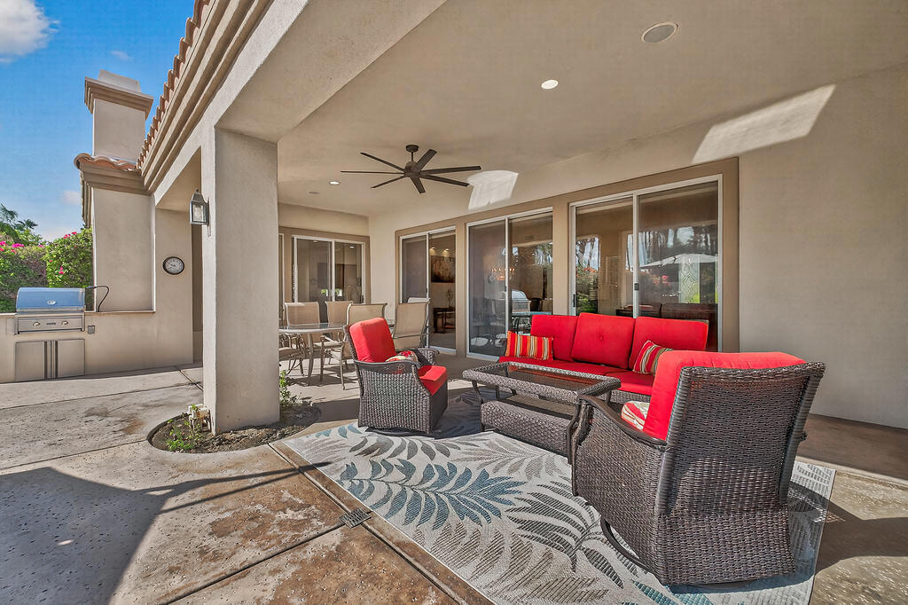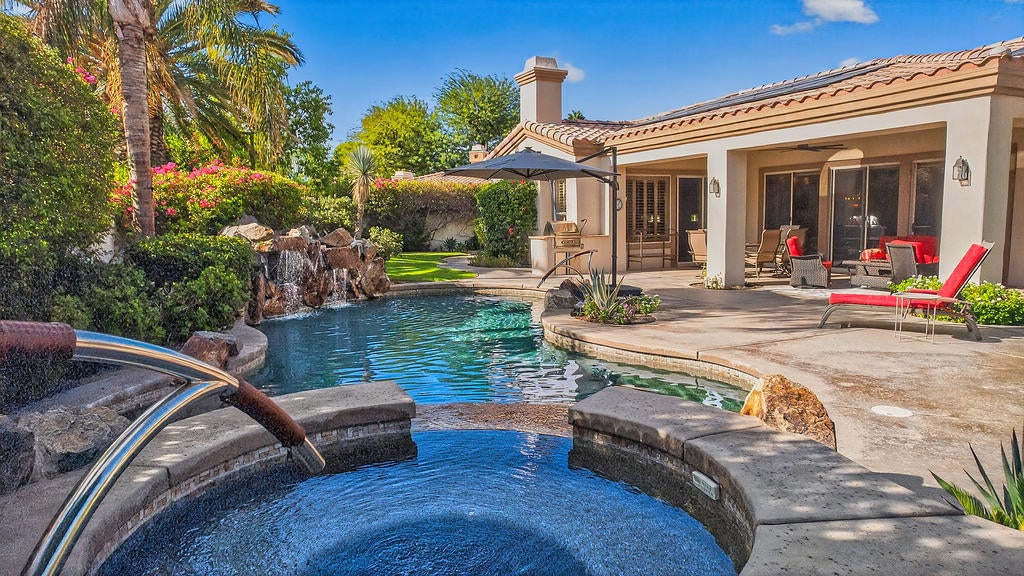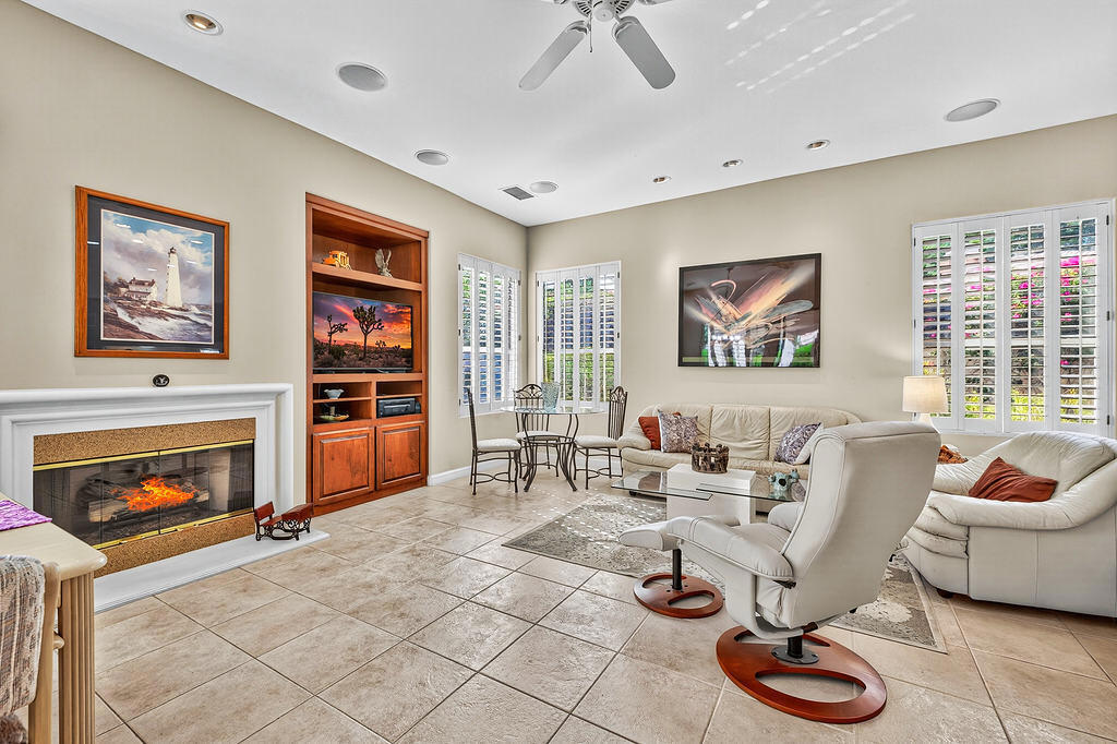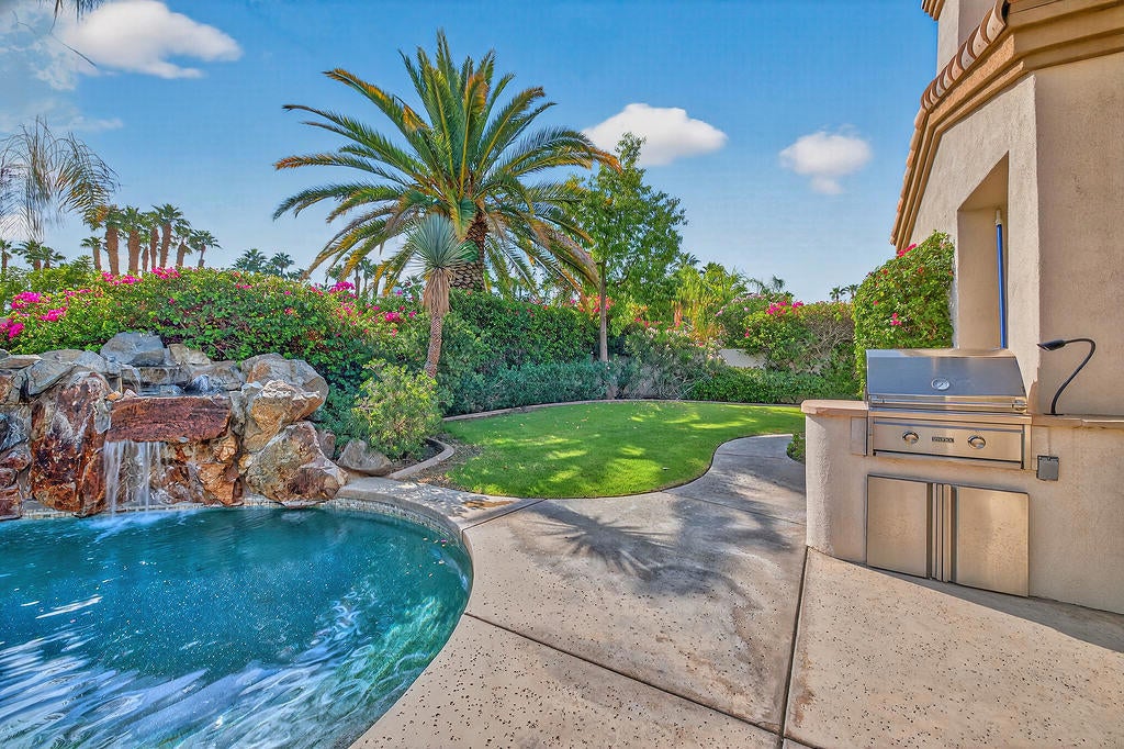 Welcome to 4 Milano Circle, a beautifully appointed 4-bedroom, 2.5-bath residence offering the perfect blend of luxury, comfort, and convenience in the heart of Palm Desert. This spacious home features multiple living areas, including a formal living room with a fireplace and big-screen TV, a cozy family room with built-ins and an additional fireplace, plus an elegant dining area illuminated by natural light. The gourmet kitchen is a chef's delight with granite counters, rich cabinetry, built-in appliances, a center island, and every amenity for preparing meals and entertaining guests. Each bedroom is comfortably furnished with quality linens and its own TV, providing a true turnkey experience.Step outside to a resort-style backyard designed for relaxation and entertaining. Enjoy a lagoon-style pool and spa with dramatic rock waterfalls, surrounded by lush landscaping for total privacy. Multiple seating areas, a built-in BBQ, a covered patio with ceiling fans, and a third fireplace make this the ideal retreat for sunny days and cool desert evenings.Located minutes from El Paseo's world-class shopping and dining, Acrisure Arena, McCallum Theatre, Indian Wells Tennis Garden, and family entertainment at Dave & Buster's, this home offers easy access to the best of the Coachella Valley. Flexible lease terms available. High-season tenants welcome. Whether you're here for golf, tennis, festivals, or simply to unwind, 4 Milano Circle delivers the ultimate desert lifestyle.