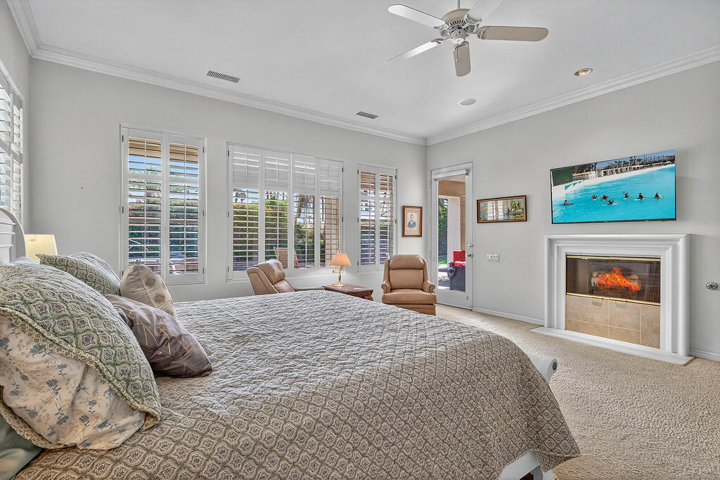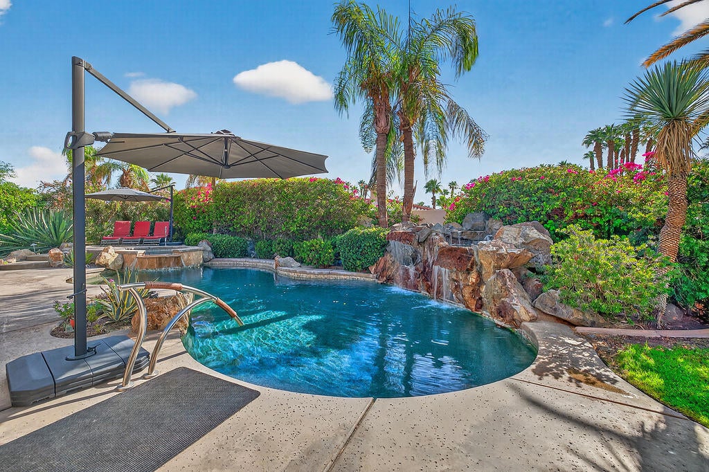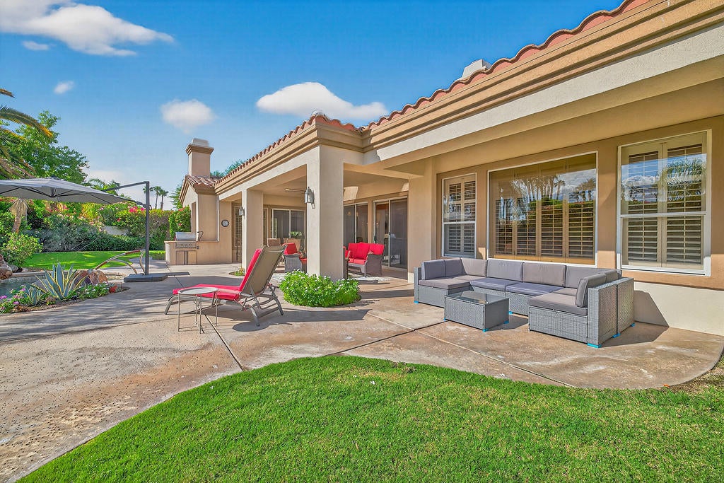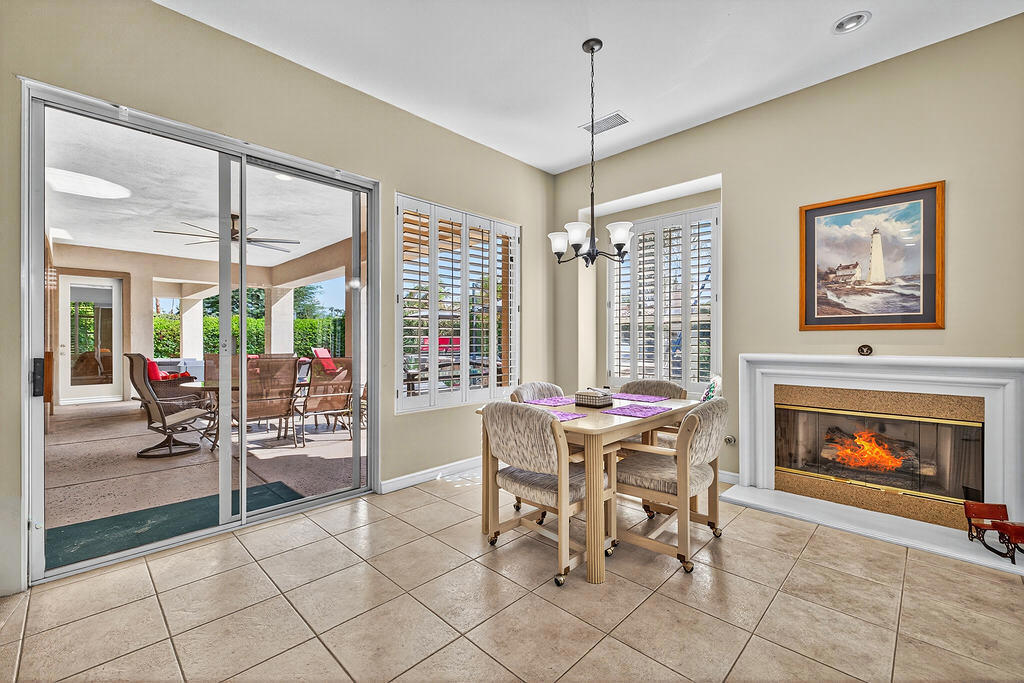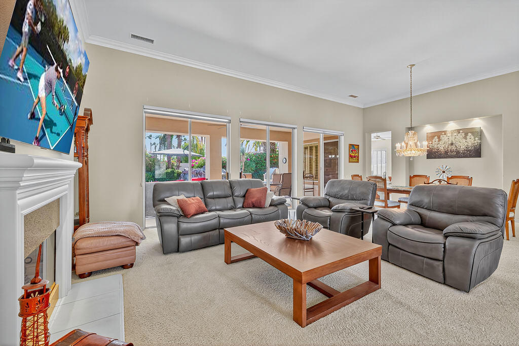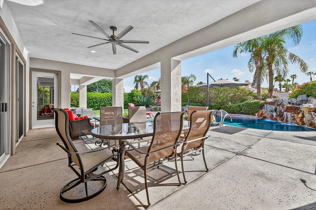 Welcome to 4 Milano Circle, a beautifully appointed 4-bedroom, 2.5-bath residence offering the perfect blend of luxury, comfort, and convenience in the heart of Palm Desert. This spacious home features multiple living areas, including a formal living room with a fireplace and big-screen TV, a cozy family room with built-ins and an additional fireplace, plus an elegant dining area illuminated by natural light. The gourmet kitchen is a chef's delight with granite counters, rich cabinetry, built-in appliances, a center island, and every amenity for preparing meals and entertaining guests. Each bedroom is comfortably furnished with quality linens and its own TV, providing a true turnkey experience.Step outside to a resort-style backyard designed for relaxation and entertaining. Enjoy a lagoon-style pool and spa with dramatic rock waterfalls, surrounded by lush landscaping for total privacy. Multiple seating areas, a built-in BBQ, a covered patio with ceiling fans, and a third fireplace make this the ideal retreat for sunny days and cool desert evenings.Located minutes from El Paseo's world-class shopping and dining, Acrisure Arena, McCallum Theatre, Indian Wells Tennis Garden, and family entertainment at Dave & Buster's, this home offers easy access to the best of the Coachella Valley. Flexible lease terms available. High-season tenants welcome. Whether you're here for golf, tennis, festivals, or simply to unwind, 4 Milano Circle delivers the ultimate desert lifestyle.