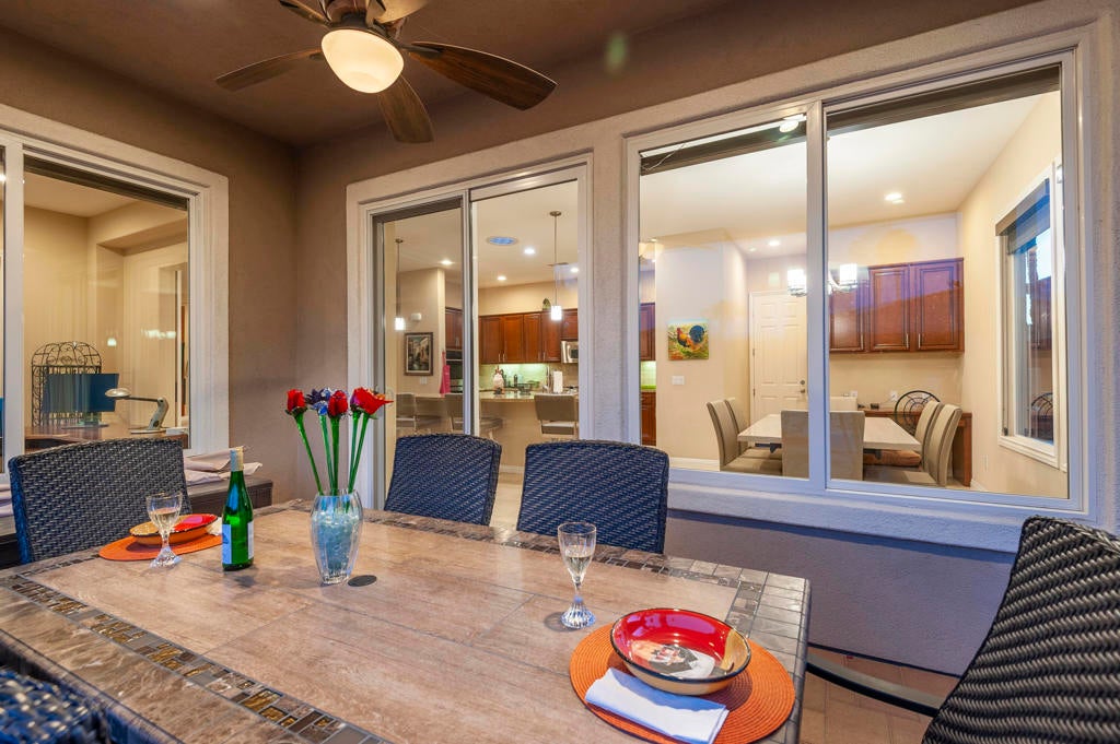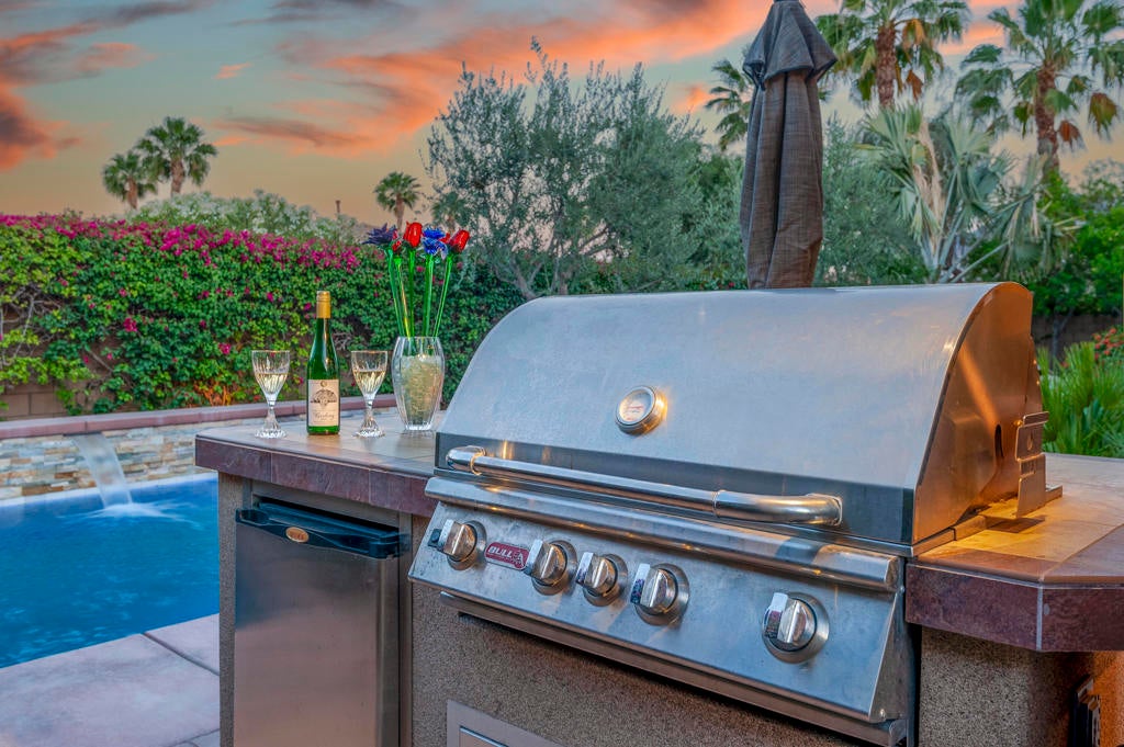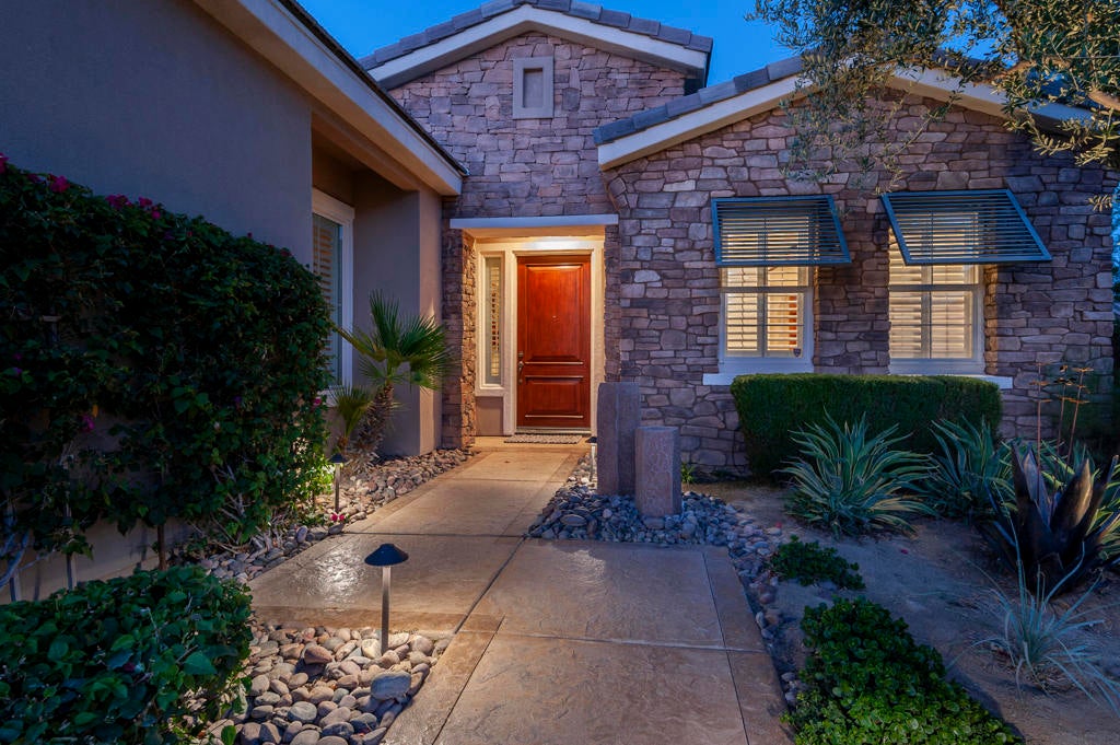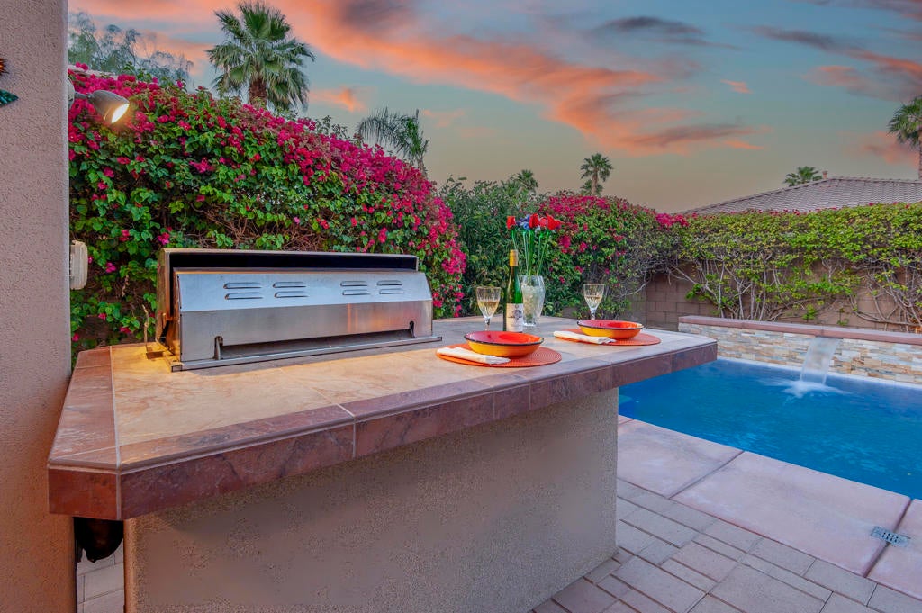 A Sweet Deal! Priced to sell, this masterfully designed Tamarisk 2,445 SQFT luxury pool features two bedrooms and a den or third bedroom, with three-bathrooms. The home is brilliantly updated inside and out, with everything you could want or need in a luxury desert resort home. Open, bright and spacious, with room to roam. Quality features include, ten-foot ceilings, tile floors, custom shutters and window-coverings, breezy ceiling fans, motorized/Wi-Fi Solar Shades, and quality HVAC system. A whole home Pelican water filtration system runs clean water through every tap and shower in the home. The great room is spacious with a built-in media center and an elegant stone gas-log fireplace to curl up by while binge-watching favorite shows. Outdoors, you'll love to play, swim and relax in your private recently built salt-water pool with infinity spa, and golden stack stone wall with cascading fan spillways. The yard is beautifully landscaped and maintained. Cook your favorite foods at the BBQ station. Multiple covered patios areas with ceiling fans and Cool Fog misting system make outdoor living comfortable even during warm days. After a day of fun, unwind with your favorite beverage fireside under moonlit and starry skies. The Gourmet Kitchen is extraordinary in its size and quality. Professional grade stainless appliances include, a double-oven, subzero refrigerator, six-burner cooktop, and range hood, and dishwasher. An abundance of cabinets with pull-outs keeps all your kitchenware organized and stored for easy access. Designed for beauty as well as function, the travertine backsplash and exquisite countertop of creme slab granite is clean and elegant. For casual dining and entertaining, the large island with beverage cooler offers plenty of room for casual dining. When serving up meals for special occasions the formal dining room with its large windows overlooking the beautiful gardens and pool is the perfect place to make lasting memories with friends and family. A nearby breakfast nook with sliders to the outdoor covered patio and raised sparkling glass firepit is the perfect place to grab that first fresh cup of coffee and feel the light morning breeze.