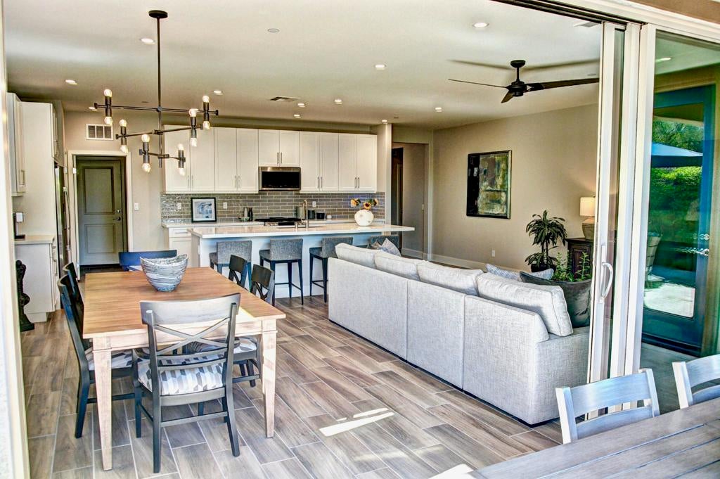 As you pass through the gated 55+ community at Trilogy at the Polo Club, one of the deserts premier lifestyle communities in the Coachella Valley, you're enveloped by tranquility. Manicured landscapes and elegant architecture invite you to embrace life of relaxation and luxury in your new home. This meticulously upgraded Affirm model offers 1622 square feet of sophisticated living. As you approach notice the striking Thermal Tru 4 panel front door with privacy glass, setting the tone for luxurious living. Step inside to an inviting entrance that leads to a spacious great room with 9 ft ceilings adorned with 5 1/2 inch baseboards. The open kitchen with premium stainless steel GE appliances with a 10-foot quartz island is great for entertaining your guests while preparing culinary delights to enjoy. Your home features two spacious bedrooms and bathrooms with a large master walk-in closet. The master suite with 7-inch crown molding is a true retreat boasting marble tiles on the floor of the spa-like glass enclosed shower. A private guest suite and bathroom, and a versatile den great for an office, media room, or a spare bedroom for guests. Seamless indoor-outdoor living is achieved through an 8x15 foot rolling glass wall. The resort-style backyard is an entertainer's paradise showcasing a 10x27 foot heated saltwater pool with Stonescapes Tropics Blue mini pebble finish, elegant travertine tile decking in a French pattern, and a large gas fire pit with crushed reflective glass creates a mesmerizing focal point for evening gatherings. Interior comfort is enhanced by 4 1/2 inch window shutters and wood-like tile throughout. The two-car garage features a 2-ton Daikin mini-split AC for year-round comfort. Whole-home EERO Wi-Fi system with integrated smart devices for effortless automation. Check out the award-winning clubhouse and June Hill restaurant and bar. There are many amenities to take in, like the three pools, gym, pickleball, and various club spaces to keep you entertained. Experience the epitome of desert resort living. Your dream lifestyle awaits at Trilogy at the Polo Club.