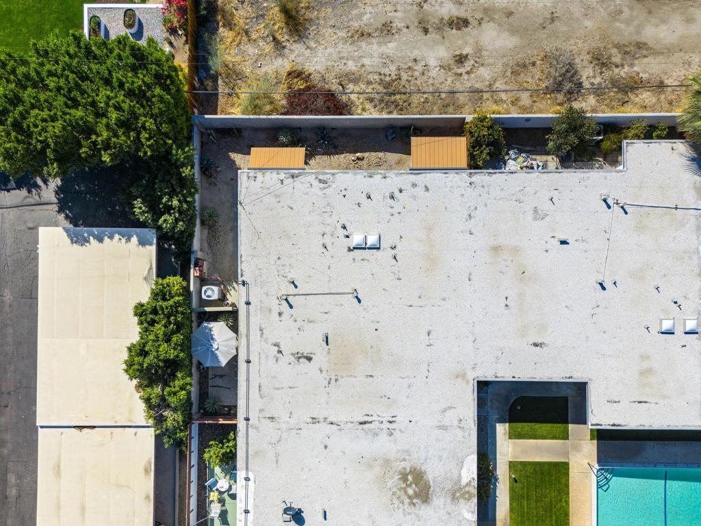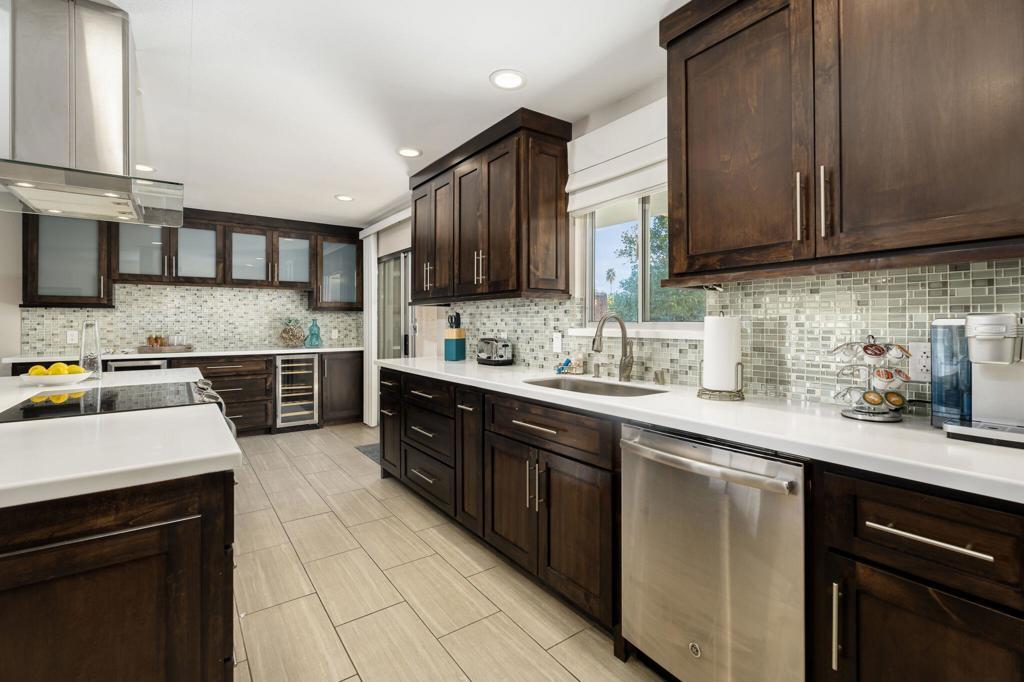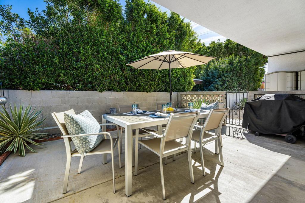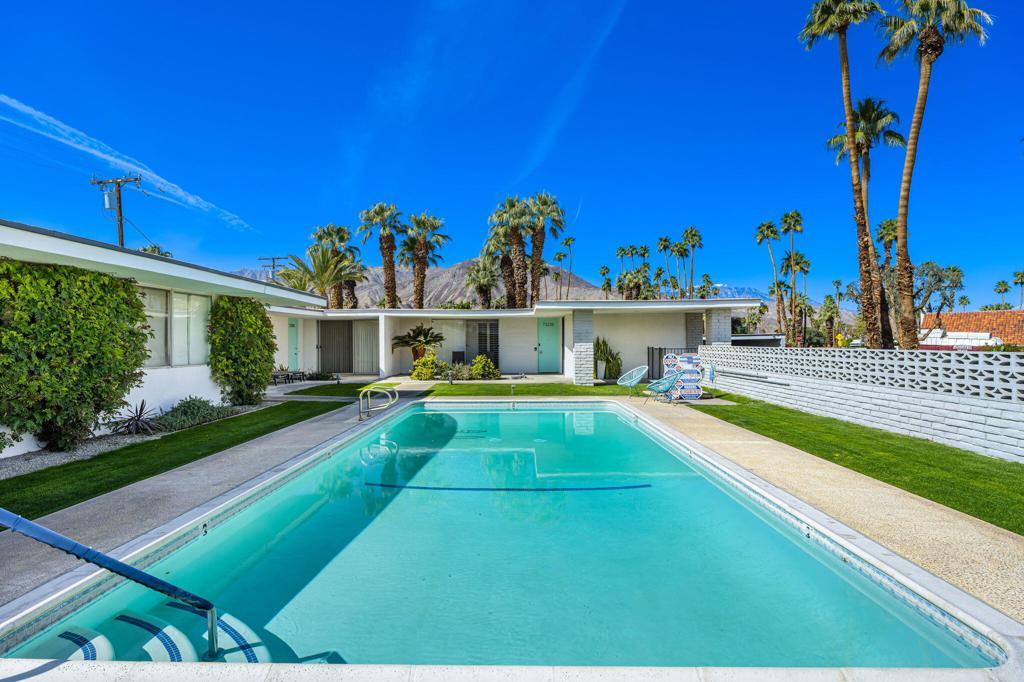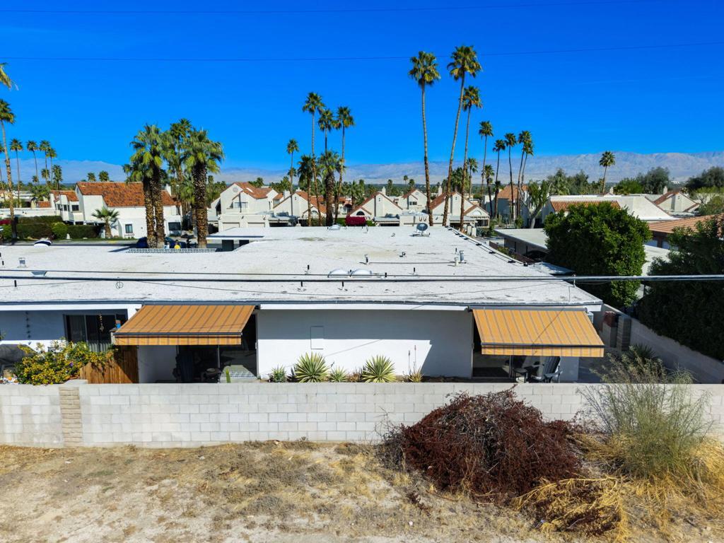 Stylish & fully remodeled, mid-century condo just one block from El Paseo! PLUS, STR allowed. This beautifully updated single-story condo in the heart of Palm Desert is a rare find! Just one block from the iconic El Paseo, this 2-bedroom, 2-bathroom home has been completely transformed with a modern open-concept design--perfect for effortless entertaining. PLUS, its zoned R-3 which allows you the flexibility to short term vacation rental with an active permit. The gourmet kitchen is functional and spacious, featuring custom wood cabinetry, a sleek glass tile backsplash, and an entertainment bar complete with a beverage center and two wine fridges. The kitchen seamlessly flows into the family room, where expansive windows frame stunning pool and mountain views, creating the perfect indoor-outdoor ambiance. Additionally, there is a spacious outdoor dining area off the kitchen for dining al fresco. The spacious primary suite offers two separate closets (including a walk-in), dual vanities, and a spa-inspired glass-tile walk-in shower. A sliding glass door leads to the private backyard, inviting you to enjoy the crisp fall air with a retractable shade for convenience and privacy.The second bedroom is equally spacious and features its own sliding door to the patio. As a corner unit, this home boasts one of the largest yards in the complex, a blank canvas ready for your personal touch. A dedicated laundry room-- a rare feature in homes of this era--adds convenience.With high-end finishes, a prime location, and breathtaking views, this stunning condo is even better in person! Don't miss your chance to own a piece of Palm Desert paradise.