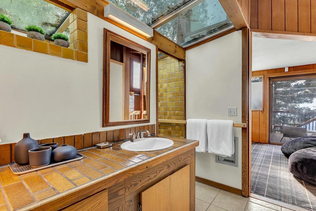 This architectural gem, designed by renowned architect Dennis McGuire as his first project in Idyllwild, CA, is a breathtaking masterpiece anchored and pinned to massive granite boulders, some of which grace the interior of the home. Clad in Simpson Redwood plywood with resawn redwood accents inside and out, the home seamlessly blends natural elements with modern design. Expansive views span from Mount Wilson-aligned with the summer solstice sunset-to Mount San Gorgonio and Black Mountain. The main level boasts a light-filled kitchen with tiled counters, a dining area, and a living room with soaring ceilings, a dramatic fireplace, and unparalleled vistas. The primary bedroom opens to a private deck for peaceful mountain moments. A lower-level guest room, featuring a cozy bay-like nook framed by glass, offers space for an office or serene retreat. Relax in the skylit shower, soak in the top-quality hot tub, or unwind on multi-level decks surrounded by nature. This rare visual jewel invites you to experience a harmonious balance of nature and design.