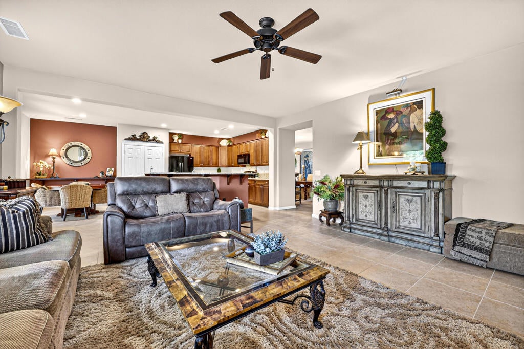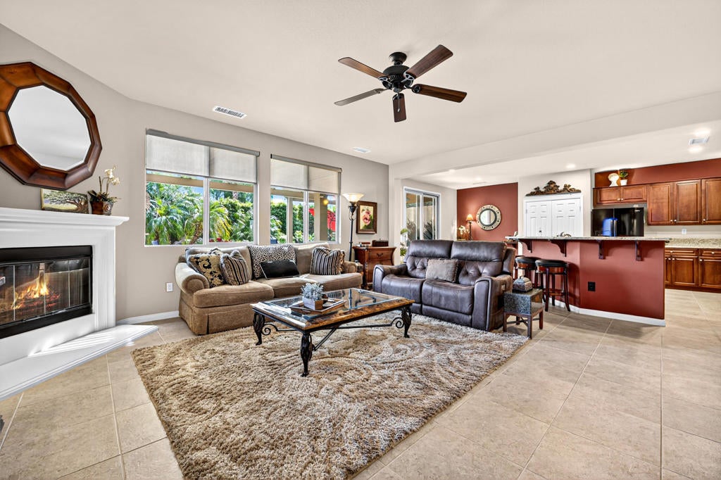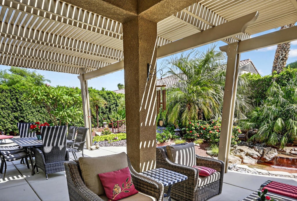 Step into the sought-after Merida floor plan, offering 2,370 sq. ft. of refined living in the premier 55+ active adult community of Sun City Shadow Hills. Furnishings included with few exceptions! The chef's kitchen is a true centerpiece, featuring rich wood cabinetry, granite countertops, black appliances, a generous walk-in pantry, and a central island with bar seating--perfect for both casual meals and entertaining. Flowing seamlessly into the expansive great room, the space is enhanced by a cozy fireplace and sliding glass doors that open to an extended covered patio. Outdoors, enjoy the peaceful backyard where a soothing water feature creates a private, tranquil retreat for dining, entertaining, or simply unwinding. Truly a ''secret garden'' experience! The luxurious primary suite is designed for relaxation with plush carpeting, a spacious walk-in closet, and a spa-like bath with dual vanities and a walk-in shower. Two additional guest bedrooms provide comfort and flexibility, complemented by a full bath with a shower-over-tub combination. As a resident, you'll enjoy a resort-style lifestyle with access to two championship golf courses, two clubhouses, sparkling pools, modern fitness centers, and an endless array of clubs, activities, and social events.