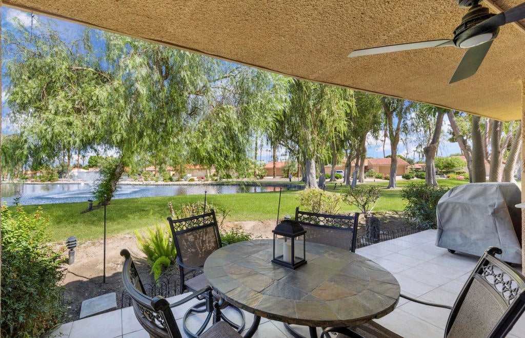Turnkey Lakeside Condo at Sunrise CC!This 3 Bed, 2 Baths end unit, Barcelona Plan has panoramic views of the Lake.Resort Style Living awaits! This upgraded condo features Quartz Counter Tops, Custom Cabinets, Stainless Steel Appliances, Remodeled Baths, Tile Floors, Dual Pane Windows, Solar Panels, and a cozy Fireplace.Enjoy the private patio with sweeping Lake views, fountains, Swans and lush trees. Just steps from the Pool & Spa, Clubhouse. Sunrise CC offers and 18 Hole Golf Course, Tennis and Pickle Ball Courts.Also a Fitness Center, 21 Pools and Spas,Dining Room and Lounge. Close to the River Complex, Shops, Restaurants, Theaters. This Home is offered turnkey furnished, ready to move in and enjoy all that Sunrise CC has to offer.