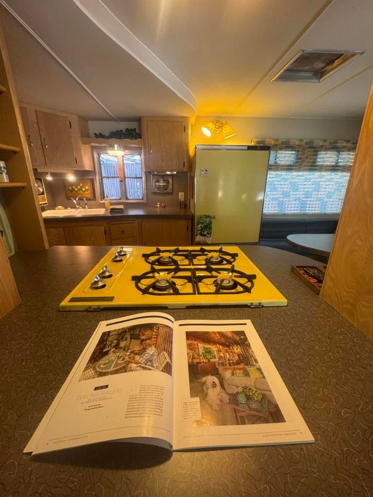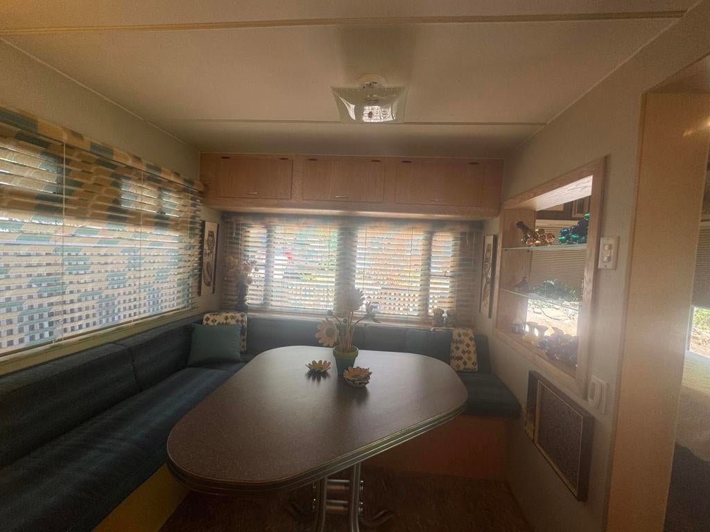 Step into timeless charm with this beautifully preserved 1958 vintage trailer-where mid-century style meets modern comfort. This one bedroom with a bonus sleeping space; features a spacious living area welcoming you with a warm, inviting ambiance, highlighted by a striking vintage wood-burning Malm fireplace at the heart of the home. The retro kitchen features classic vintage appliances, perfect for preparing meals while embracing the nostalgia of yesteryear. A built-in circular dining nook creates the ideal space for gathering with friends and family. Enjoy the outdoors from the inviting front deck or retreat to the serene, fully fenced backyard-perfect for relaxation, entertaining, or simply soaking up the peaceful surroundings. This rare gem in Royal Pines Estates offers an estimated space rent of $675/month, which includes access to the swimming pool, clubhouse, and laundry facilities. Located close proximity to town and to scenic hiking trails, this home offers both convenience and a nature-filled lifestyle.