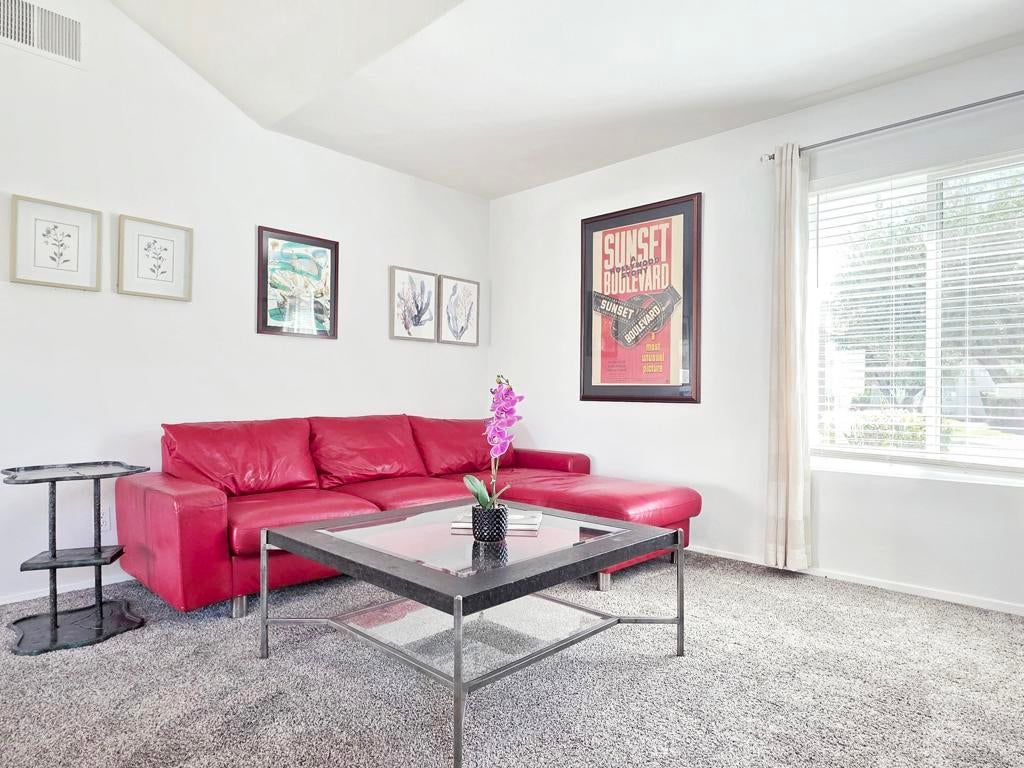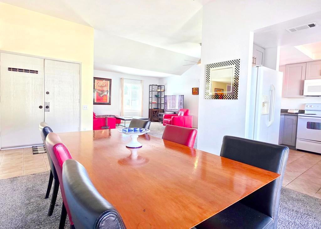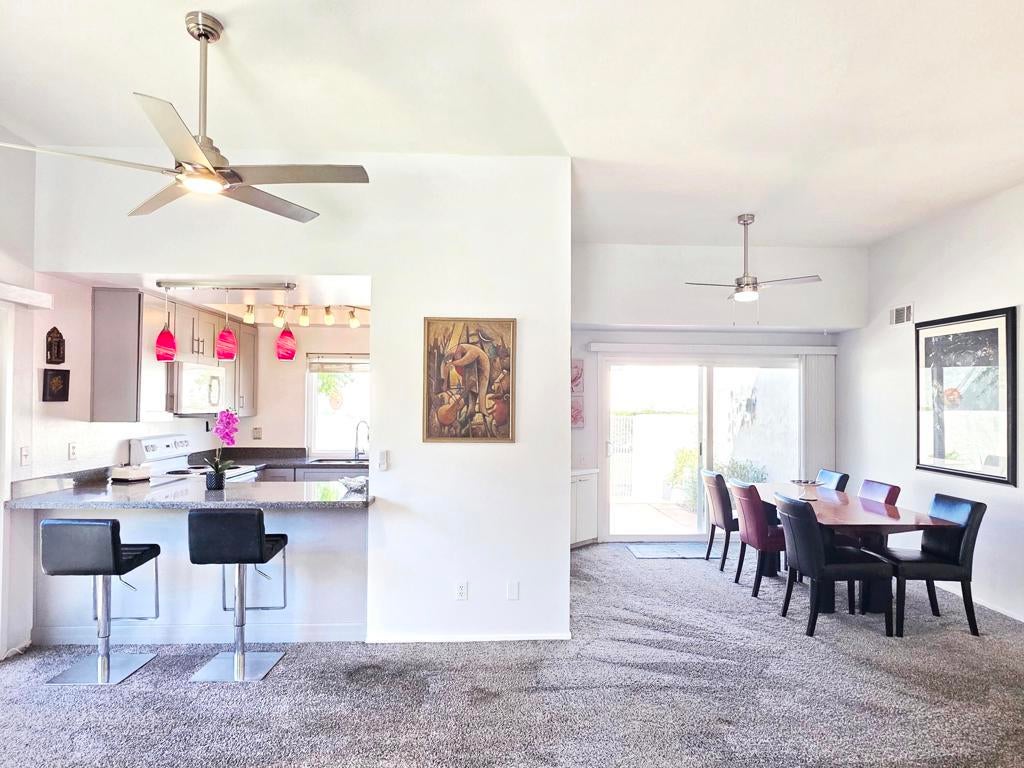 Welcome to The Fairways, your own slice of resort-style living in sunny South Palm Springs!This stylish end unit feels more like a private home than a condo -- light, bright, and full of that effortless desert vibe. Step through the double doors into a sun-filled living space with vaulted ceilings and an easy flow that invites you to kick off your shoes and relax.The kitchen is a total Palm Springs dream -- quartz counters, modern cabinets, and a breakfast bar that's perfect for morning lattes or late-night laughs. Just off the dining area, your private patio is ready for outdoor dinners, weekend brunch, or a chilled drink with mountain views.The spacious primary suite opens to a peaceful greenbelt setting and features a beautifully updated bathroom. The guest bedroom is ideal for visitors or a stylish home office.Extras include a washer and dryer in the attached 1-car garage, a covered carport, and two extra parking spaces for friends dropping by. Recent updates like a newer HVAC system and water heater make this home move-in ready and worry-free.You'll love the mountain views and the endless amenities: 8 sparkling pools, a soothing spa, 8 pickleball courts, 2 tennis courts, and a lively clubhouse that's always buzzing with good energy.Across the street is the iconic Tahquitz Creek Golf Club, and the CV Link trail is right nearby for walking, biking, or skating your way through the valley. Just 10 minutes from downtown Palm Springs and minutes from the airport -- close to all the fun, food, and fashion this desert paradise has to offer.This isn't just a home -- it's a vibe. Welcome to The Fairways, where every day feels like a getaway. 🌴