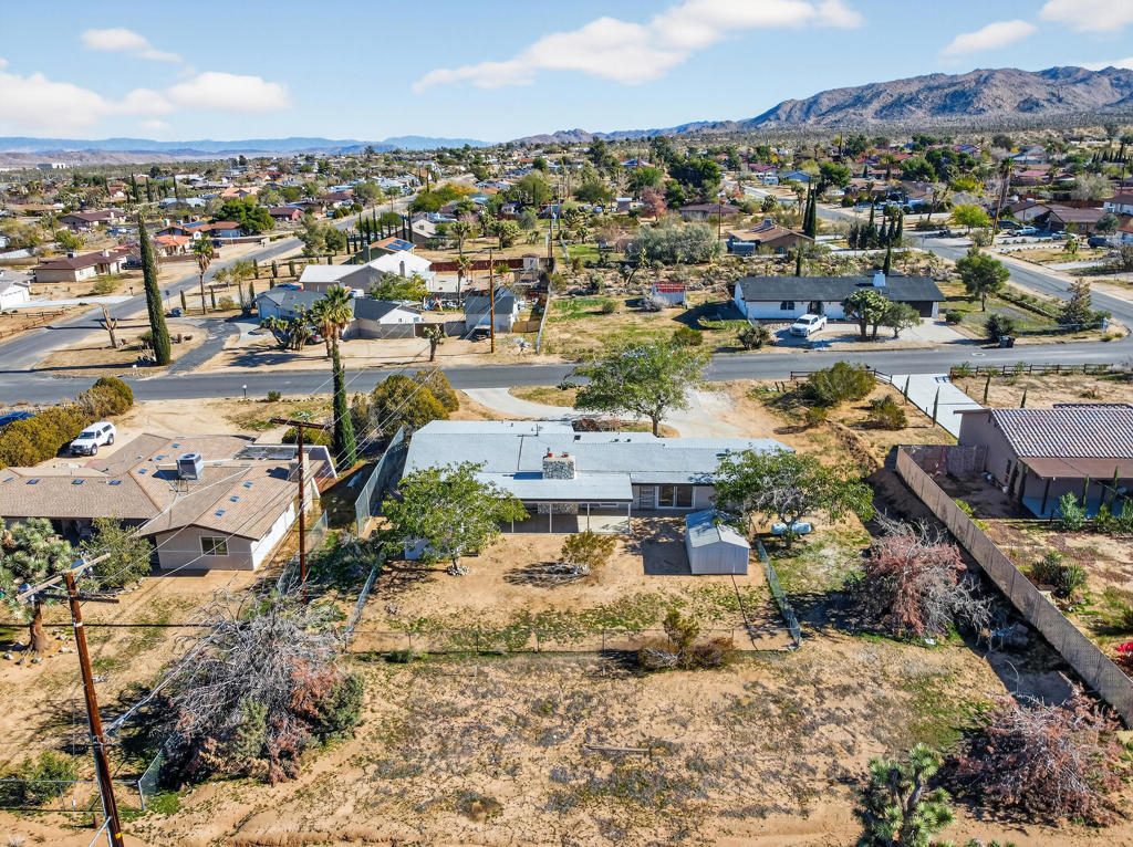 Morning light. Mountain air. Space to live the way you want.This is for someone who VALUES breathing room, inside and out.Set on a SIZABLE lot with a circular driveway, this 3-bed, 2-bath home offers 1,658 sq ft of easy, single-level living with a strong connection to the OUTDOORS. Sliding glass doors line the back of the home, opening to wide-open VIEWS of surrounding mountains--snow-capped in fall and winter.The yard is built for REAL LIFE: boats, off-road toys, raised garden beds, or large animals with room to roam. Built in 1959, the home carries solid character while supporting a MODERN lifestyle. Minutes from hiking trails, grocery stores, schools, art, music, and Joshua Tree National Park--this is where space, access, and scenery come together.