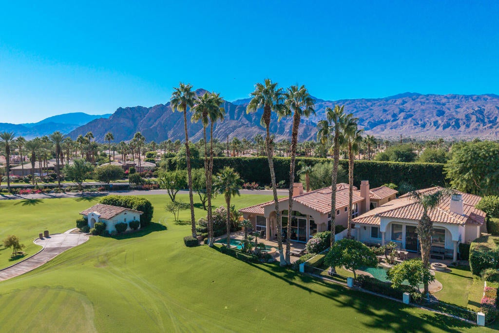 Imagine welcoming each day with a serene sunrise over the 13th tee box and 12th green of the Jones Course at Rancho La Quinta Country Club. This is not just a home; it's a coveted lifestyle. This immaculate end-unit residence offers an atmosphere of privacy with no neighbor to the south, yielding an expansive side yard--a rare find. The spacious 4-bedroom, 3.5-bath floorplan, including a detached casita, is designed for both grand entertaining and tranquil retreat. Soaring ceilings and a wall of glass featuring a 10-foot slider immediately draws you toward the linear pool and spa, seamlessly blending indoor luxury with the sun-drenched desert climate. Natural light floods the living spaces, highlighting the elegant finishes, including granite counters, stainless appliances, and two intimate fireplaces. The luxurious primary ensuite features exquisite travertine surrounds and 2 walk-in closets. Life at Rancho La Quinta is unmatched. Your HOA dues simplify upscale living, covering 24-hour guard-gated security, high-speed internet, cable, landscaping, and walk-up trash service. Best of all, they include a Sports Membership providing access to the newly renovated clubhouse (mid-season completion), tennis, pickleball, pools, and a state-of-the-art fitness center. With this extraordinary amenity package, there is no better time to secure your sanctuary in Rancho La Quinta.
