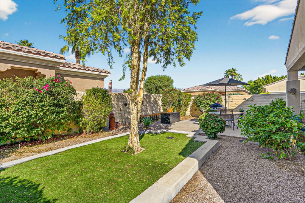 Welcome to this charming Canterra floor plan offering 1,257 sq. ft. of comfortable living space, ideally situated on a desirable corner lot in Sun City Shadow Hills. The inviting great room features tile flooring, two large windows, and a sliding glass door that fills the space with natura light and provides easy access to the backyard. The kitchen showcases sleek stainless-steel appliances, granite countertops, and abundant cabinetry with room for a cozy breakfast nook. A separate laundry room adds everyday convenience. The primary suite offers carpet flooring, a large picture window overlooking the backyard, a walk-in closet, and an en suite bathroom with dual vanities and a shower stall equipped with grab bars. The guest bedroom is located near a full bath with a shower-over-tub combination perfect for visitors. Step outside to enjoy a spaciousbackyard featuring a covered patio, firepit, extended concrete area ideal for outdoor seating, and a grassy section with a mature tree creating a relaxing retreat for entertaining or unwinding. Sun City Shadow Hills is an active 55+ community offering resort-style amenities, including two clubhouses, championship golf courses, fitness centers, pools and spas, pickleball and tennis courts, and a variety of social clubs and activities designed for every interest. Enjoy the perfect blend of recreation, relaxation, and connection in this vibrant desert community. Don't miss the opportunity to make this inviting Canterra yours!