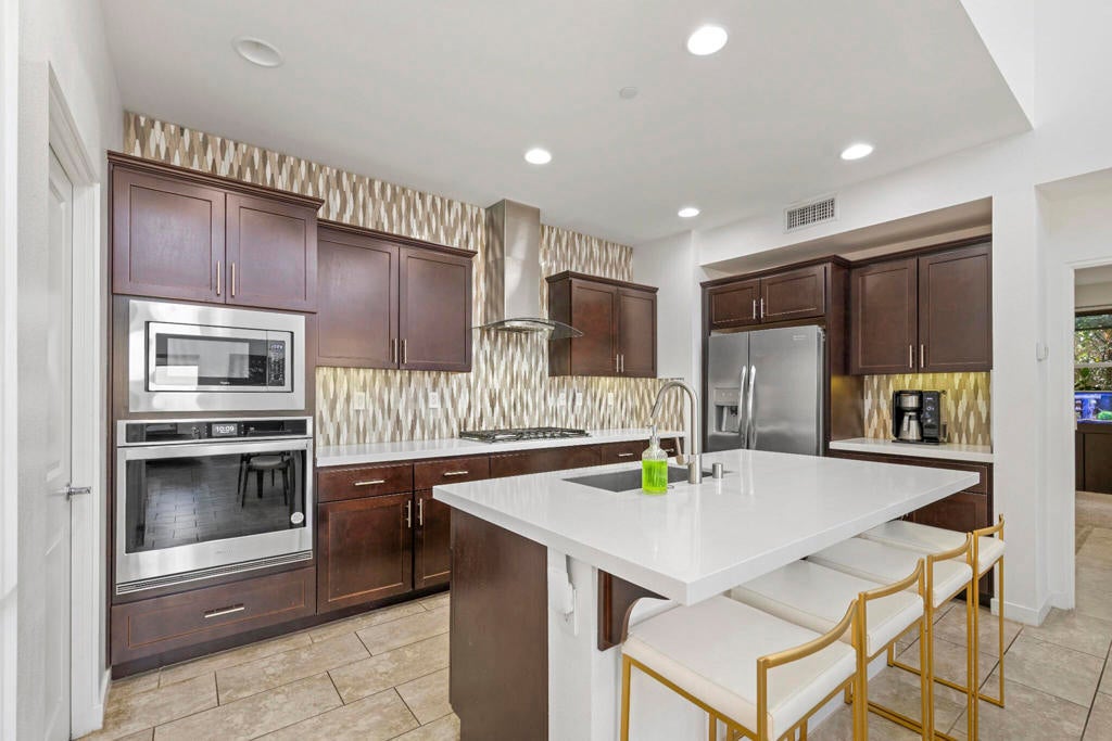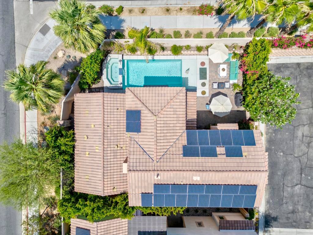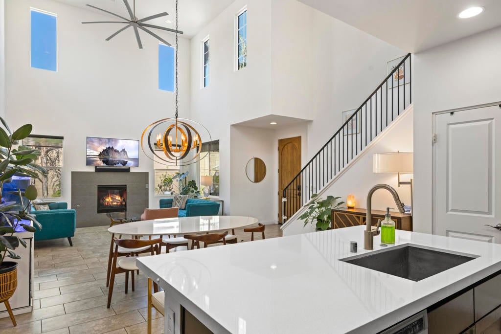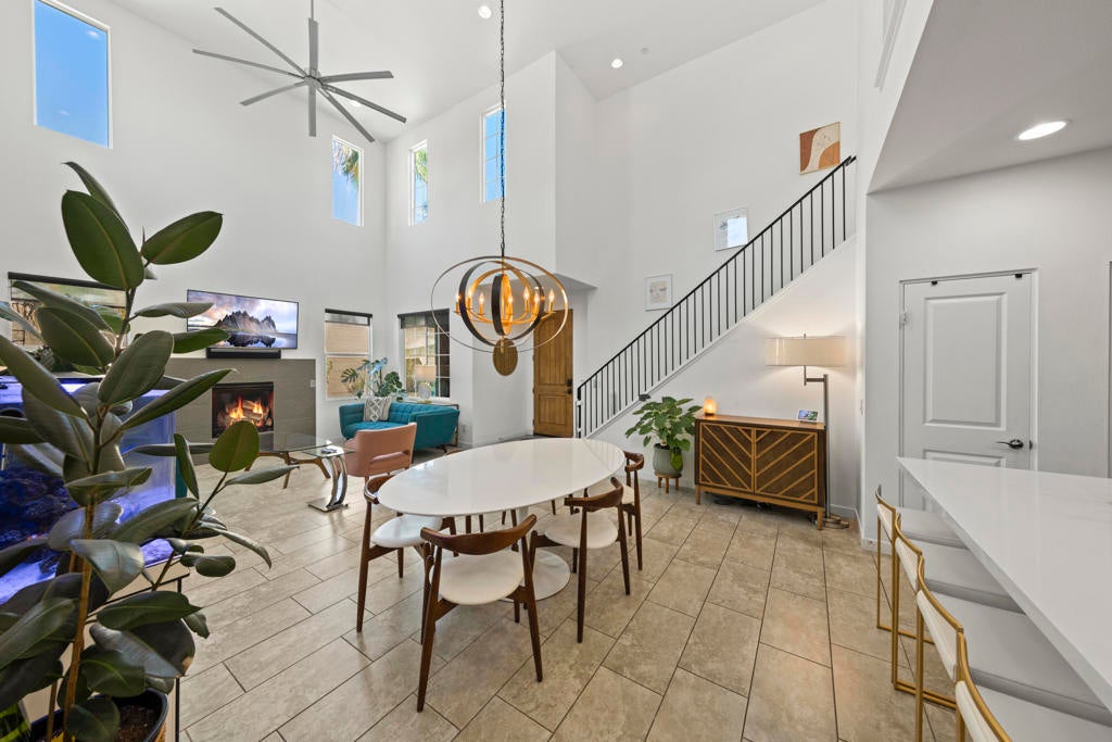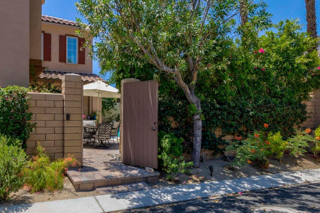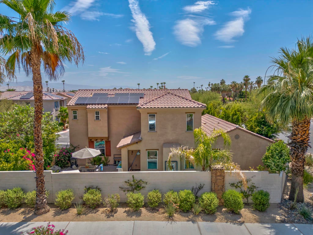 Tucked inside the gates of Village Traditions, this rare stand-alone home captures the Palm Springs lifestyle - modern, effortless, and unforgettable. BONUS: Now offered furnished per inventory, adding significant value for the perfect buyer. Just a short stroll to all that downtown Palm Springs has to offer such as boutique shopping, acclaimed dining, and vibrant entertainment. It's the perfect blend of convenience and retreat. Perfectly positioned on an oversized corner lot, it offers privacy, panoramic mountain views, and a sparkling saltwater pool and spa. Inside, you'll find a thoughtfully designed 3BR/3BA layout with dual primary suites (one upstairs, one down), airy vaulted ceilings, and seamless indoor-outdoor flow. The upstairs loft provides flexible space for a gym, office, or cozy lounge. The kitchen is sleek and sophisticated with quartz counters and stainless appliances, while owned solar, a soft water system, and energy-efficient windows keep life comfortable and low-maintenance. Outside, enjoy smart pool controls, Sonos sound, and a private dog run. HOA covers internet, water, and trash. A two-car garage and guest parking complete this picture of contemporary Palm Springs living.