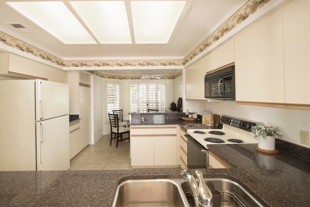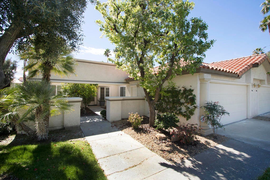 Sought after single-level villa, with a fantastic poolside location! Three bedrooms, two baths + powder room, in a spacious 1,814 SF. Large kitchen with cozy dining nook, vaulted ceilings, walk-in closets and a two car garage are just a few of the features of this home! Amenities include fully equipped fitness center, tennis and pickleball courts, 24 hour security, 32 pools and spas, cable and wi-fi are included and this development has a great location close to dining and shopping!