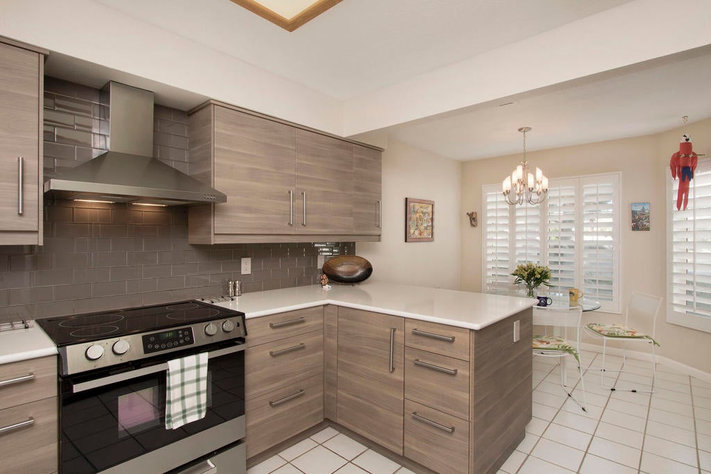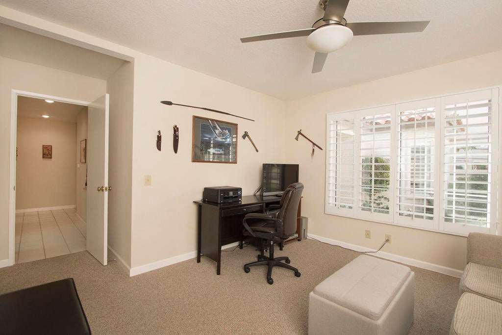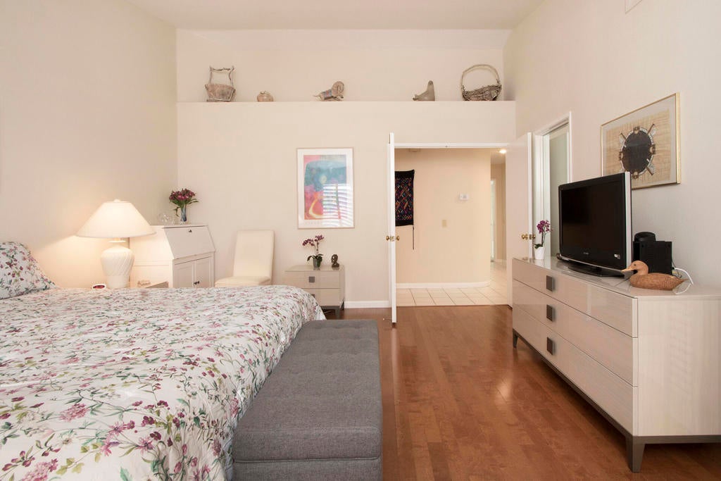Sought after South-facing, single level, end unit! 2 Large bedrooms (formal dining could easily be converted back into a bedroom or den), 2 baths + powder room in 1,814 SF. Home has lovely, European-style contemporary kitchen, hardwood and tile floors, shutters, walk-in closets, high vaulted ceilings, entry courtyard, two car garage and more ... located on a large greenbelt with views of a sparkling pool! This one won't last!
