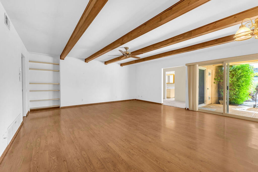 This classic mid-century ranch home blends timeless desert architecture with spacious modern living, perfectly situated near El Paseo's upscale shopping, dining, and entertainment. Featuring 4 bedrooms, 3 bathrooms, and approximately 2,757 sq. ft., the residence offers generous living areas and authentic character throughout.A formal living and dining room set the tone for elegant gatherings, while the expansive great room impresses with wood-beamed ceilings, abundant natural light, and a seamless connection to the open kitchen. The kitchen is well-appointed with a center island and a large picture window overlooking the sparkling pool -- ideal for entertaining or casual family living.Each bedroom is spacious, offering flexibility for guests, a home office, or a creative studio. The primary suite provides a comfortable retreat with a generous layout and ample natural light.Step outside to discover a resort-style backyard designed for relaxation and fun. A palm-framed pool with a charming bridge and island feature anchors the space, surrounded by lush landscaping and a wide covered patio perfect for dining or lounging in the shade.Practical amenities include owned solar panels, RV parking, a two-car garage, and a large driveway for extra guest parking. Combining mid-century charm, functional design, and a prime Palm Desert location, this home offers the ideal canvas for a stylish desert retreat or full-time residence.