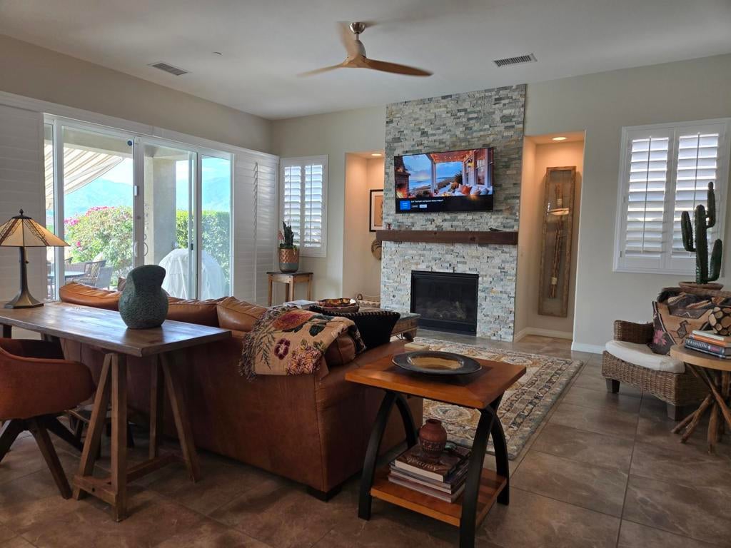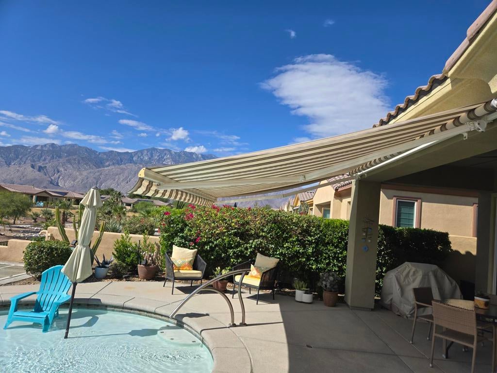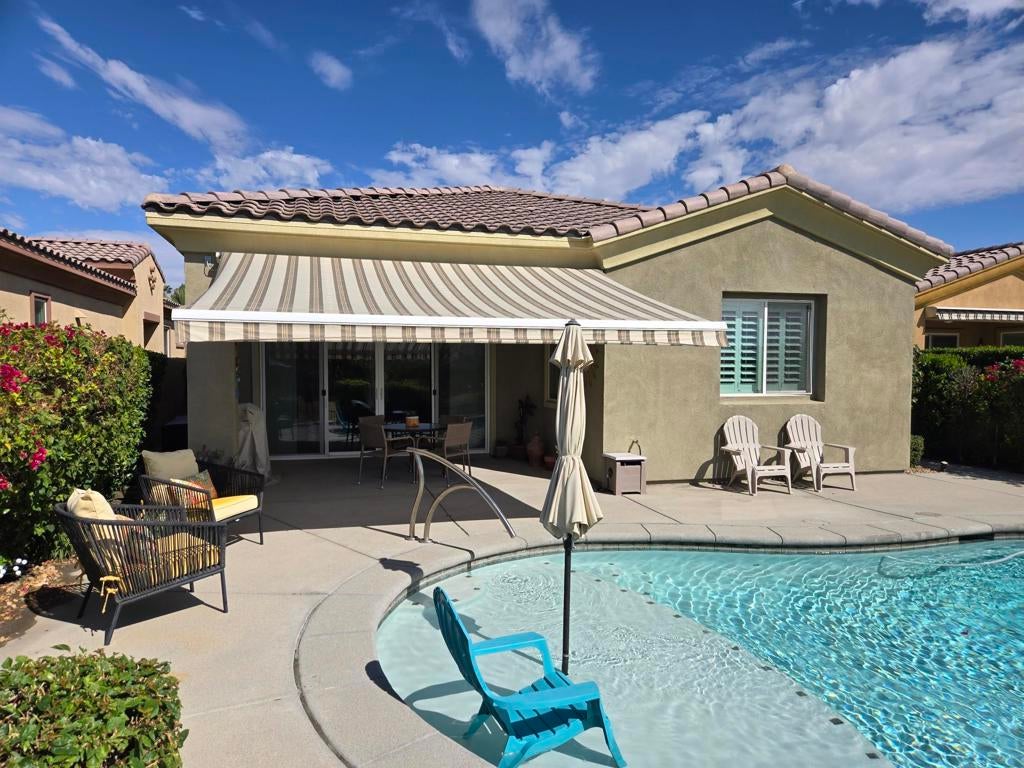 **YOU OWN THE LAND!** Discover your dream escape in this stunning home in the Arroyo of Desert Princess, where luxury meets tranquility. Dive into your own saltwater pool, complete with an in-water deck and spa, and revel in breathtaking southwest views of the Arroyo and majestic mountains. Prepare to be captivated by the mesmerizing sunsets that await you each evening.With three spacious bedrooms and two and a half elegantly appointed baths, this residence is ideal for hosting family and friends. Entertain effortlessly on your private back patio, adorned with a SunSetter awning, creating the perfect ambiance for gatherings or peaceful evenings at home. Offered furnished, subject to inventory, this exquisite property serves as the perfect winter retreat or forever home, tailored to your vision of paradise. Additional highlights include energy-efficient tankless water heaters, leased solar panels, and a new washer and dryer for your convenience. Embrace a lifestyle of comfort and beauty--your ideal home awaits!HOA dues include: 2 DVR or HD cable boxes and service, high-speed internet, grounds maintained to your door by HOA maintenance crews, outside pest control when requested, and outside water. Gated community with 24-hour guarded gate access and regular patrols for added safety and security, health and fitness center membership, tennis, bocce ball, and pickleball courts.