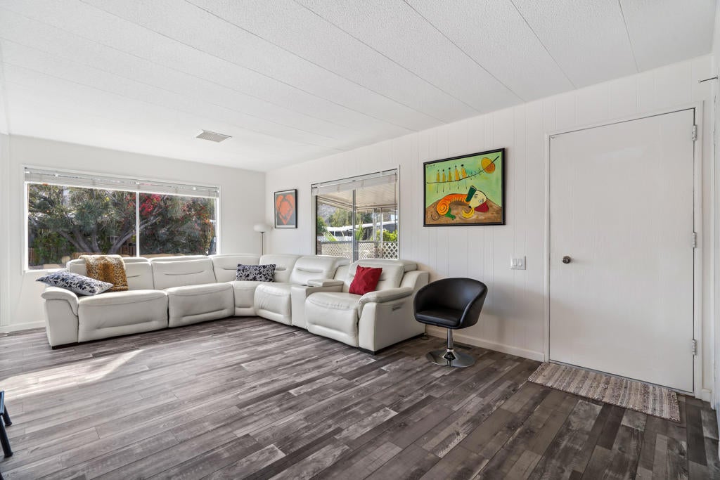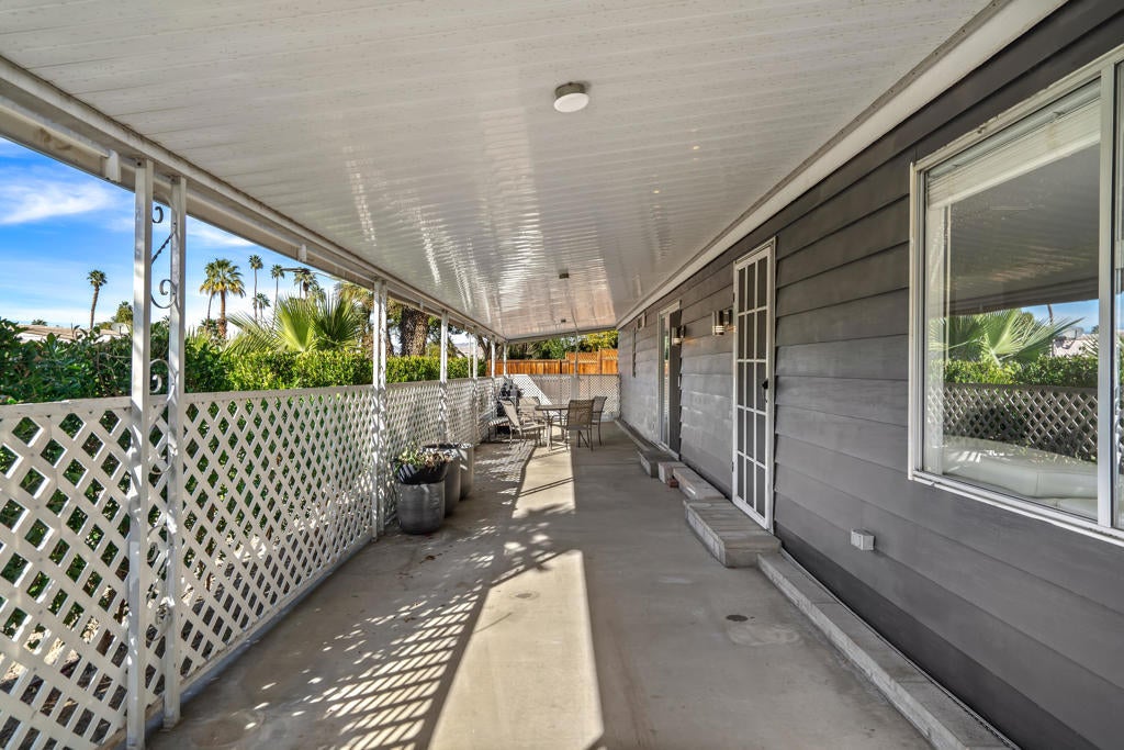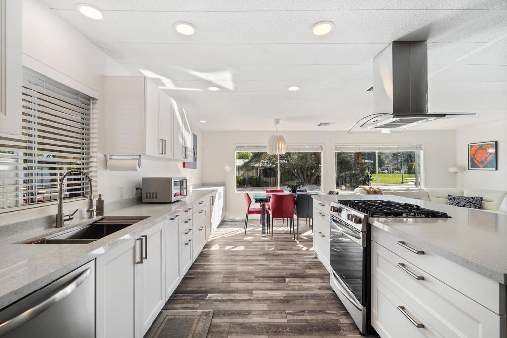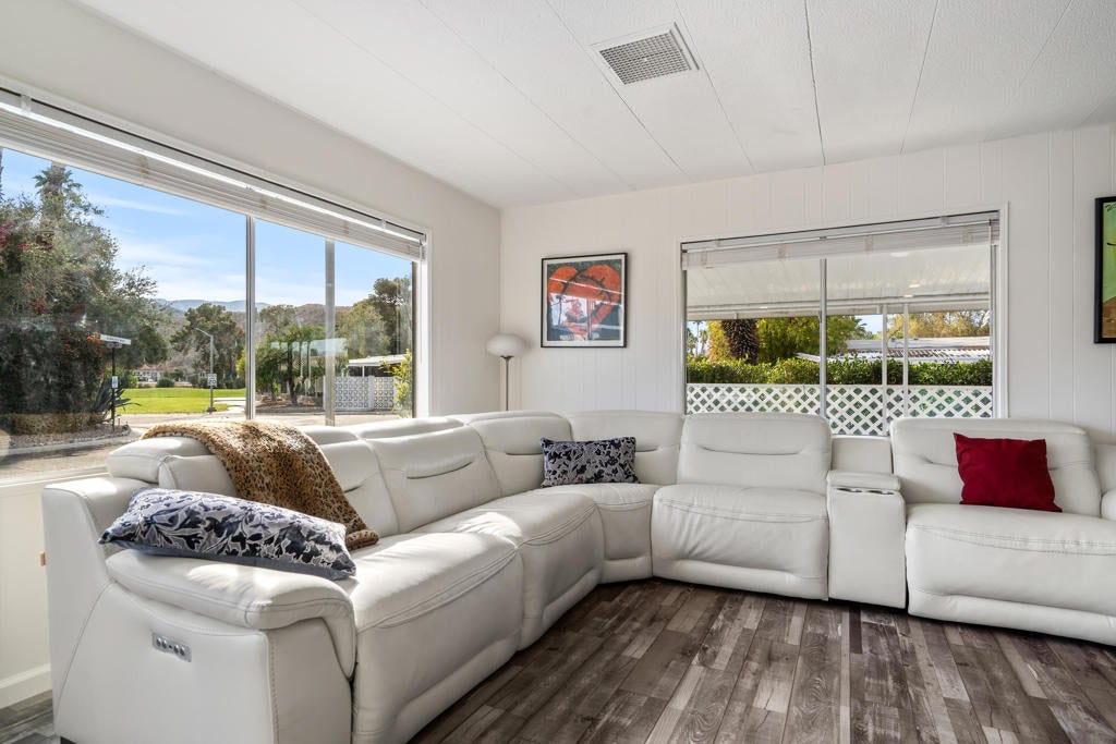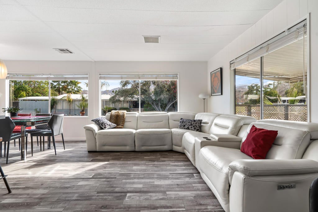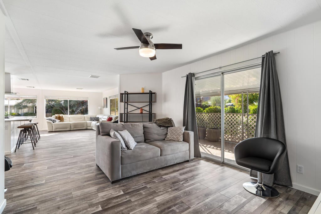 Large renovated 2BR+den/2BA home in the highly sought after 55+ Date Palm Country Club* South facing and on a corner lot this home receives exceptional natural light * Extensive renovation completed in 2023/2024 *Reconfigured to create an open floor plan the kitchen, living room and dining area become one large entertaining space * The kitchen was gutted and a large center island added to create a master chef's work space. Brand new cabinets, quartz countertops, recessed lighting and stainless steel appliances including a 5-burner gas cooktop and hood * Separate den could easily be converted to a 3rd bedroom if so desired * Primary bedroom has an ensuite bath that was gutted and remodeled with a walk-in spa shower, double vanity and bidet toilet * Hall bath updated with a brand new vanity * Laundry room with full size stackable washer and dryer * New vinyl floors and updated electrical and plumbing throughout including a whole house water filtration system * New roof * Spacious back yard ready for a new owners personal touch. 2 car parking pad off the yard * Covered side patio has plenty of space for a seating and dining area - perfect for indoor/outdoor living * 3-car covered carport. Currently 3 large storage sheds take up 2 of the spots * Located in the lovely gated community of Date Palm Country Club with access to an 18 hole golf course, 3 pools, gym, tennis and pickle ball courts, a club house, pro shop and 24 hour security including daytime security guards * $1365/mo. base rent with water, gas and garbage billed in addition by the Country Club based on usage. Electricity secured by the homeowner directly from SoCal Edison.
