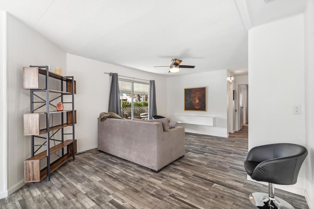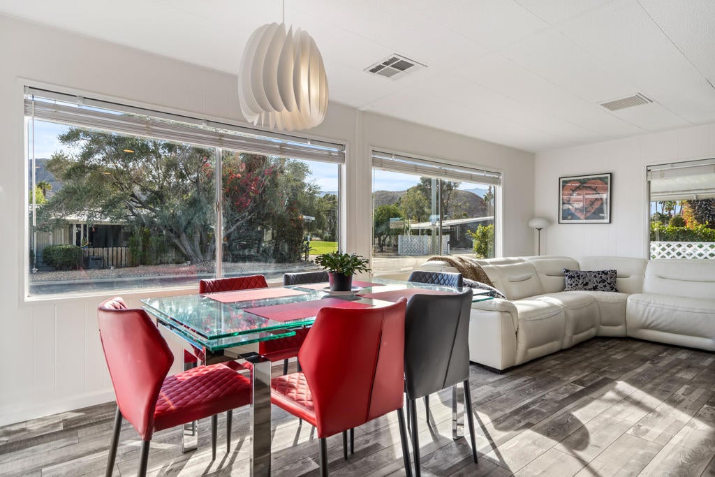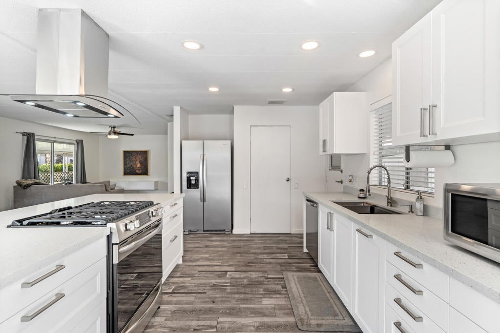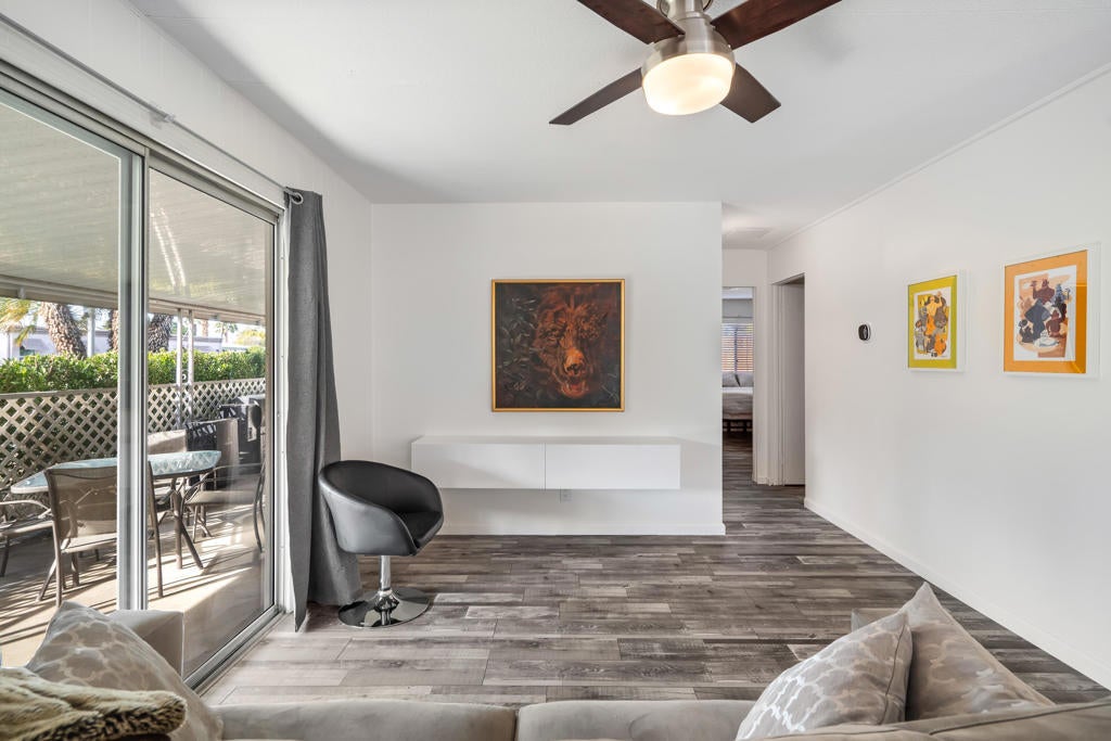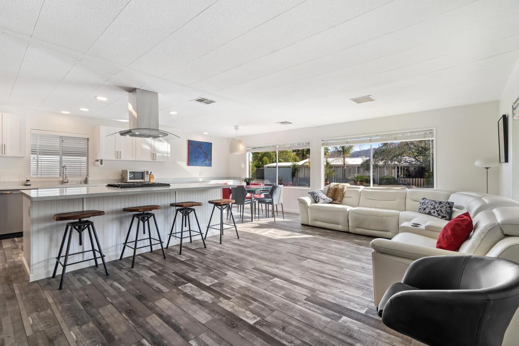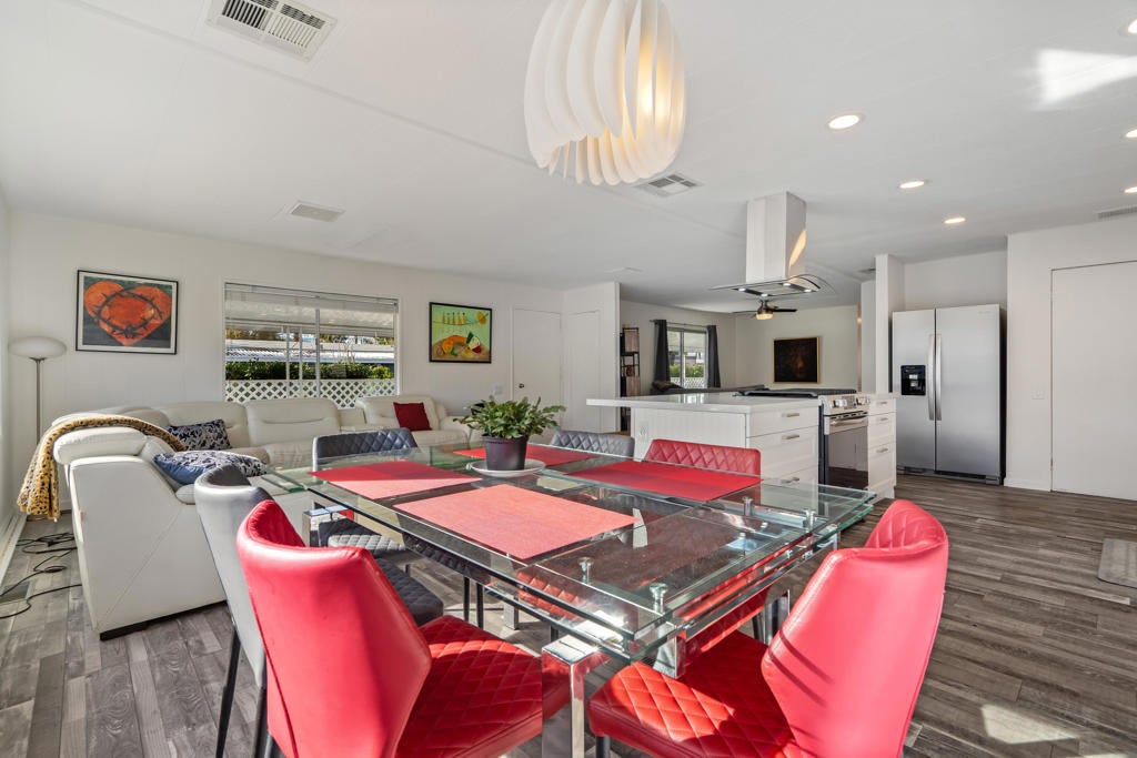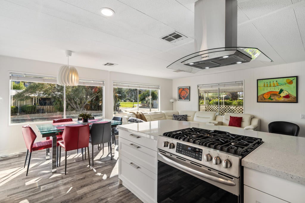 Large renovated 2BR+den/2BA home in the highly sought after 55+ Date Palm Country Club* South facing and on a corner lot this home receives exceptional natural light * Extensive renovation completed in 2023/2024 *Reconfigured to create an open floor plan the kitchen, living room and dining area become one large entertaining space * The kitchen was gutted and a large center island added to create a master chef's work space. Brand new cabinets, quartz countertops, recessed lighting and stainless steel appliances including a 5-burner gas cooktop and hood * Separate den could easily be converted to a 3rd bedroom if so desired * Primary bedroom has an ensuite bath that was gutted and remodeled with a walk-in spa shower, double vanity and bidet toilet * Hall bath updated with a brand new vanity * Laundry room with full size stackable washer and dryer * New vinyl floors and updated electrical and plumbing throughout including a whole house water filtration system * New roof * Spacious back yard ready for a new owners personal touch. 2 car parking pad off the yard * Covered side patio has plenty of space for a seating and dining area - perfect for indoor/outdoor living * 3-car covered carport. Currently 3 large storage sheds take up 2 of the spots * Located in the lovely gated community of Date Palm Country Club with access to an 18 hole golf course, 3 pools, gym, tennis and pickle ball courts, a club house, pro shop and 24 hour security including daytime security guards * $1365/mo. base rent with water, gas and garbage billed in addition by the Country Club based on usage. Electricity secured by the homeowner directly from SoCal Edison.