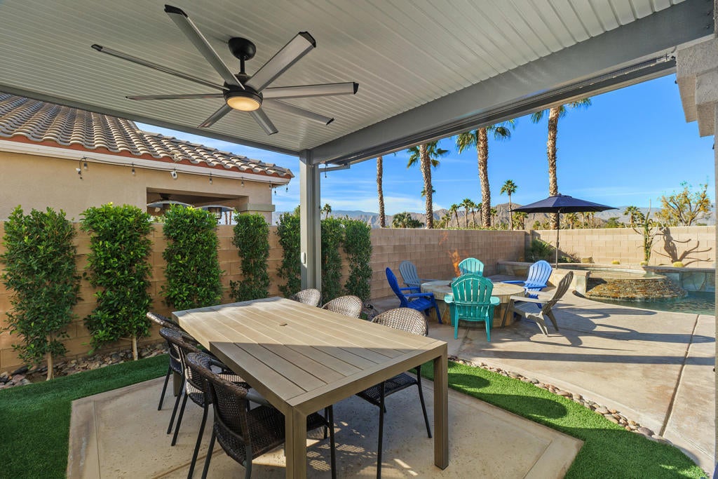 STUNNING QUALITY REMODEL! Back on the market after a summer hiatus. Discover luxury living in this beautifully renovated Balboa model home featuring 3 bedrooms (two primary bedroom suites) and 3 baths. Breathtaking mountain views from the west facing backyard with expansive private patio, pool, spa with rock waterfall, built-in BBQ, firepit, and shaded outdoor living space with fans & automatic sunshades - perfect for entertaining! Inside, enjoy a modern open-concept floor plan with high ceilings and wood-like tile flooring in the main living areas. The gourmet kitchen boasts sleek contemporary cabinets, Thermador appliances, quartz countertops, a full backsplash, and a walk-in pantry. The living room features a resurfaced floor-to-ceiling gas fireplace, while the dining area includes a picture rail for your favorite artwork. The first primary suite offers a large walk-in closet and a spa-like en-suite bathroom with a custom-tiled oversized shower. The second primary suite includes two large closets and a tub/shower with tile surround. The home also features a Murphy bed in the office/third bedroom, whole-house water filtration, an epoxy-floor garage with storage, and an insulated garage door. Located in the gated Indian Springs Golf Club, enjoy low HOA dues ($385/month) covering guard-gated security, front yard maintenance, cable/internet, a fitness center, lap pool, and more. Close to top-rated schools, premier shopping, dining, and the Indian Wells Tennis Center! Don't miss this fully upgraded, move-in ready home in a prime location!