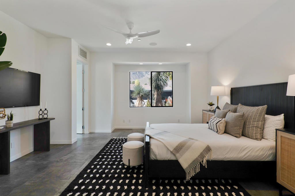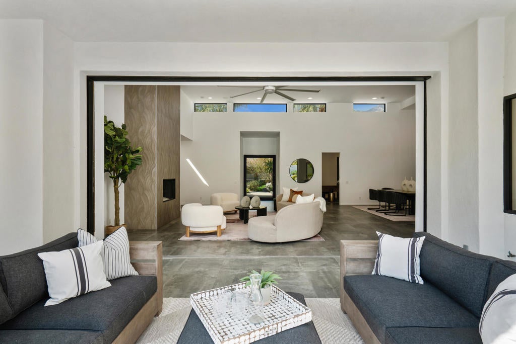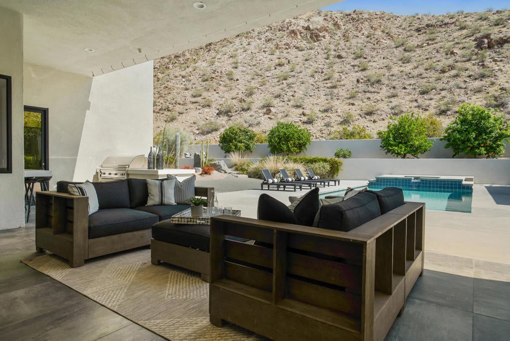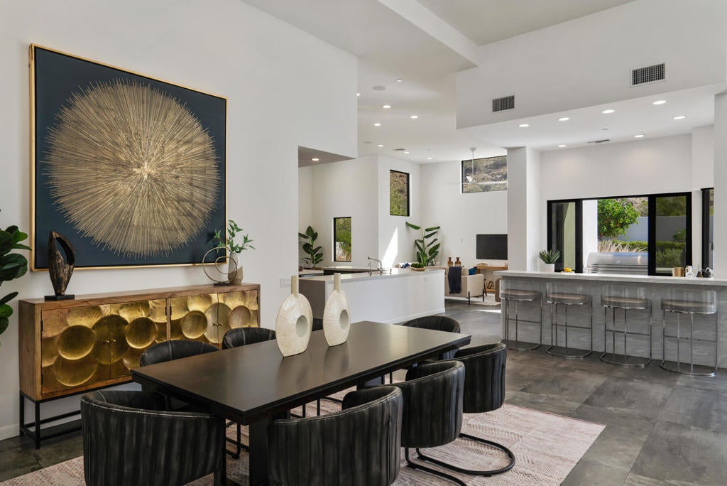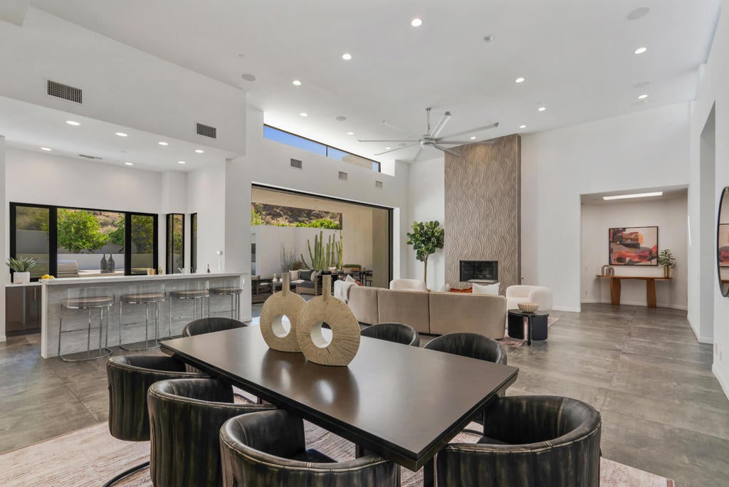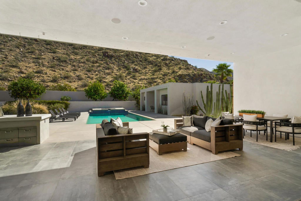 Modern, sophisticated and extensively upgraded, this bright and open custom estate redefines luxury livingin Palm Springs' preferred Andreas Hills enclave. Virtually stripped to the studs and reimagined, the contemporary residence generously accommodates both stylish daily living and grand-scale entertaining in a sprawling single-level floor plan that measures approx. 5,715 s.f. A large pivoting glass entry door introduces main living areas that include a great room with clerestory windows, a sleek fireplace, glass pocket doors to the backyard, and a walk-in wet bar with pass-thru to the outdoor kitchen. Five bedrooms with ensuite (+ large office with private bath could become a 6th bdrm) and 6.5 baths --including a detached casita--ensure comfort for everyone. Open to living areas, a newer chef-caliber kitchen is appointed with high-gloss custom cabinetry and custom-designed countertop, two islands, stone countertops, two sinks, and top-tier appliances including a built-in cabinet-matched refrigerator and a 60 inch commercial-grade stainless steel American Range. Additionally, there are two 30 inch gas ovens and a Commercial-grade fire suppressant system installed by Desert Fire. Powered by a rooftop net-zero solar array, this expertly crafted home hosts newer electrical and plumbing systems, oversized ceiling fans throughout, whole-house audio, and a three-car garage with EV charger. Luxuriate in a primary suite with sitting area, fireplace, patio, a freestanding tub, oversized shower and a walk-in closet. Located on fee land (no lease), the expansive homesite backs to a hill and is distinguished by a pool and spa with solar heat, a spacious loggia, outdoor shower and a built-in BBQ. Photos taken at the time the home was furnished (vacant now).