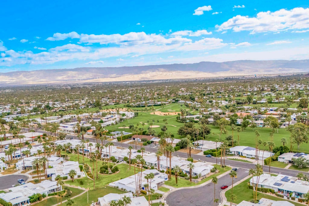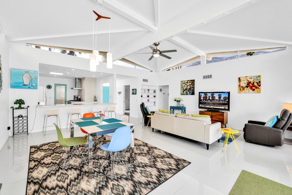 Canyon View Estates Cul-de-Sac End Unit offers 3 bedroom 2 Bath (2 plus Den) in 1636 square feet. Beautiful, move-in-condition, highly upgraded unit. Architect's Palmer & Krisel's mid-century architecture shines with the significant double-gable roofline supported with four clerestory windows. Fine finishes and good taste are evident throughout with polished white tile floors, terrazzo style counter-tops, a cook's kitchen with stylish open shelving, white complimentary appliances and a skylite flooding the room with natural light. The great room provides for living and dining with the oversized terrace extending the indoor-outdoor livability. The Den/3rd bedroom, guest bedroom and primary bedroom are carpeted with both upgraded baths featuring tile floors. Bathrooms have skylites, beautiful tile work and custom vanities. Expansive views from all rooms offer low-density, green belt and mountain surrounds. Many upgrades make this home a good value for this very desirable neighborhood. Plentiful storage, washer / dryer in unit and owned Solar too! Gas tankless hot water heater and central vacuum. Roof, windows, HVAC and sewer line are upgraded.