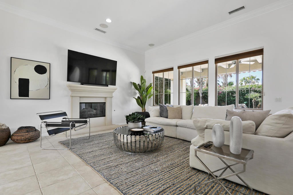 Welcome to this stunning desert retreat located in the exclusive, gated community of Carmela in La Quinta. This beautifully updated and remodeled home features 3 bedrooms, 4 bathrooms, including a spacious casita, offering ample room for both residents and guests. The luxurious upgrades throughout the home create an inviting and sophisticated atmosphere, while the sparkling pool and elevated spa with cascading water feature make it the perfect oasis for enjoying the sunny desert climate. The gourmet kitchen is a chef's dream, equipped with newer, upgraded appliances and elegant cabinetry. Light hardwood floors and stone tile flow throughout the home, adding warmth and style to every room. The expansive Primary bedroom is a true retreat, featuring custom built-ins and a spa-like ensuite with a soaking tub and walk-in shower. Step outside to discover multiple entertainment areas in both the front courtyard and backyard, ideal for relaxing or hosting guests. Whether you're lounging by the freeform pool or unwinding in the spa, you'll feel like you're on vacation year-round in this stunning home. Available for easy showings--schedule your tour today and experience the luxury and tranquility this home offers! Home is staged.