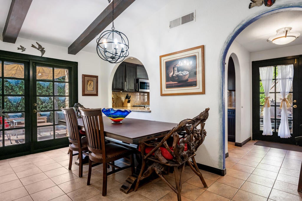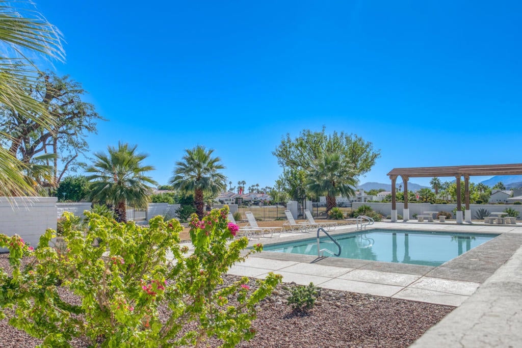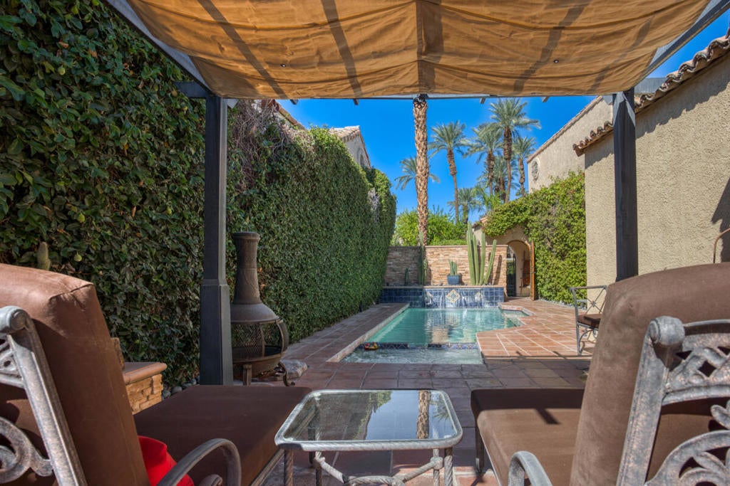 Gorgeous Las Casitas single story townhome with PRIVATE POOL AND SPA in gated Rio Del Sol! This unit features no shared walls, as well as a spacious floor plan with beautiful vaulted beamed ceilings, tile flooring, and arched doorways throughout. The living room showcases a fireplace and a glass slider to the backyard. The dining area has a modern hanging chandelier and french doors to the courtyard. The kitchen offers granite countertops, dark wood cabinetry, and stainless steel appliances. Both bedrooms a bathroom as well as the outdoors. Enjoy the private courtyard with in-ground pool and spa - this is the perfect space for entertaining guests! Residents also get to enjoy community pools, tennis courts, pickleball courts, dog park, and a lake to stroll around. Conveniently located near shopping, dining, Golf Courses and more! Step into a home that's ready to be loved--where new memories await for years to come.