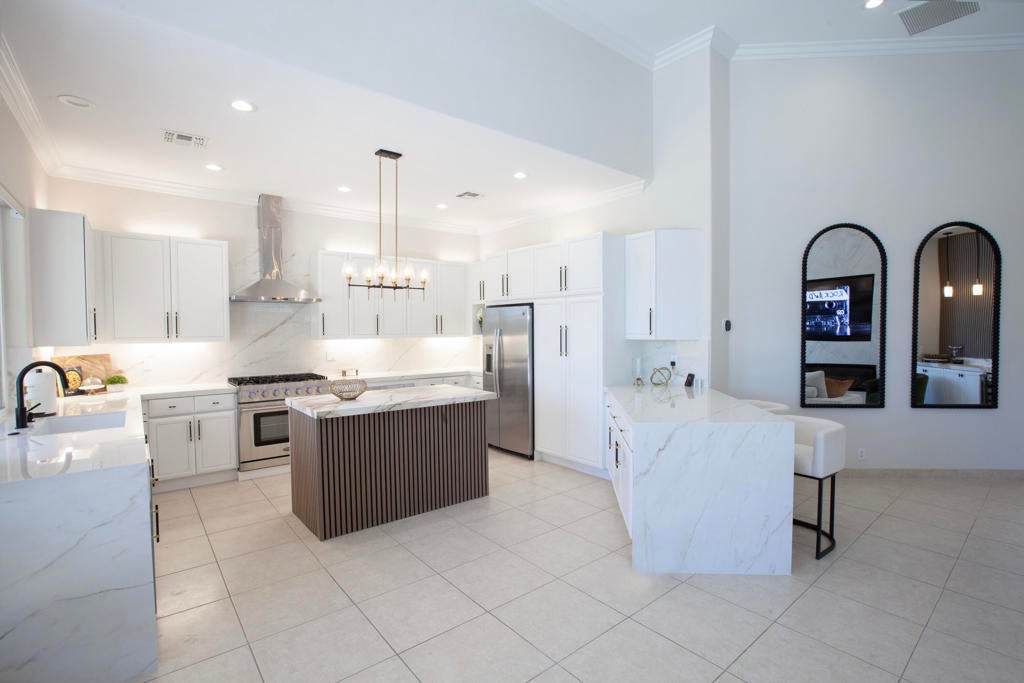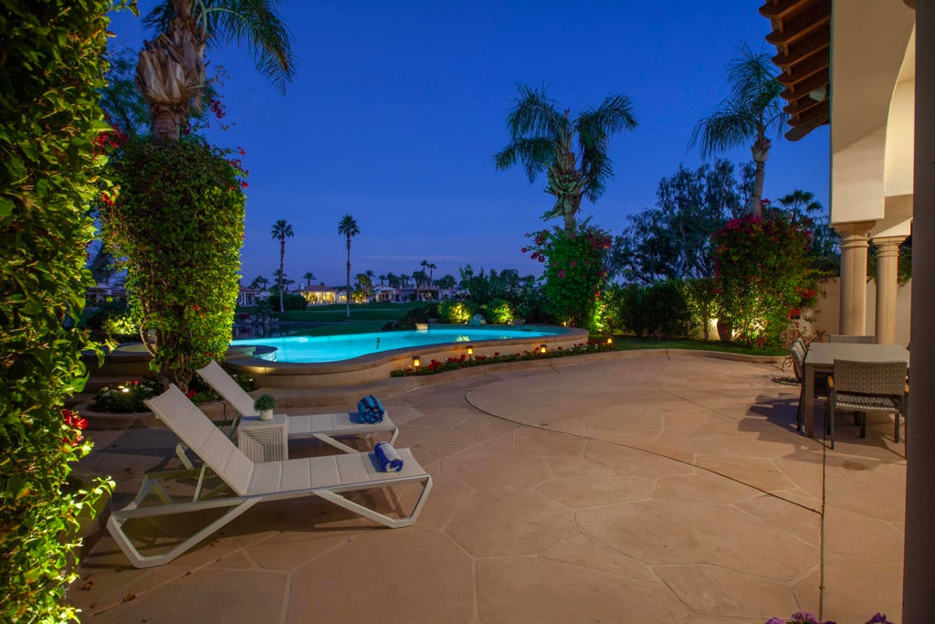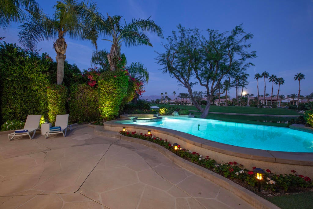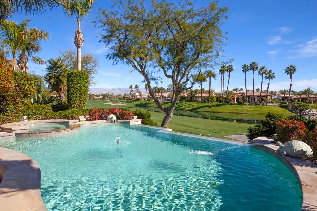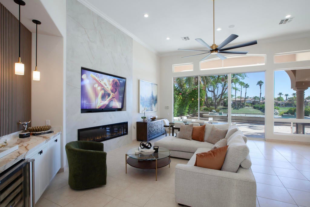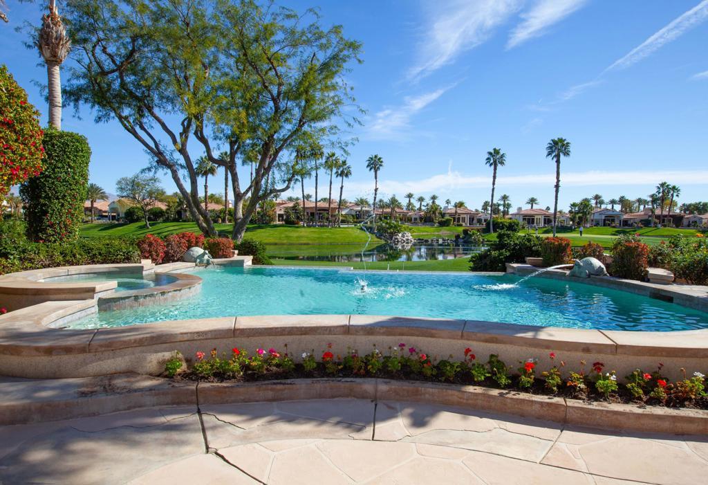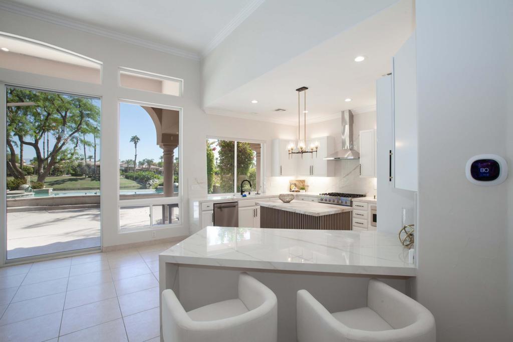 Wow....Turnkey furnished waterfront Encanto 1 that was extensively remodeled in 2024. Sited above the 13th & 14th holes, lakes and waterfall of the Jones Course, this home offers a tranquil setting for seasonal residents or year-round occupancy. Collaborating with Haus Of Design, the home offers newer exterior and interior paint; re-envisioned great room with fireplace re-location creating a dramatic horizontal firewall with media niche, added an adjacent custom bar with quartz counters nearby; fluted linear wood trim at quartz center island and quartz waterfall at peninsula. Additionally, the chef's kitchen boasts newer industrial grade gas range, newer dishwasher, discrete microwave, refinished millwork and newer pulls, quartz counters, custom lighting and views of the pool, lake and grounds. Elegant powder room with new vanity sink, touchier lighting and newer toilet; guest bedroom 1 with raised panel double doors, elegant window coverings and an enlarged bath with newer vanity, quartz counter, Sienna Hexagon marble flooring and ultra-custom closet; private primary suite overlooks private courtyard - here you'll find custom window coverings, custom light/fan, raised panel doors, double moldings -steps away, a primary bath with newer shower enclosure, mitered glass, all new hard surfaces, soft close cabinets, custom mirrors and lighting, elegant soaking tub with custom hardware, spacious main closet with organizers; 3rd guest suite with shutters, molding, raised panel door, newer shower floor, newer vanity, sink, black hardware, mitered glass, private commode, custom mirror and elegant wall paper accent; bonus room overlooking private patio with silhouette window coverings, new queen size sofa pullout, desk area and custom fan/light; laundry area with custom quartz counter, newer Samsung washer & dryer; two-car garage with golf cart garage; poolside you'll find a covered outdoor living space, custom BBQ cooking station, outdoor speakers, elegant infinity edge pool with raised spa, mature landscaping and one of the most tranquil and elegant views you'll find in all of Rancho La Quinta. This home is ideal as the rear grounds receive ample seasonal sun, but also shade during the Spring and necessary shade during the summer. Due to the curvature of Mission Drive West, the home's driveway is massive and can easily accommodate 6-8 parked cars. Fresh, clean and easy - owners have done all the work for you. Turnkey furnished and ready for move-in!