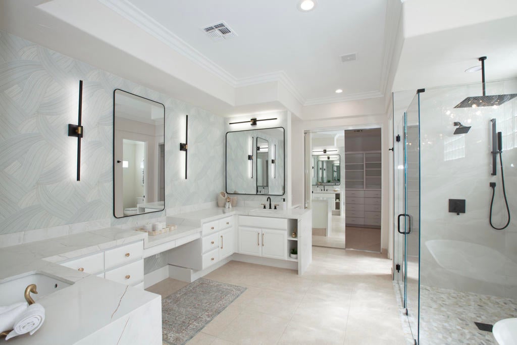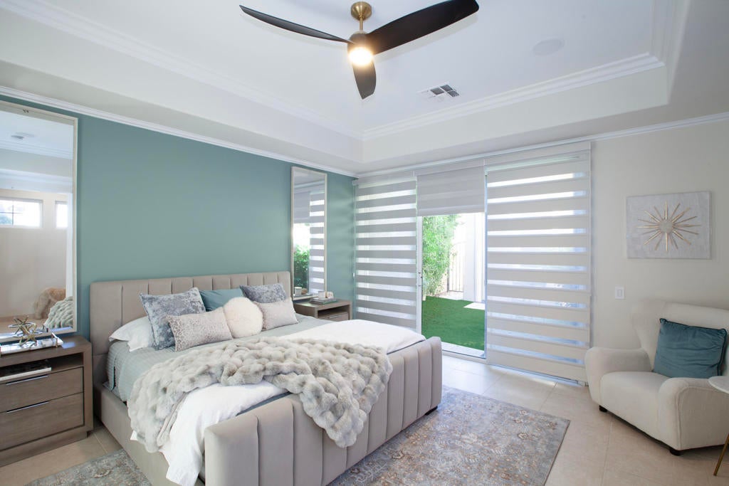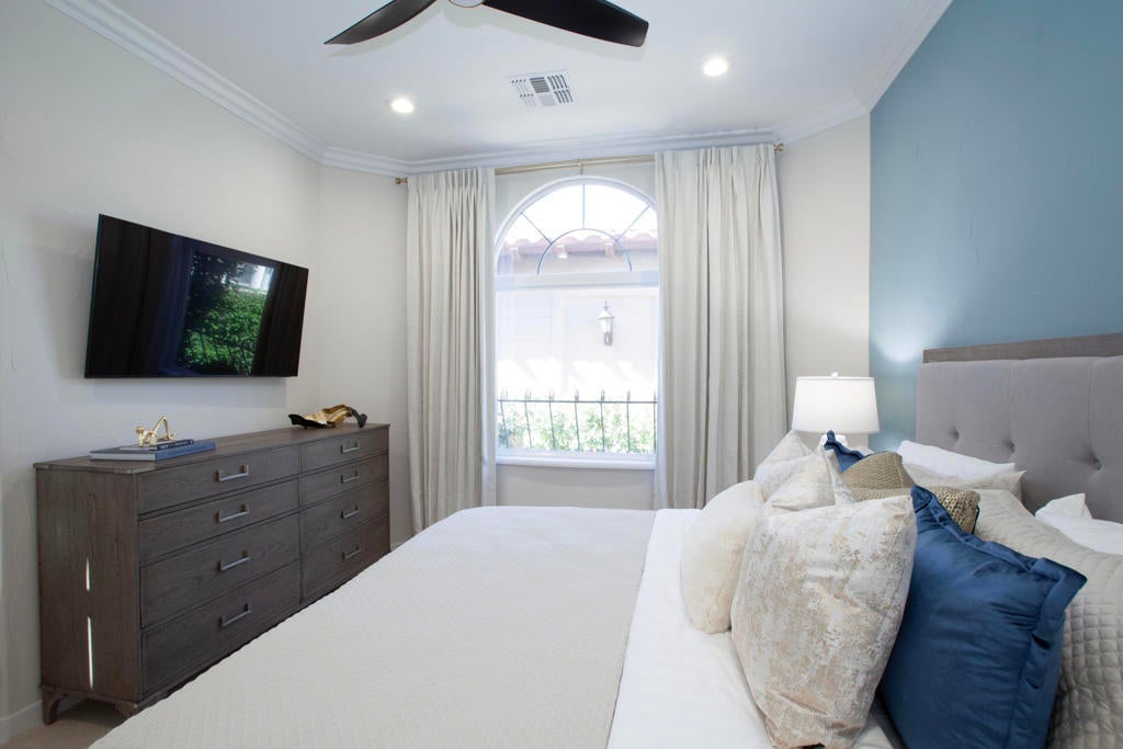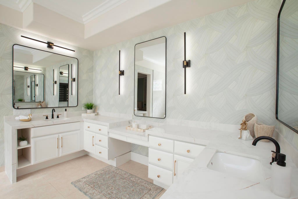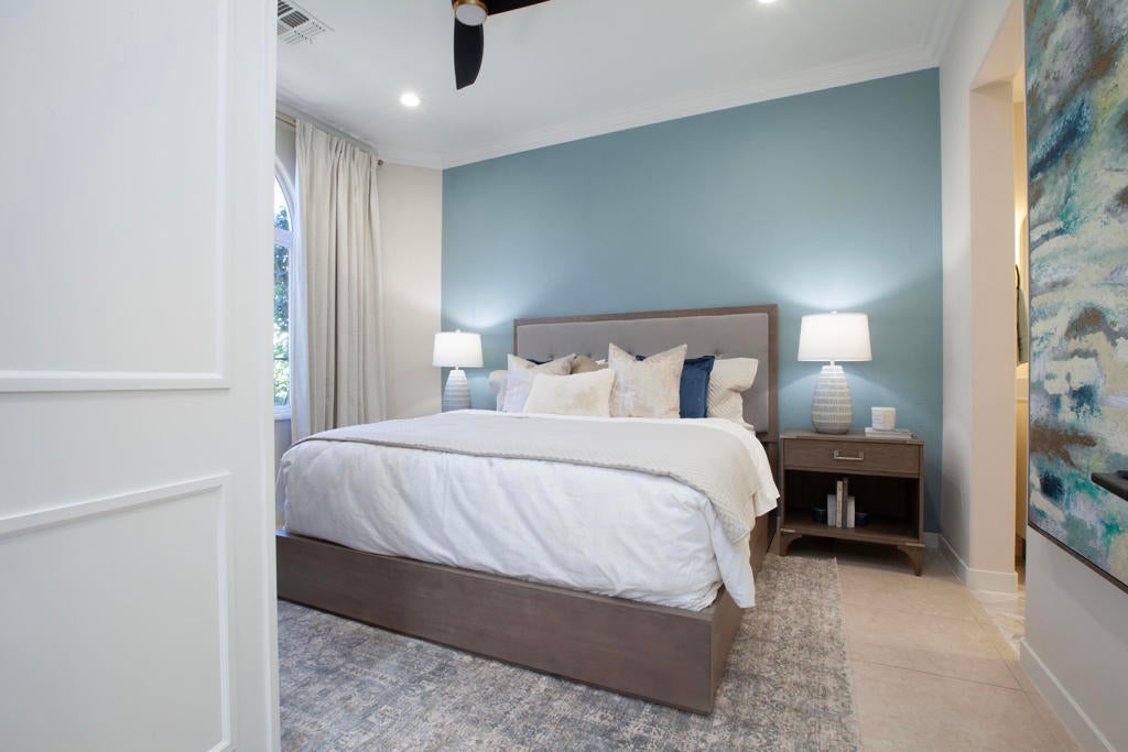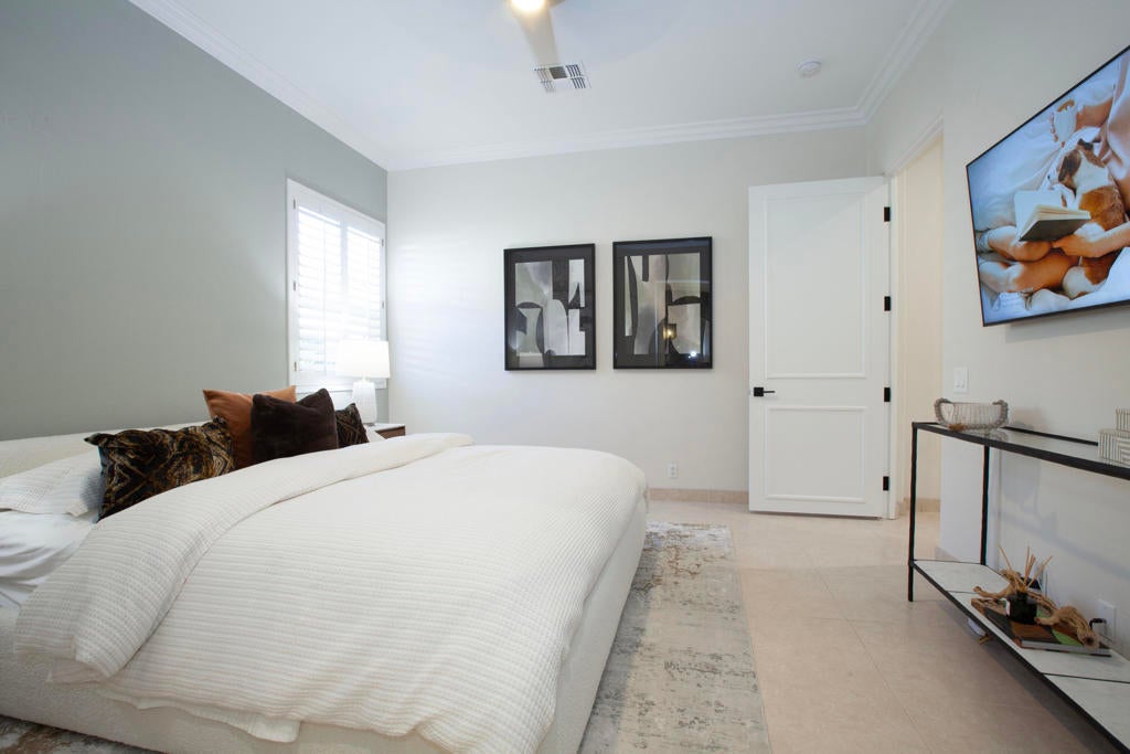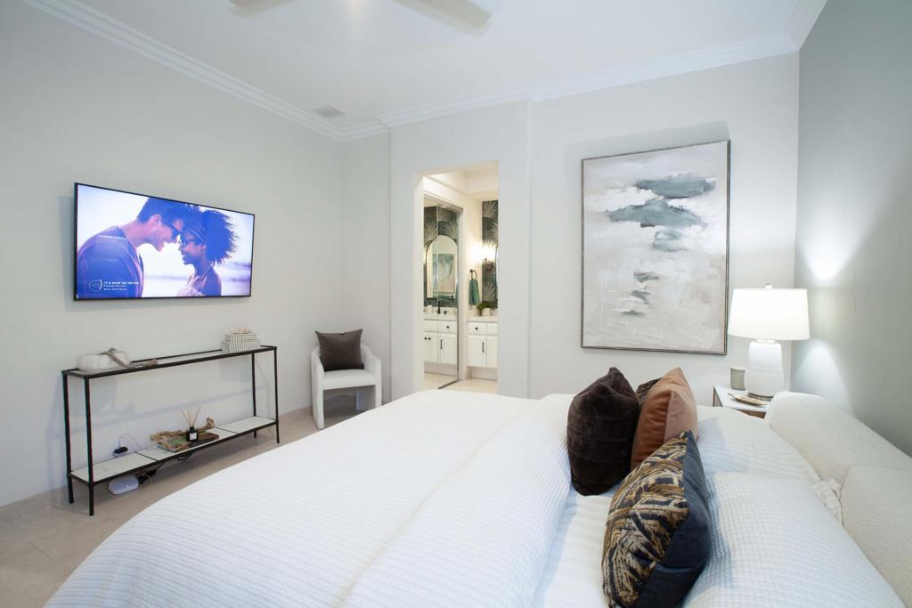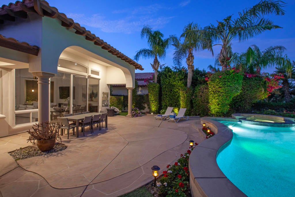 Wow....Turnkey furnished waterfront Encanto 1 that was extensively remodeled in 2024. Sited above the 13th & 14th holes, lakes and waterfall of the Jones Course, this home offers a tranquil setting for seasonal residents or year-round occupancy. Collaborating with Haus Of Design, the home offers newer exterior and interior paint; re-envisioned great room with fireplace re-location creating a dramatic horizontal firewall with media niche, added an adjacent custom bar with quartz counters nearby; fluted linear wood trim at quartz center island and quartz waterfall at peninsula. Additionally, the chef's kitchen boasts newer industrial grade gas range, newer dishwasher, discrete microwave, refinished millwork and newer pulls, quartz counters, custom lighting and views of the pool, lake and grounds. Elegant powder room with new vanity sink, touchier lighting and newer toilet; guest bedroom 1 with raised panel double doors, elegant window coverings and an enlarged bath with newer vanity, quartz counter, Sienna Hexagon marble flooring and ultra-custom closet; private primary suite overlooks private courtyard - here you'll find custom window coverings, custom light/fan, raised panel doors, double moldings -steps away, a primary bath with newer shower enclosure, mitered glass, all new hard surfaces, soft close cabinets, custom mirrors and lighting, elegant soaking tub with custom hardware, spacious main closet with organizers; 3rd guest suite with shutters, molding, raised panel door, newer shower floor, newer vanity, sink, black hardware, mitered glass, private commode, custom mirror and elegant wall paper accent; bonus room overlooking private patio with silhouette window coverings, new queen size sofa pullout, desk area and custom fan/light; laundry area with custom quartz counter, newer Samsung washer & dryer; two-car garage with golf cart garage; poolside you'll find a covered outdoor living space, custom BBQ cooking station, outdoor speakers, elegant infinity edge pool with raised spa, mature landscaping and one of the most tranquil and elegant views you'll find in all of Rancho La Quinta. This home is ideal as the rear grounds receive ample seasonal sun, but also shade during the Spring and necessary shade during the summer. Due to the curvature of Mission Drive West, the home's driveway is massive and can easily accommodate 6-8 parked cars. Fresh, clean and easy - owners have done all the work for you. Turnkey furnished and ready for move-in!