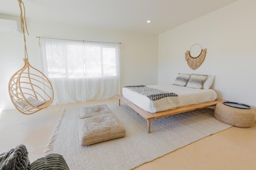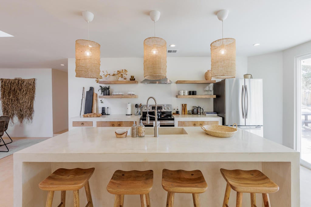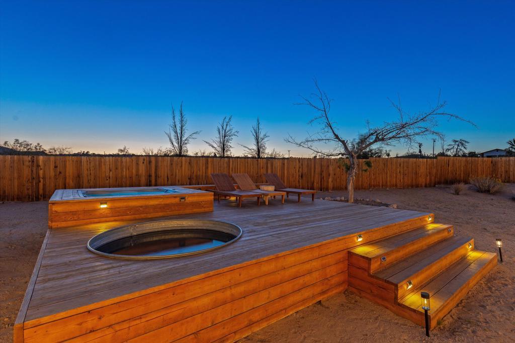 Tucked back from the road just enough, this thoughtfully updated and peaceful Joshua Tree retreat offers a perfect balance of privacy and style. Featuring beautifully finished concrete floors, an open-concept living space, a well-appointed kitchen with large island, and a sun-filled living room with soaring ceilings, skylight, and brick fireplace. The primary bedroom suite is a true retreat, complete with a large soaking tub and striking walk-in shower. Two spacious guest bedrooms and beautiful baths offer plenty of space for visitors to relax and unwind. Attention to detail shines throughout the design of this home, which presents a cohesive and inviting aesthetic. Spanning two lots totaling 2.33 acres (additional APN included in sale) and boasting a sundeck with jacuzzi, refreshing stock-tank pool, mature shade trees, and a detached 2-car garage, this property provides ample space and privacy for all of your indoor and outdoor activities. Take in the sunrise and mountain views from the front porch swings, and enjoy sunsets and stargazing around the fire in the private backyard. Currently operating as a popular short-term rental, this home is an ideal opportunity for a full-time residence, second home, or investment property.