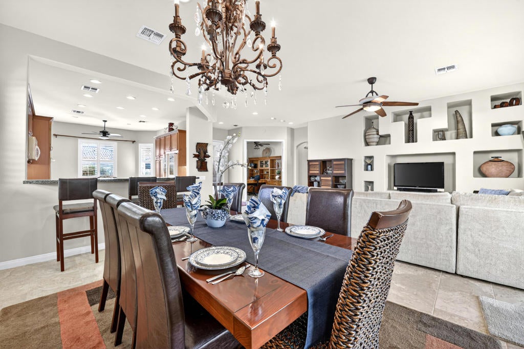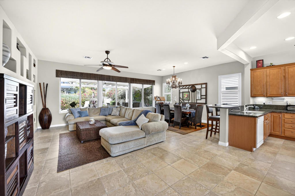 Located in the desirable 55+ community of Sun City Shadow Hills, this beautifully maintained San Benito floor plan offers 2,147 sq. ft. of stylish and comfortable living. The home features a charming front courtyard with a stone fountain and pavers across the entire front. Inside, the open living and dining area showcases tile flooring, abundant natural light, and a sliding glass door leading to the backyard. The kitchen includes granite slab countertops, extensive cabinetry, bay windows, and a cozy breakfast nook with plantation shutters. A versatile den/office with a skylight and a bonus room with tile flooring provide additional space for work or hobbies. The primary suite features laminate flooring, backyard access, an updated en suite bath, and two walk-in closets. The guest bedroom offers cozy carpet and sits next to the guest bath. Both bathrooms include grab bars for added comfort. Additional highlights include a convenient golf cart garage for easy access to the community's amenities. Step outside to enjoy a spacious 9,000+ sq. ft. lot with extended concrete patios, a covered area with ceiling fans, and low-maintenance landscaping, perfect for relaxing or entertaining. Located within Sun City Shadow Hills, residents enjoy access to two golf courses, clubhouses, fitness centers, pools, pickleball and tennis courts, and a variety of social clubs and activities--offering a vibrant and active desert lifestyle.