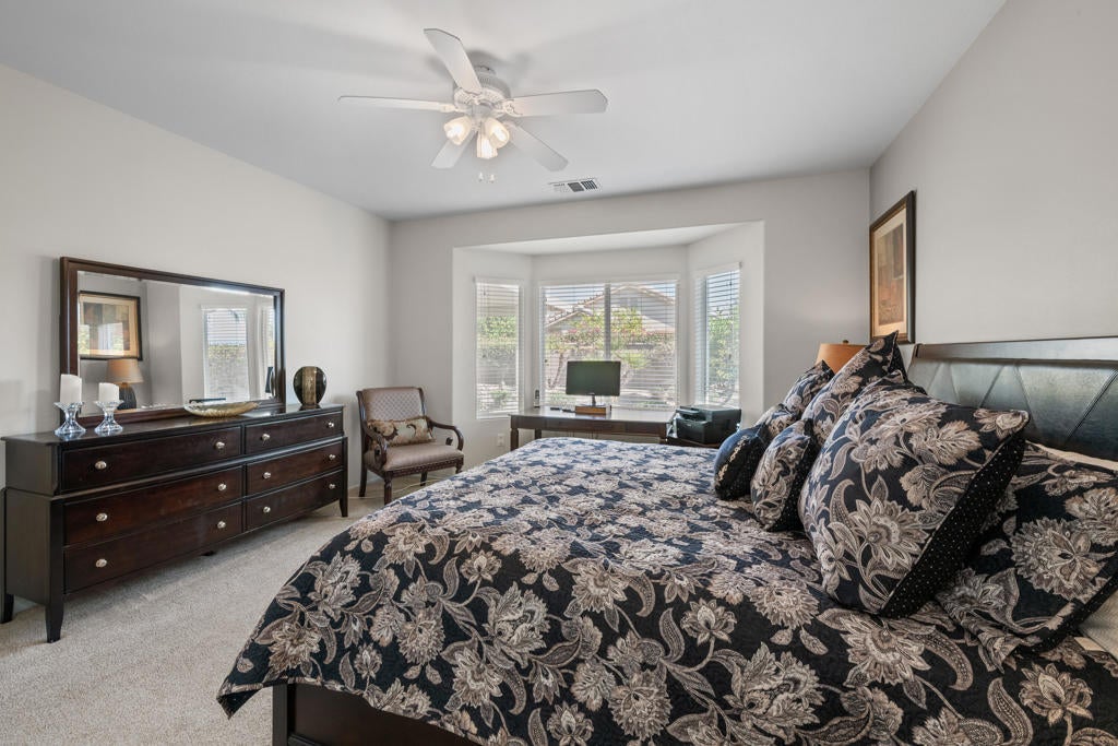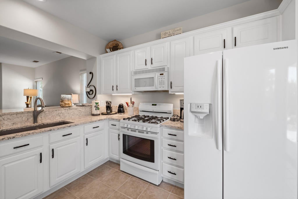 WOW! Peak Season TURNKEY 55+ Sun City Palm Desert and Golf Cart. Available now 2025-2026. 4 Month minimum. Beautifully decorated and completely turnkey, including sports equipment & Golf Cart. King bed & TV in Primary, single vanity, step in shower and walk-in closet. Queen bed in guest room, just off guest bath. Granite slab kitchen with all the comforts of home. Extended covered patio & sun deck is nicely furnished with BBQ faces north with plenty of sun exposure. Located ion a quiet cul-de-sac with great neighbors. Walk-to community pool/spa, near Varner, Stater Bros exit gates.