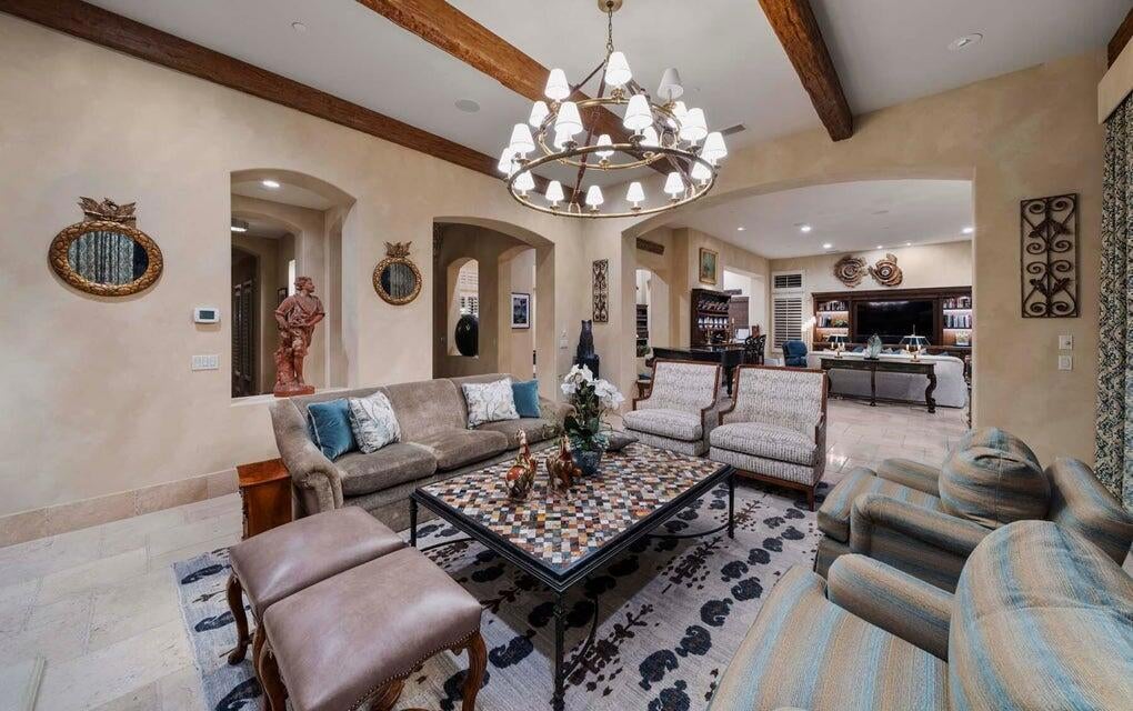 This exceptional Plan 923 home in the prestigious Toscana Country Club offers breathtaking, unobstructed western views of the desert mountains and the iconic Jack Nicklaus Signature Golf Course. Updated just four years ago, this stunning residence features a host of luxurious improvements including a state-of-the-art AV and electric system, fresh paint, new countertops, and various other high-end enhancements. Inside, the home features a charming layout with textured walls and stunning wood beams across the ceiling, adding warmth and character to the space. The gourmet kitchen is a true showpiece, with uniquely blue cabinetry and elegant white and grey quartzite countertops. The spacious primary suite offers a serene retreat with a large sitting area and a lavish en-suite bath, while the versatile guest spaces, including a guest house and additional rooms in the main home, provide ultimate comfort for family and friends. With upgraded AV and electric systems throughout, this home is designed for modern living and offers a seamless blend of luxury and practicality. Whether you're enjoying the spectacular views or relaxing in the beautifully appointed spaces, this remarkable residence provides the perfect setting for both comfort and style.