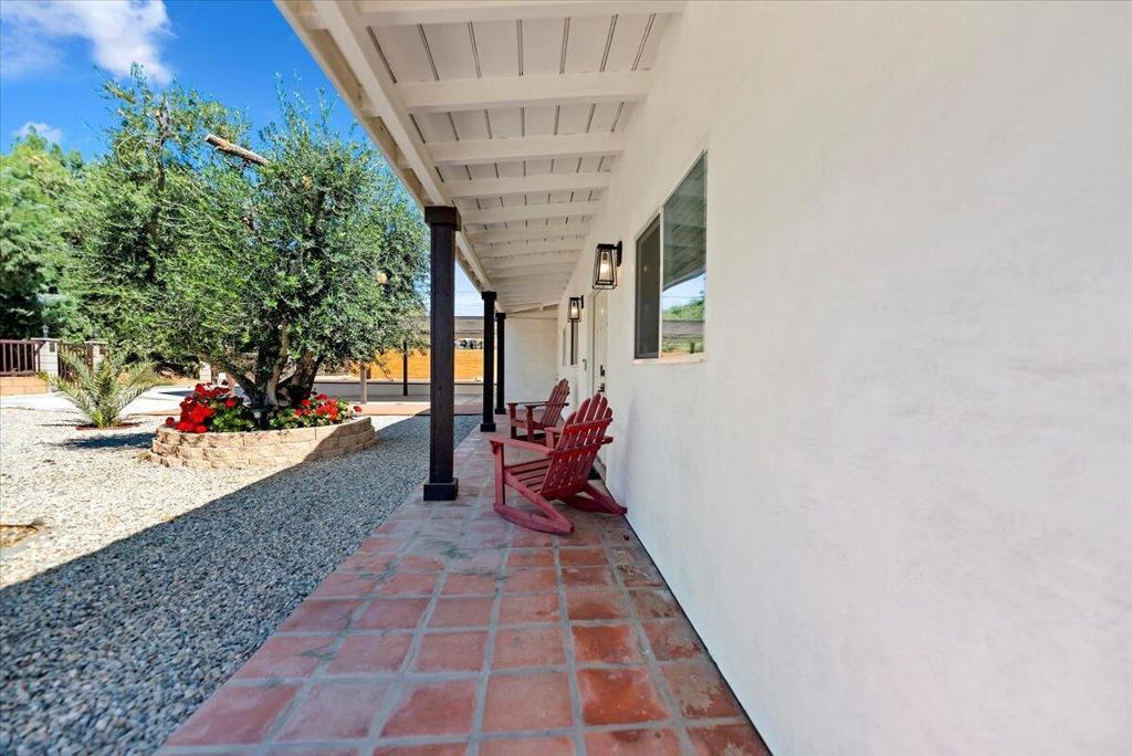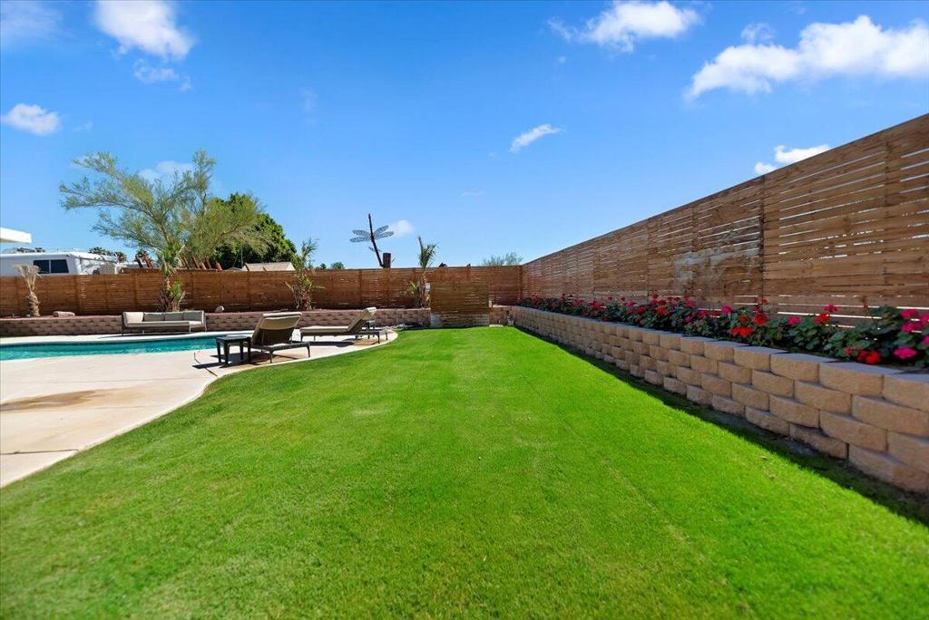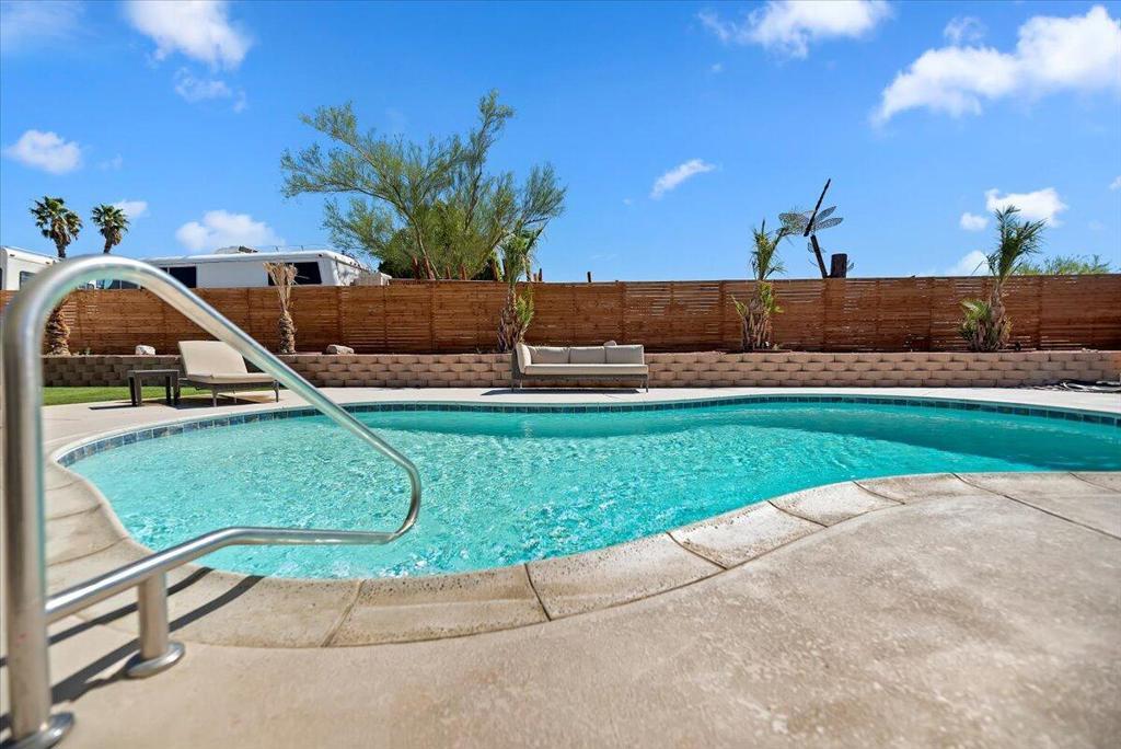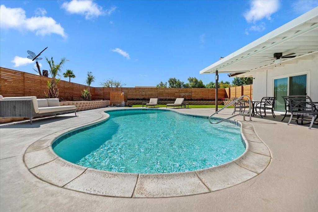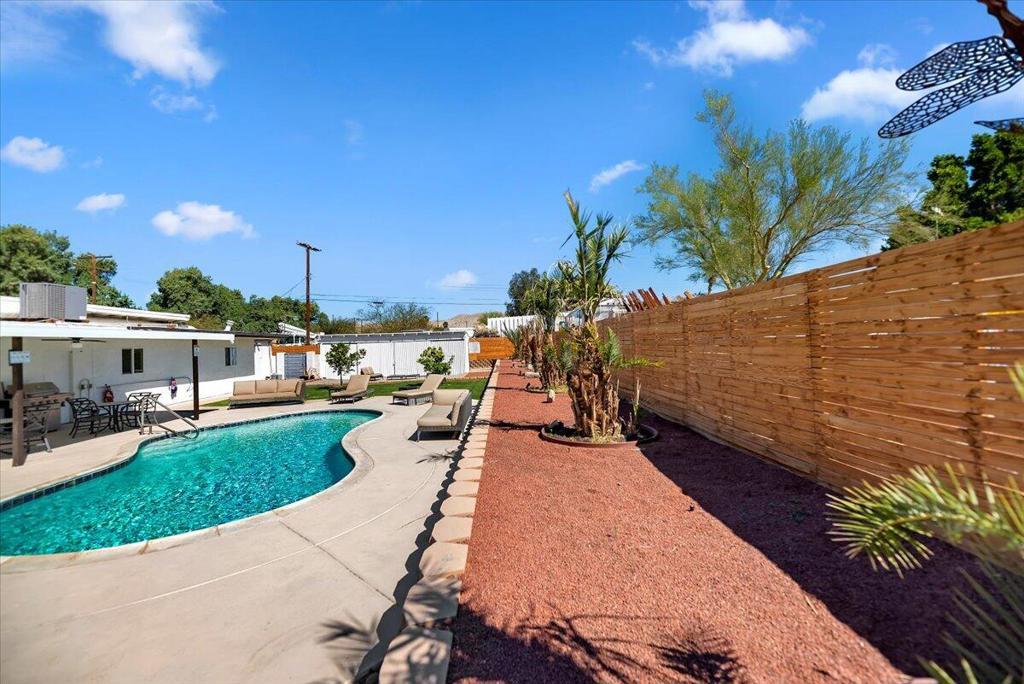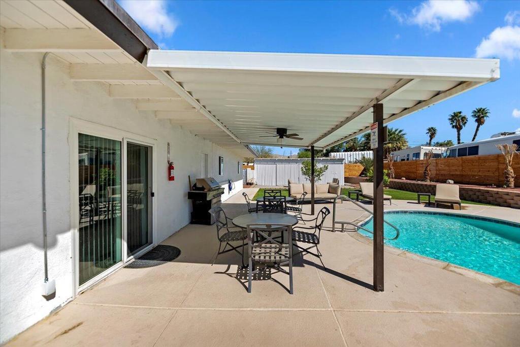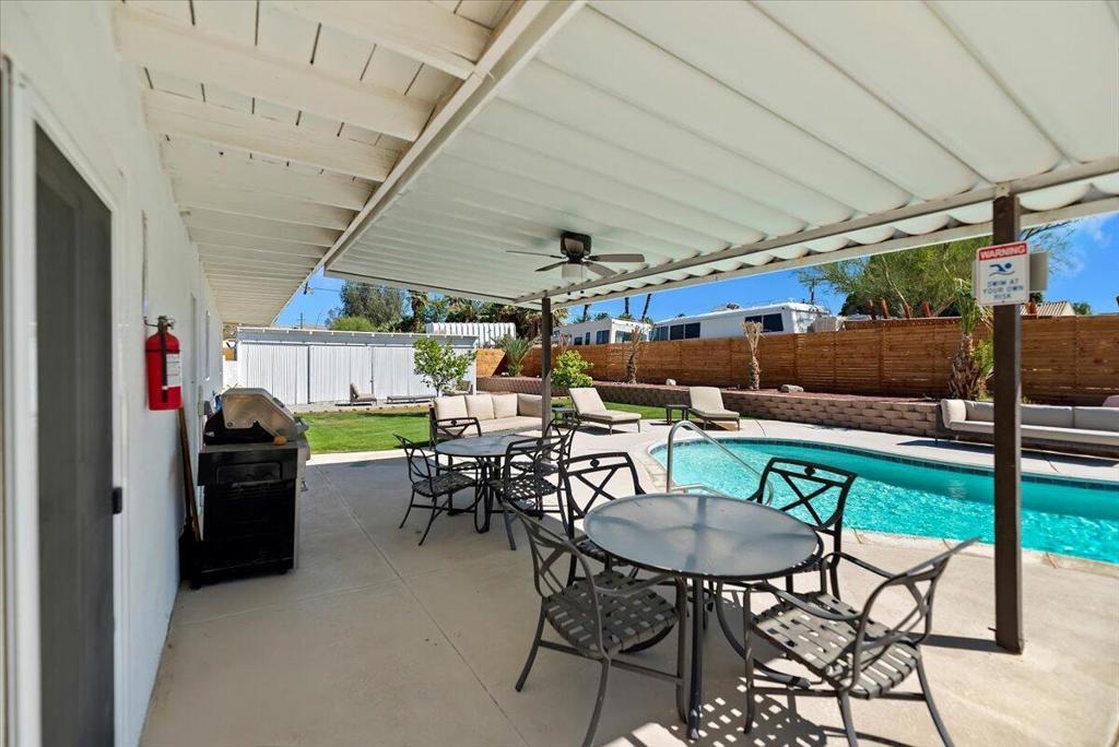 Discover this fantastic mid-century home on a spacious corner lot with a large, covered rear patio and sparkling pool - perfect for enjoying the California sunshine! Enjoy the convenience of a gated driveway leading to a covered carport, plus generous RV parking. Inside, you'll find impressive architectural details like soaring 10+ foot ceilings in the entryway and living room and a unique dual fireplace connecting to the cozy family room, showcasing exposed ceiling beams. The home features stylish wood-like tile flooring, a well-appointed kitchen with granite countertops, a large walk-in pantry, and ceiling fans in every bedroom. The backyard is an entertainer's dream, offering a refreshing pool and a covered patio ideal for summer gatherings. This property is perfect for Airbnb! Located just a short drive from the arena, casino, polo grounds (home of the Coachella Music Fest & Stagecoach), various shopping and dining options, and only minutes from downtown Palm Springs, this is a must-see!