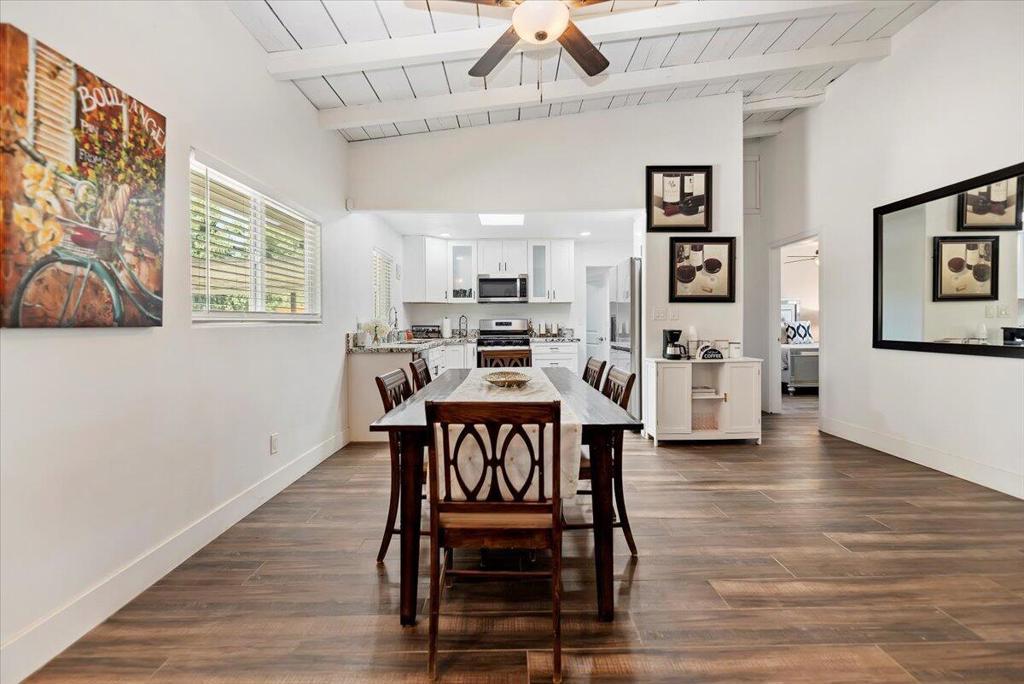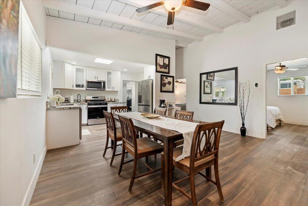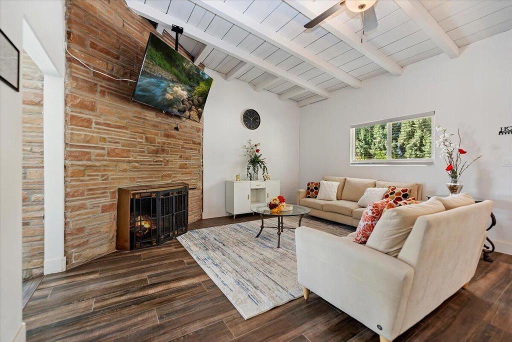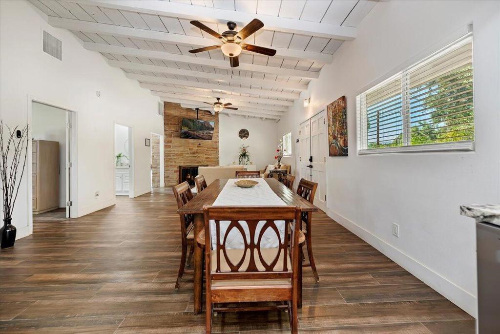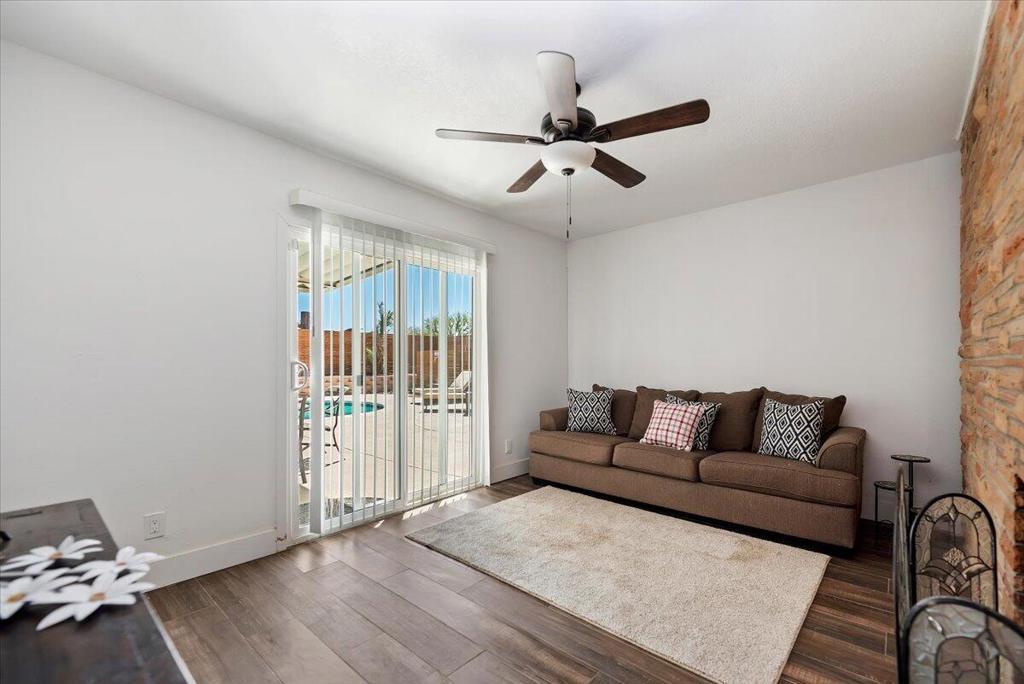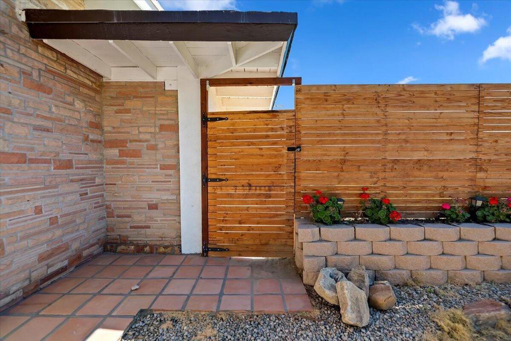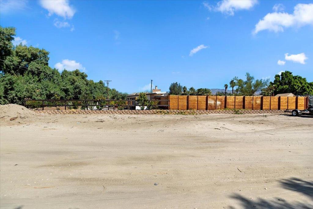 Discover this fantastic mid-century home on a spacious corner lot with a large, covered rear patio and sparkling pool - perfect for enjoying the California sunshine! Enjoy the convenience of a gated driveway leading to a covered carport, plus generous RV parking. Inside, you'll find impressive architectural details like soaring 10+ foot ceilings in the entryway and living room and a unique dual fireplace connecting to the cozy family room, showcasing exposed ceiling beams. The home features stylish wood-like tile flooring, a well-appointed kitchen with granite countertops, a large walk-in pantry, and ceiling fans in every bedroom. The backyard is an entertainer's dream, offering a refreshing pool and a covered patio ideal for summer gatherings. This property is perfect for Airbnb! Located just a short drive from the arena, casino, polo grounds (home of the Coachella Music Fest & Stagecoach), various shopping and dining options, and only minutes from downtown Palm Springs, this is a must-see!