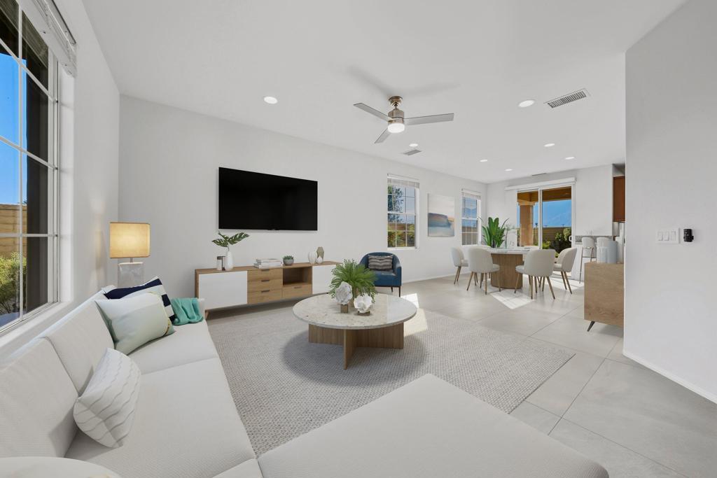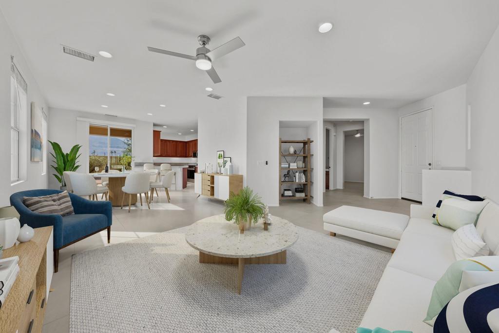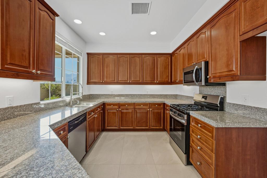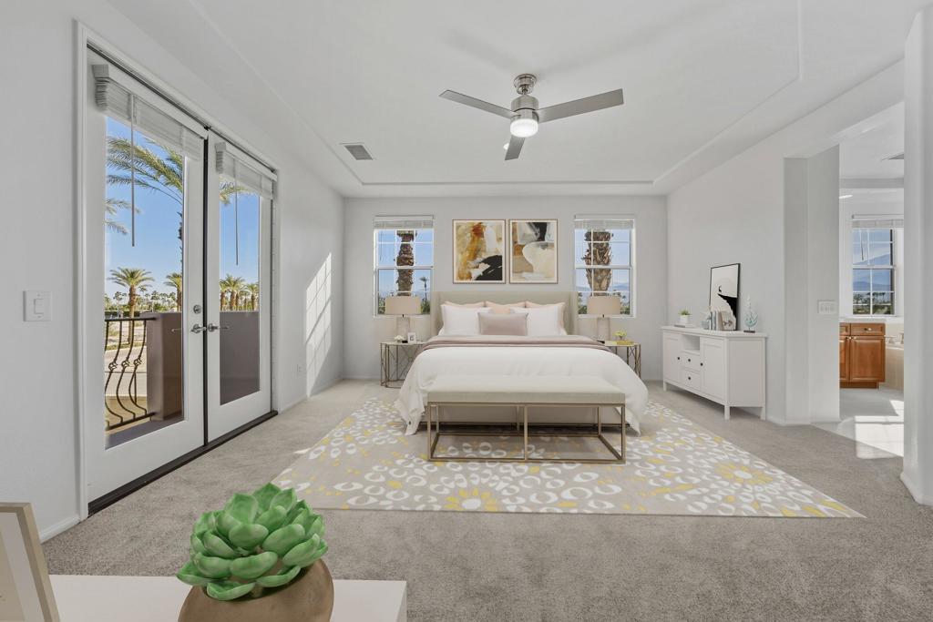 New price improvement-Exceptional value! Beautifully updated single-family home in a prime location within the gated community of Campanile in Cathedral City is now available! This home offers over 2,000 sq. ft. of living space with 3 bedrooms, 3 baths, and an additional spacious bonus room that can be used as a den or a 4th bedroom. Recent upgrades include new tile floors, new carpet in the bedrooms, freshly painted exterior and interior of the home, new lighting, ceiling fans, window treatments, and a new gas stove. Enjoy gorgeous mountain views throughout most of the home, especially from the great room, and the primary bedroom and bath. This is one of the select few properties in the community that has its own private driveway for added convenience. Step into the chef's kitchen featuring granite counters, stainless steel appliances, and refaced cabinets. The large primary suite boasts dual vanities, a separate shower and tub, a generous walk-in-closet, and a private balcony to take in the serene views. Enjoy an open-concept layout with abundant natural light, high ceilings, a separate laundry area, and a spacious two-car garage. Outside awaits a good-sized backyard with a covered patio area and low-maintenance desert landscaping. Residents of Campanile enjoy resort-style amenities, including a community pool and spa, clubhouse, fitness center, parks and low HOA dues. Conveniently located near shopping, dining, and schools, and just a short drive to downtown Palm Springs. This home feels like new-call today for your private showing! Home has been virtually staged.