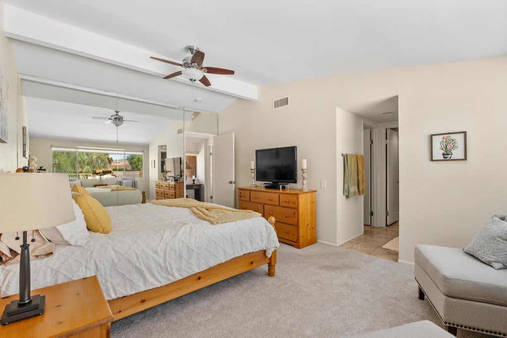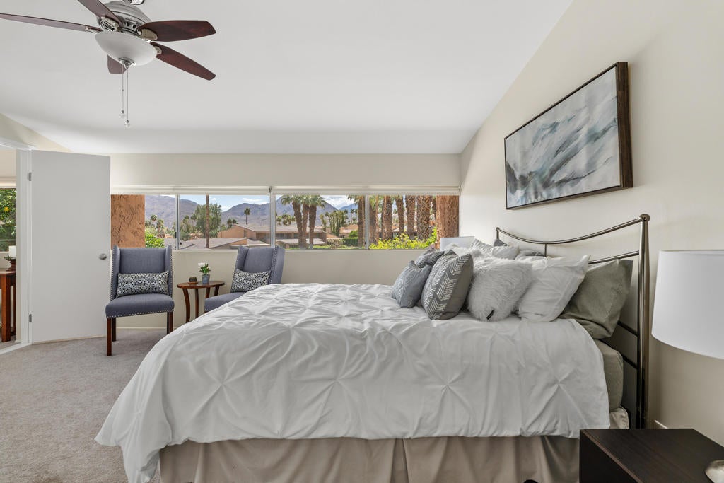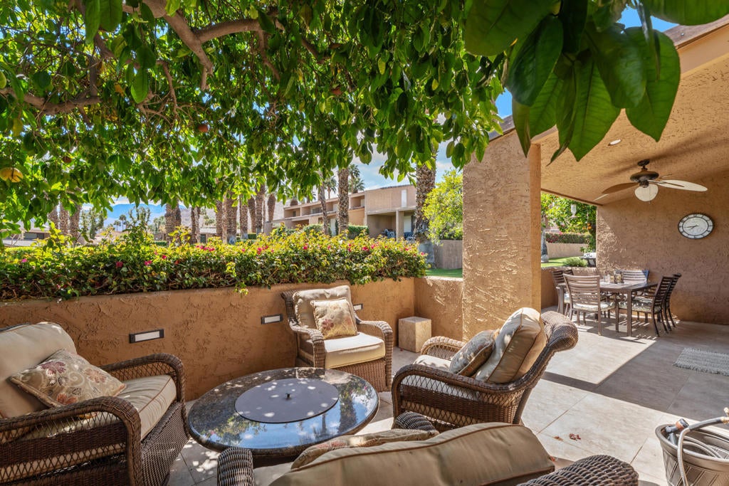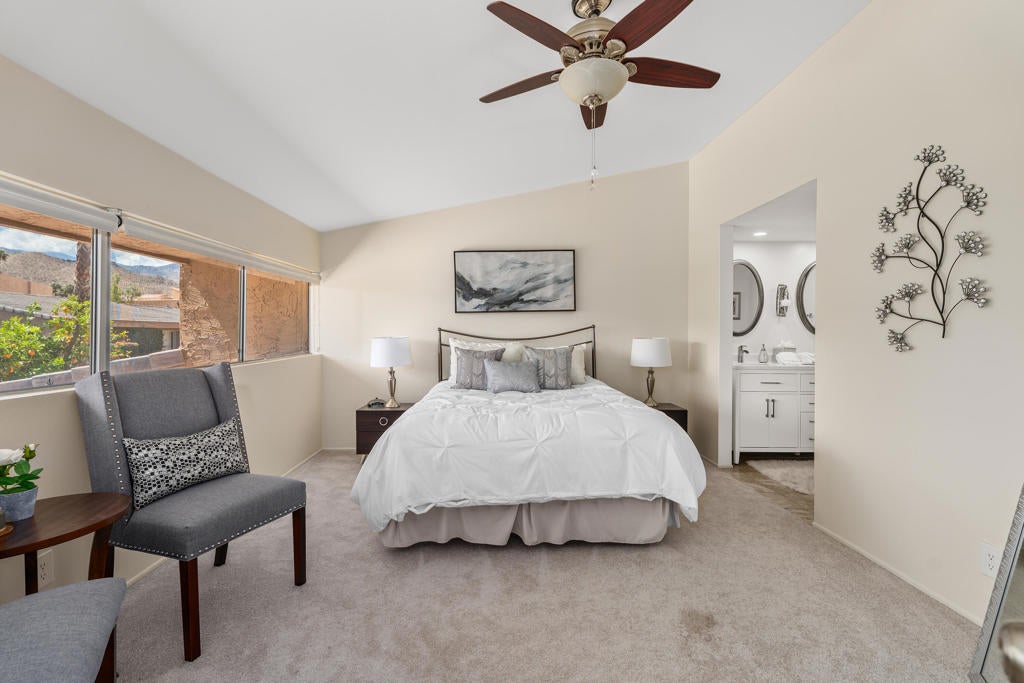 This spacious 4 bedroom , 4 bath Ironwood Country Club Garden Villa has been meticulously maintained and is sold turnkey, This home has been remodeled and has been furnished beautifully. There is a main level bedroom and bath suite that includes a 4th bedroom or multi-use room with a private entrance. The private setting offers mountain views and is close to the community pool. This Villa is ready for the new owner to move in and enjoy the desert lifestyle. It has been rented during the season and is an excellent investment opportunity. Ironwood Country Club has memberships available by application and sponsorship and offers two golf courses, two practice ranges, a fitness center, pickleball and tennis courts ,a beautiful club house with fine and casual dining \ and social events of all kinds for its members. Tours of the club are available through the membership director.