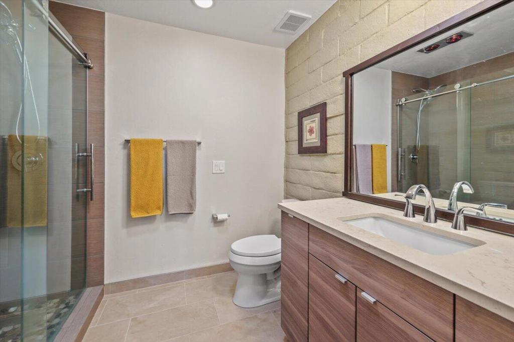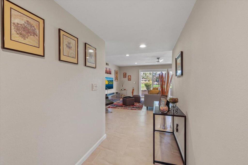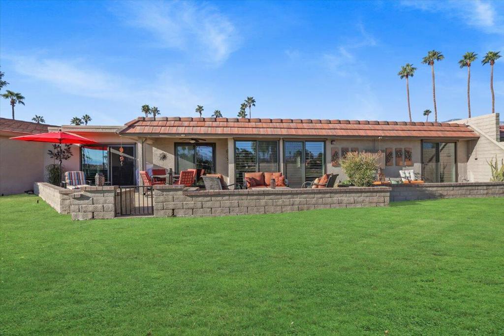 Completely reimagined and impeccably upgraded, this extensively customized condo offers an outstandinglocation in the heart of Cathedral City's gated Cathedral Canyon Country Club. This single level unit is perfectly located at the end ofan intimate cul-de-sac, steps away from one of many community pools, and a stone's throw from the Tennis Center and golf clubhouse featuring a regulation length 18 hole course, Direct access to the new CV Link bike path right from within the community. The gated entry courtyard withbeautiful mountain views creates the ideal spot for morning coffee. An expansive wraparound back patioborders the lush fairways of the community's 18-hole golf course and embraces vast vistas of rolling turf anda shimmering lake. Indoors, two bedrooms, two baths, a den with courtyard access, and a custom bonusroom/office that opens to the rear patio are revealed in approximately 1,736 square feet. Walls werereconfigured to create a seamless space that enriches daily living and effortless entertaining. A custom MidCentury-inspired entry door leads to living and dining rooms that frame scenic views through windows andsliders opening to the patio. Chefs of all skill levels will appreciate an open kitchen with peninsula bar,handsome stained-wood Shaker cabinetry, solid-surface countertops, a full tile backsplash and preferredstainless steel appliances. Both bedrooms provide patio access, and the primary suite hosts frosted-glasswardrobe doors and an ensuite bath with custom walk-in shower. Recessed LED lighting, contemporarylighting fixtures and solar-tube skylights illuminate the home, while custom paint, designer floor tile, ceilingfans and plantation shutters lend upscale flair. Upgraded dual-paned sliders throughout, newer HVAC, a split AC unit inthe bonus room, and a newer roof with recent re-coat enhance energy efficiency. Outdoors, the patio andcourtyard decking was resurfaced to look like stone. The Cathedral Canyon Tennis Club and clubhouse aresteps away, and the gated enclave features countless pools, parks and pathways. This residence isperfect as a lock-and-go vacation getaway and a wonderful year-round home. Downtown Cathedral City'sshops and restaurants, Palm Springs, Rancho Mirage and Palm Desert are all within easy reach, and milesof hiking trails, scenic parks and even a surf club are moments​​‌​​​​‌​​‌‌​​‌​​​‌‌​​​​​​‌‌​‌‌​​‌​​​‌‌​ away