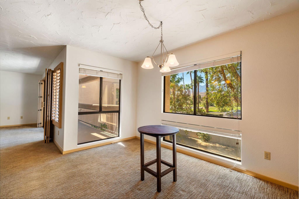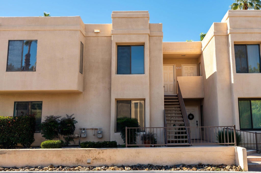 Situated within the beautifully maintained community of Canyon Shores, this inviting two-bedroom, two-bath residence offers comfort, style, and an exceptional desert lifestyle -- with the added advantage of Fee Land, meaning you own the land.Perfectly positioned next to the CV Link, the property is surrounded by tranquil lakes, flowing streams, and lush landscaping, creating a serene resort-like setting. This upper-level unit features a spacious dining area, in-unit laundry, and a covered balcony that captures breathtaking mountain views.The community offers an impressive array of amenities, including five pools, seven hot tubs, four tennis courts, pickleball courts, saunas, a fitness center, and a beautifully appointed clubhouse with fireplace and community room.Residents enjoy a secure, pet-friendly environment, ideal for peaceful walks and outdoor enjoyment. With a 30-day rental minimum, this property also presents an appealing opportunity for seasonal living or investment.Discover the perfect balance of relaxation, recreation, and refined desert living at Canyon Shores.