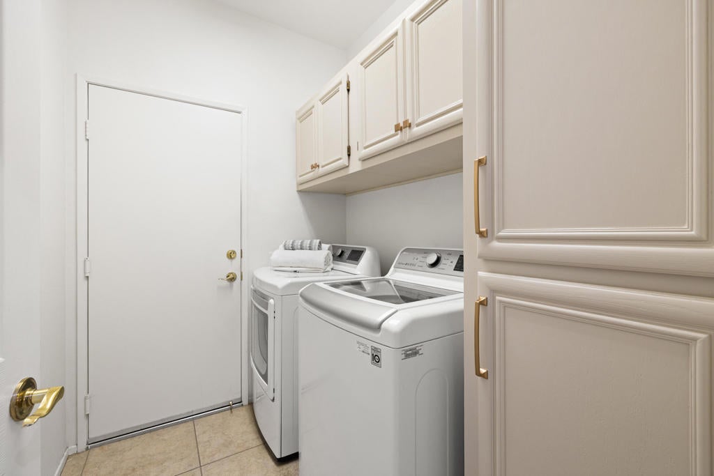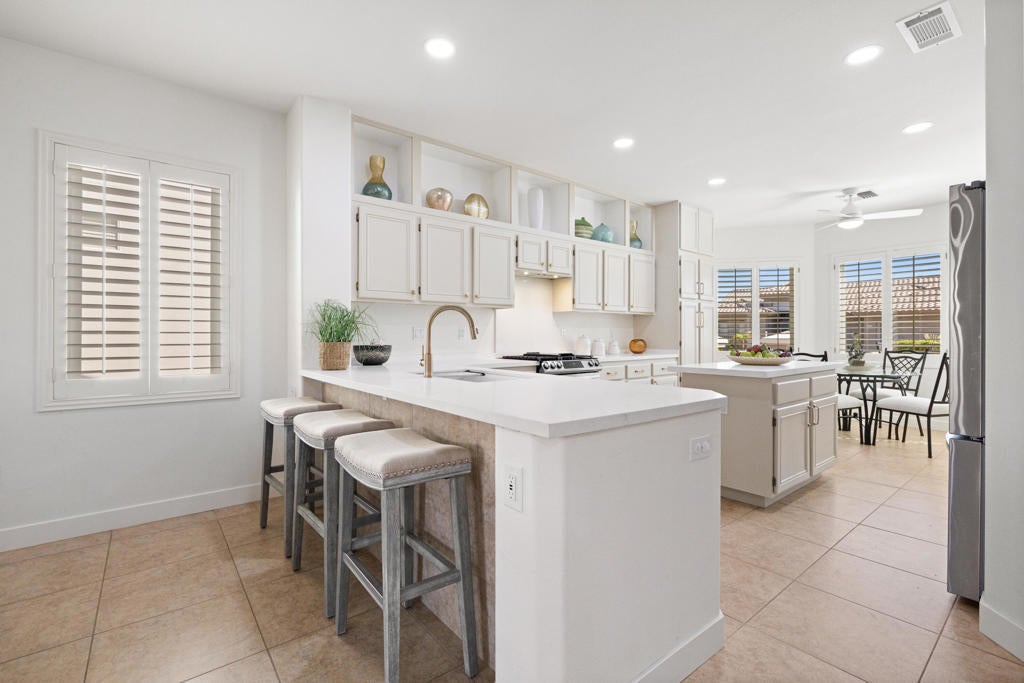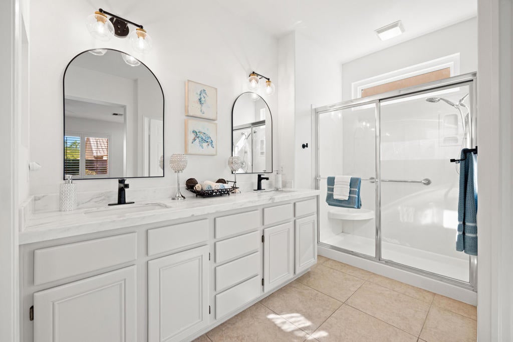 Sun City Palm Desert - Del Webb's Premier 55+ Community. Del Webb's ''Best Bang for Your Buck'' in active adult living! This desirable St. Croix model offers two bedrooms, two baths, a spacious den/office, and an additional hobby or flex room, along with a two-car garage and separate golf cart bay. Recent upgrades include a brand-new mini-split in the garage, updated HVAC, and all-new windows (2025). The home boasts wonderful curb appeal with fresh exterior paint, lush desert landscaping, and a gated courtyard perfect for enjoying your morning coffee. Inside, plantation shutters, ceiling fans, and 20-inch tile flooring enhance the light, open layout. The great room offers recessed lighting, a built-in media center, and sliding doors that lead to the extended covered patio, ideal for relaxing or entertaining outdoors. The kitchen features beautiful white quartz countertops, a flat breakfast bar, and taupe cabinetry accented with brass pulls. A chef's island, coffee bar, stainless steel appliances, gas cooktop, pantry, recessed lighting, and a bay-window dining area complete the space.The primary suite includes a bay window with courtyard views, quartz bathroom counters, dual vanities, painted cabinetry with custom hardware, a stall shower, and a spacious walk-in closet with an organizing system. The guest bedroom is privately located on the opposite side of the home, with a bathroom offering a marble counter, painted cabinet, and tub/shower combo. Additional highlights include a den and hobby room with folding privacy doors, recessed lighting, new fan/lights, a pocket door, and direct garage access. The laundry room includes upper cabinets, a linen closet, and a washer and dryer. The garage features ample storage cabinets, a workbench, mini-split AC, and access to the home's AC equipment. The extended covered patio is perfect for outdoor dining, entertaining, or simply enjoying the tranquil desert ambiance. ''Buy where you love to play--Sun City Palm Desert!''''