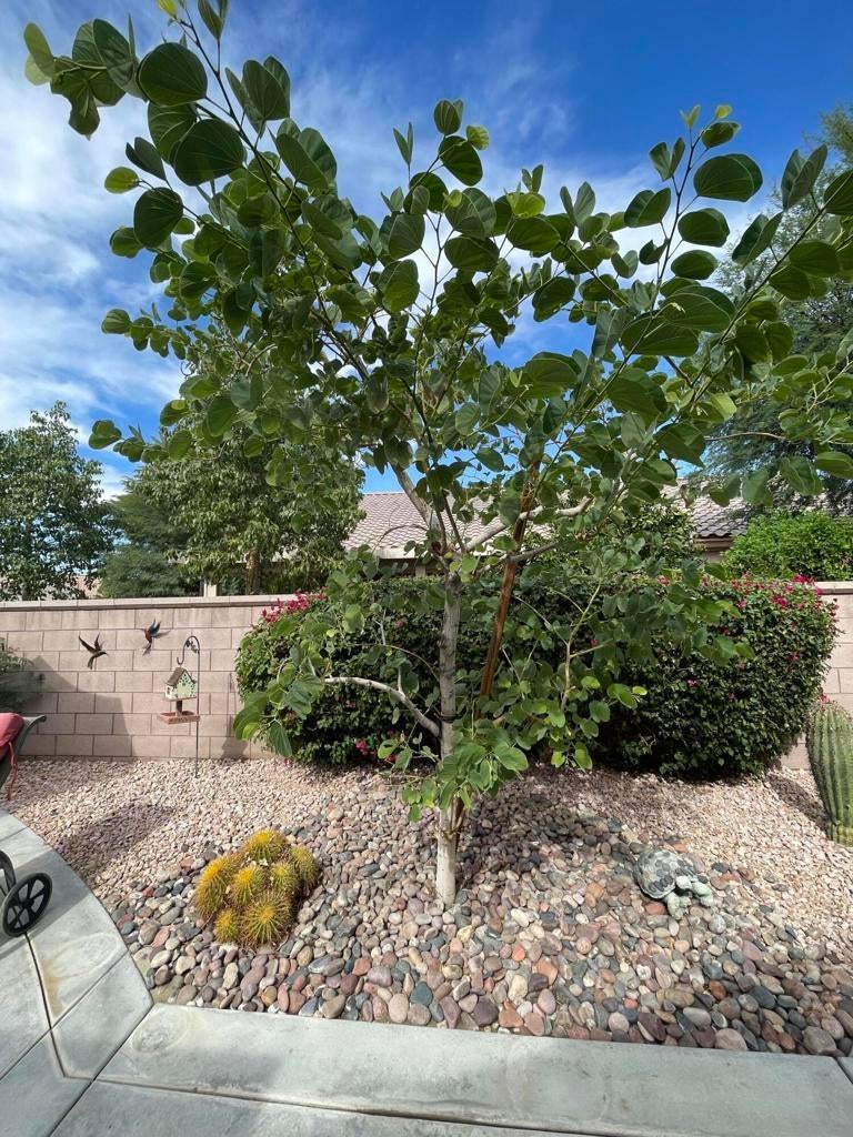 Fabulous Sun City Palm Desert: Outstanding Barbados two-bedroom, two-bath. Turnkey Furnished plus Golf Cart. Highly Upgraded: Custom interior paint, lead glass front door, faux electric fireplace/ Large TV in Living Room, new carpet in living room Table with Six chairs in Dining Area. Stainless Appliances, Granite Kitchen Counters, Electric King Bed in Primary, Murphy Bed and desk with Chair in Guest Bedroom, Plantation Shutters, Bay Window in Primary, Tree Palm trees in front yard, dog friendly artificial turf in rear yard and close to dog park, Alumawood Patio cover, water fountain, furnished patio, citrus trees and a Hong Kong Orchid in rear yard, paved walkway from driveway to rear yard. Large 2- Car Garage. Move-in ready. On a friendly street, must see.