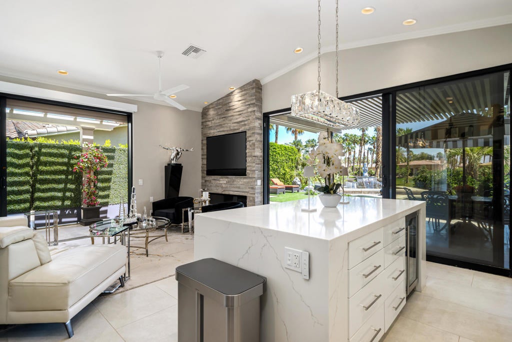 #57 DESERT SHORES RESORTGorgeous interior remodel on contemporary side.Eastern backyard has a large spa with sheer descent falls and fire features!Garage/Great Room-Kitchen/ Retreat with Bathroom.Common area includes clubhouse, pool, spa, fitness, tennis, pickleball.