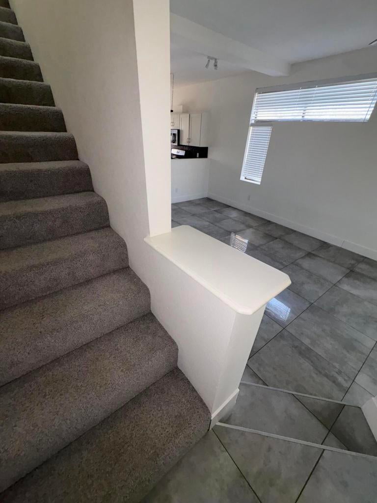 Newly remodeled end-unit townhouse with mountain views in Palm Springs! Bright and move-in ready, this two-story home features an open living/dining/eat-in kitchen, a laundry room with half bath, and a private patio off the kitchen. Upstairs offers vaulted ceilings, a primary suite with walk-in shower and private balcony, plus a guest bedroom and full bath. Updates include new flooring (ceramic tile down, carpet up), modern bath fixtures and vanities, recessed lighting, and three skylights. Small 11-home community with assigned carports, central pool & spa, low HOA fees--and best of all, you own the land. Moments from shops and restaurants on Palm Canyon.