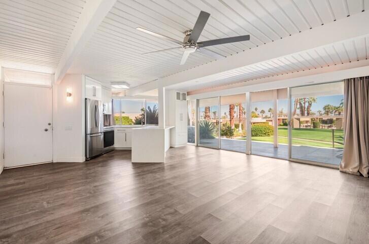 Beautifully updated mid-century condo in the desirable Sandpiper Community of Palm Desert designed by the famous architect William Krisel. This charming 2-bedroom, 2-bathroom end-unit is one of the original William Krisel designs, built in 1959 and seamlessly blending classic architectural elements with modern conveniences! The interior features a spacious and open floor plan with beautiful beamed ceilings, laminate wood-look flooring, and updates throughout. The living room features a wall of windows with 2 sliding glass doors opening to the beautiful luxurious stone tiled patio that enjoys the cool morning sun and is shaded from the hot afternoon sun. The expansive garden, palm tree and mountain views can be enjoyed from both within the open plan living area, and from the beautiful luxurious stone tiled patio area! The remodeled kitchen has quartz counters with bar seating and included stainless steel appliances. Both of the bedrooms are generously sized with the large main suite featuring a private patio area and an updated bathroom with walk in shower. The 2nd bedroom also has a retreat area or office space, and there is an updated hall bathroom for guests and the 2nd bedroom to share. Enjoy the community pool, a common BBQ area, stunning views of the mountains, well manicured community landscaping, and this home comes with private laundry hookups with included washer and dryer, as well as an assigned carport. The HOA fees include Internet Service and an extensive TV channel lineup, as well as sewer, trash services, and water. Conveniently located close to El Paseo, also, this is 1 of 8 units out of the 24 unit community that is located within the locked gated circle for added security! Ready for its next chapter, this home is the perfect place to create lasting memories!